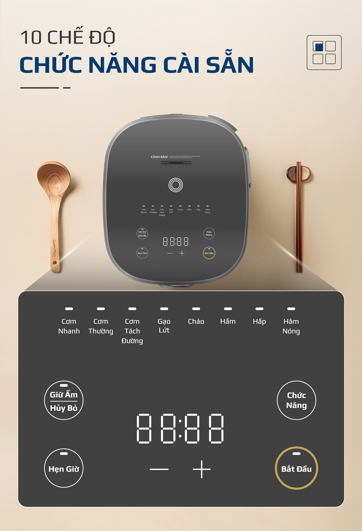 - Ngoài ra, bảng điều khiển cảm ứng tiếng việt dễ dàng sử dụng cho cả người lớn và trẻ nhỏ. Thao tác nấu đơn giản, màn hình hiển thị rõ nét, chính xác đảm bảo cho chiếc nồi cơm luôn hoạt động ổn định.