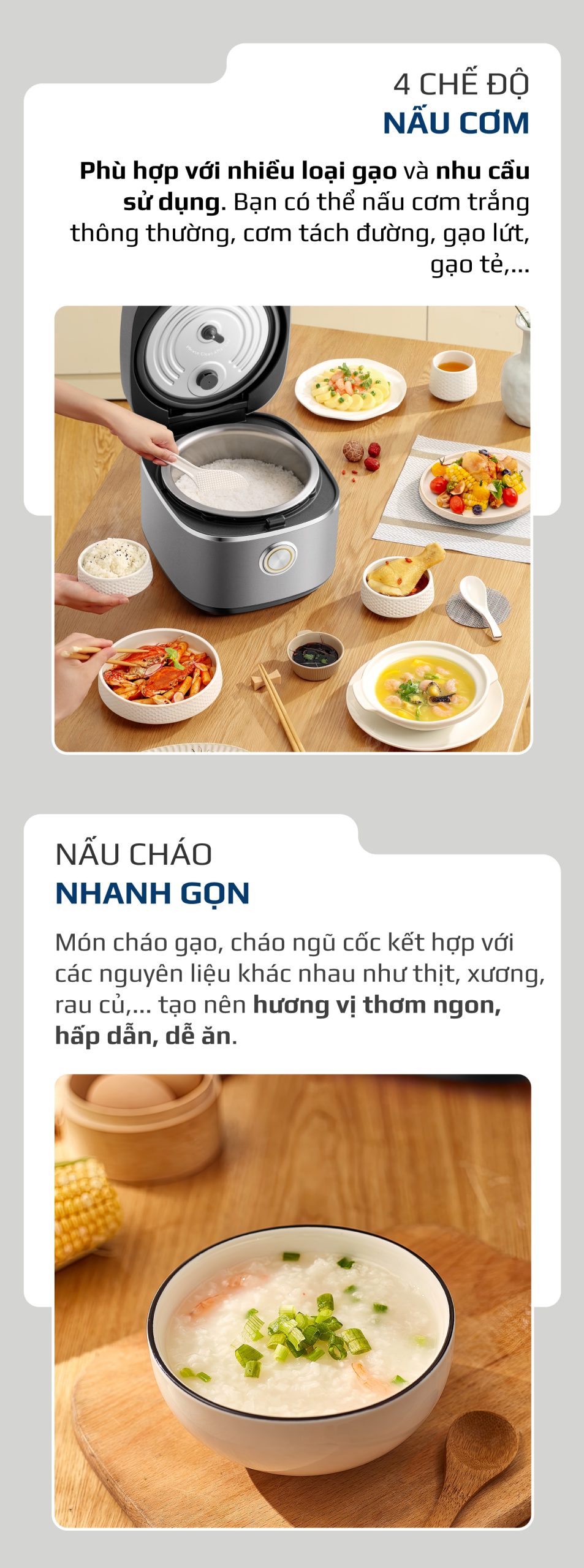 - Có tới 4 chế độ nấu cơm cài đặt sẵn bao gồm: cơm nhanh, cơm thường, cơm tách đường, gạo lứt. Phù hợp với nhiều loại gạo và nhu cầu sử dụng của từng gia đình.