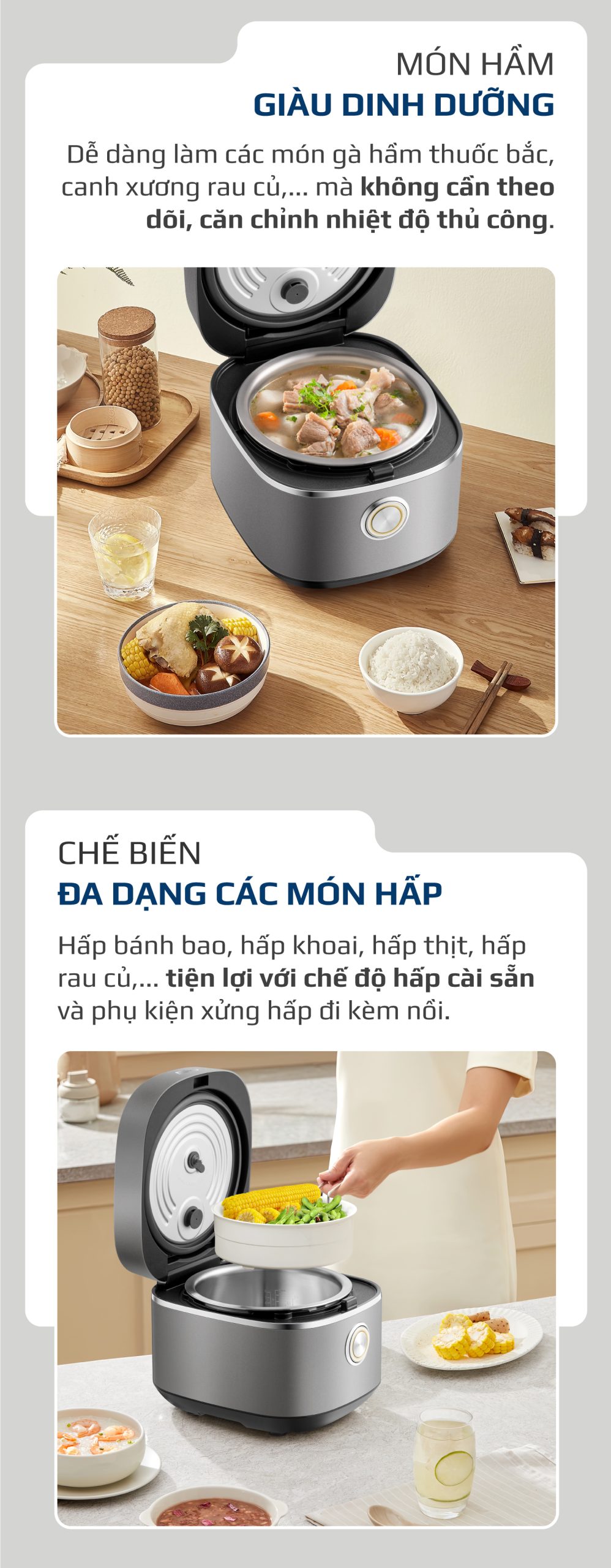 - Nấu món hầm giàu chất dinh dưỡng: dễ dàng làm các món như gà hầm thuốc bắc, canh xương rau củ,… mà không cần theo dõi, căn chỉnh nhiệt độ thủ công.