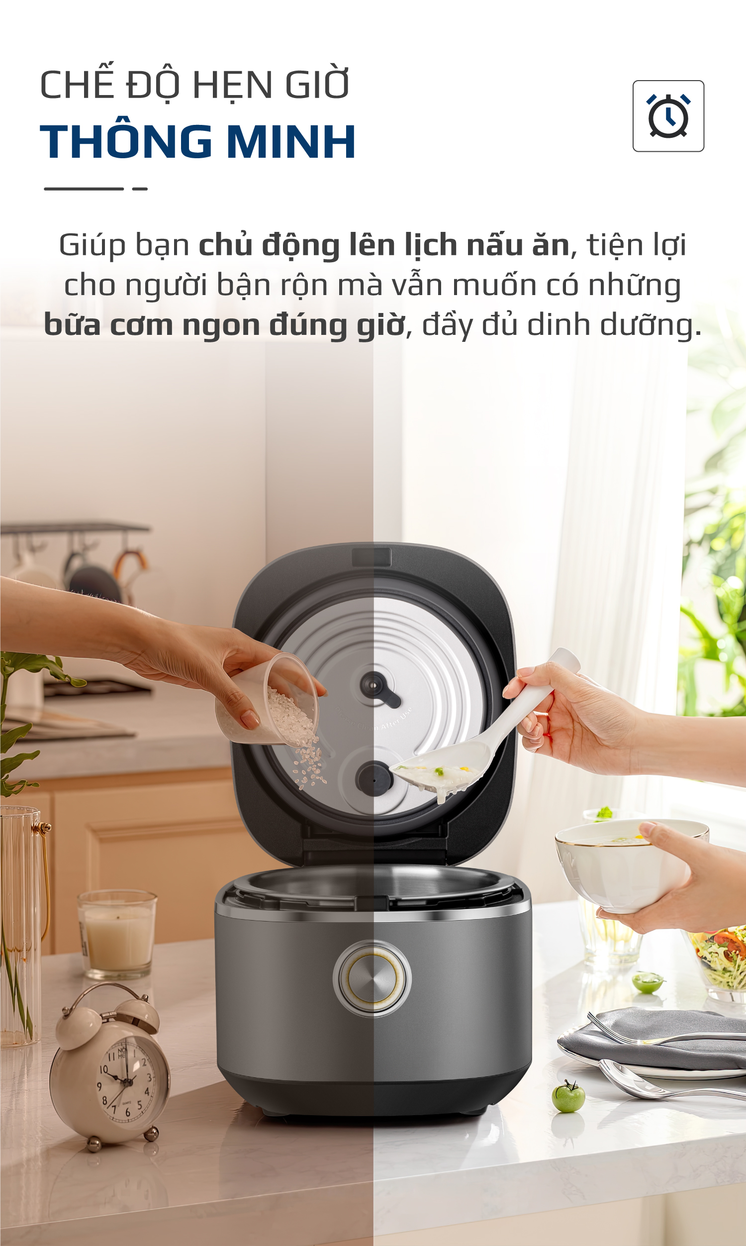 - Chiếc nồi cơm điện thông minh OLIVO RC86 còn được trang bị thêm chức năng “Hẹn Giờ” giúp bạn chủ động trong việc nấu ăn, tiện lợi cho người bận rộn mà vẫn muốn có những bữa cơm gia đình ngon, đúng giờ, đầy đủ dinh dưỡng.