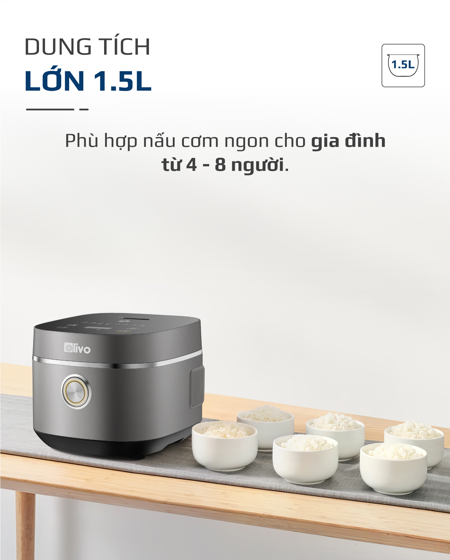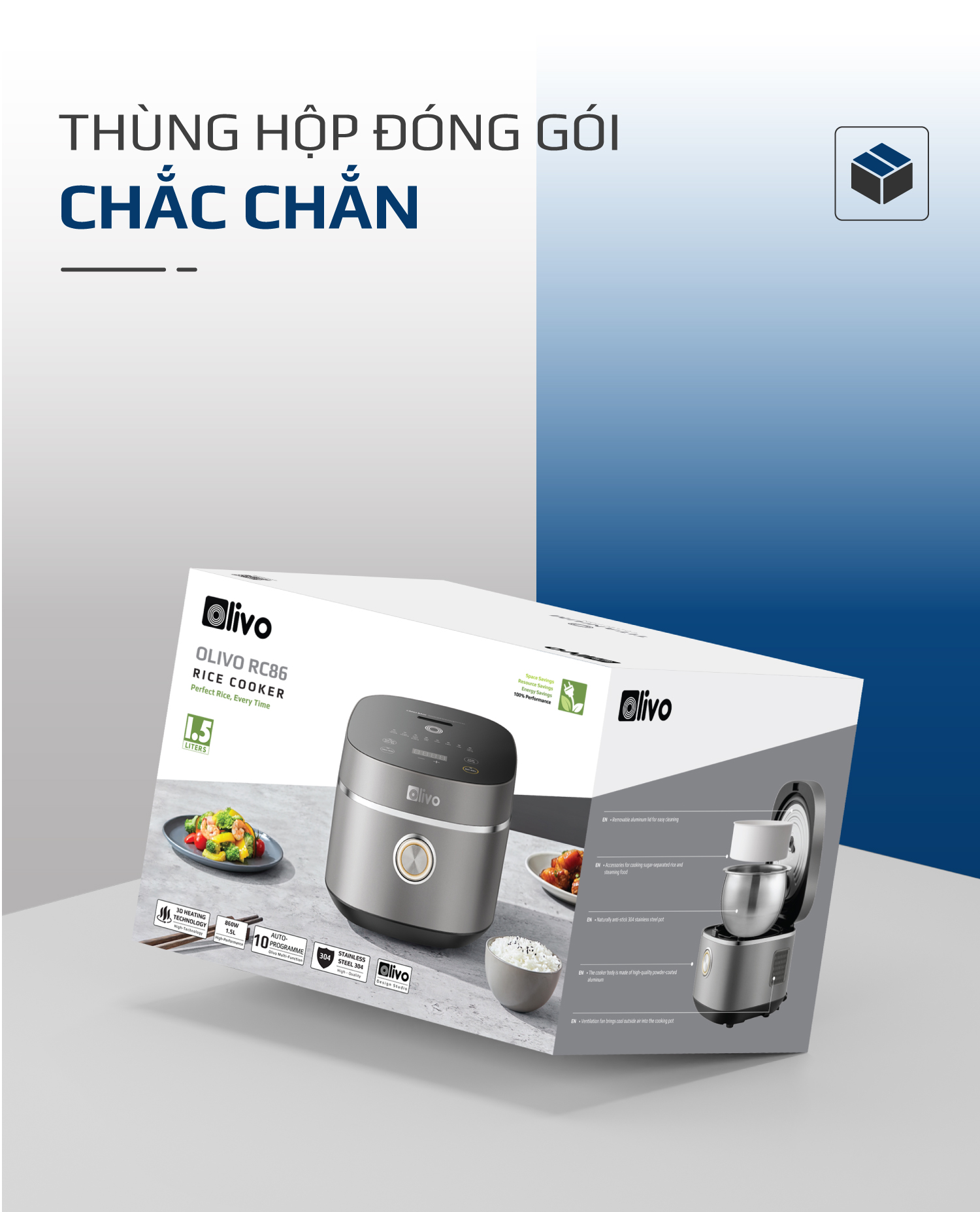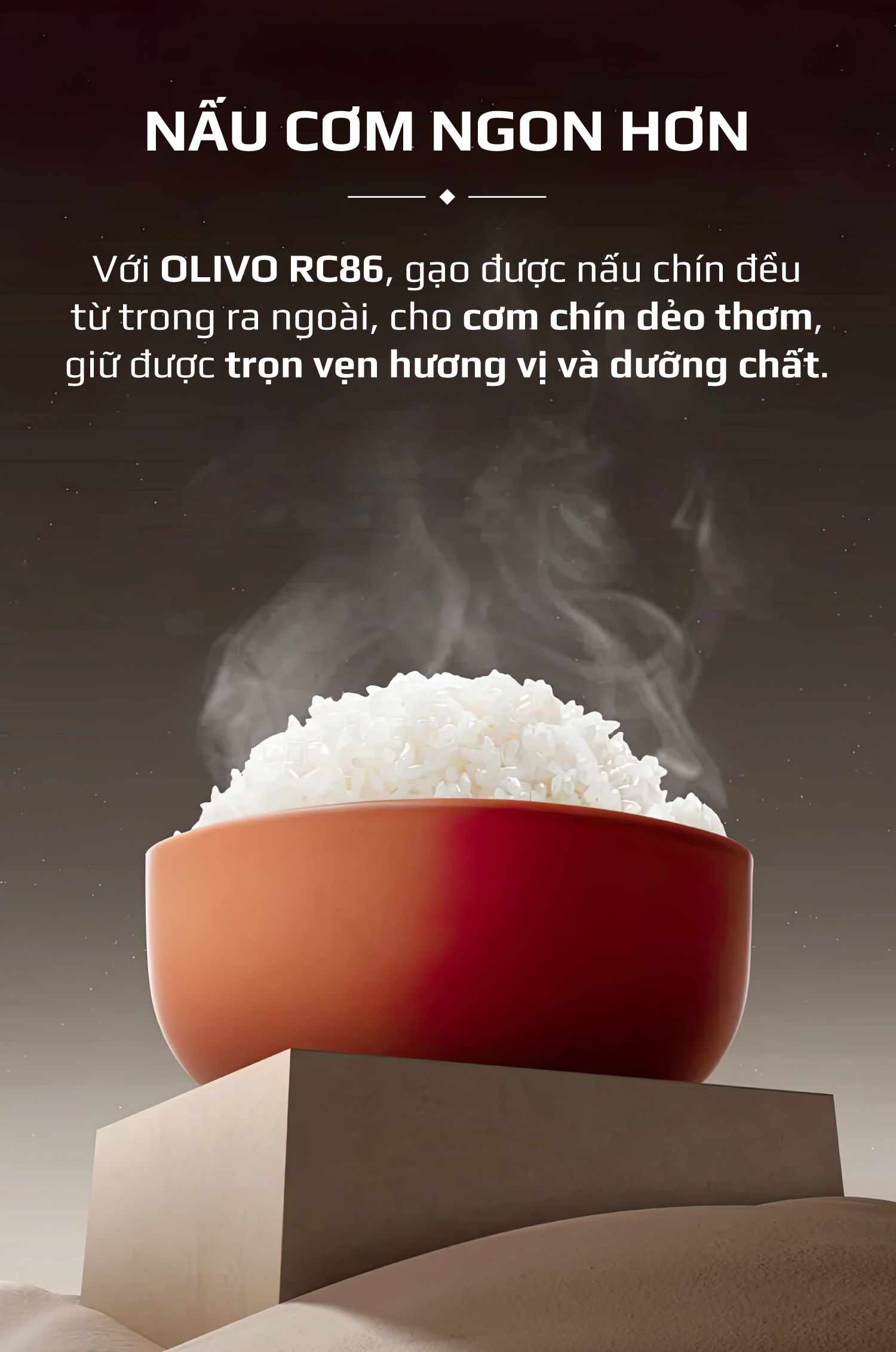 - OLIVO RC86 ứng dụng nguyên tắc cân bằng nhiệt, hơi nước và thời gian nấu tiên tiến, giúp hạt cơm chín đều, dẻo thơm, giữ trọn vẹn hương vị và độ ngọt tự nhiên. Nồi dung tích 1.5 lít phù hợp cho gia đình 4-8 người, với nhiều chế độ nấu tự động như nấu cơm, nấu cháo, hấp, hầm,… đáp ứng đa dạng nhu cầu nấu nướng của mọi gia đình.