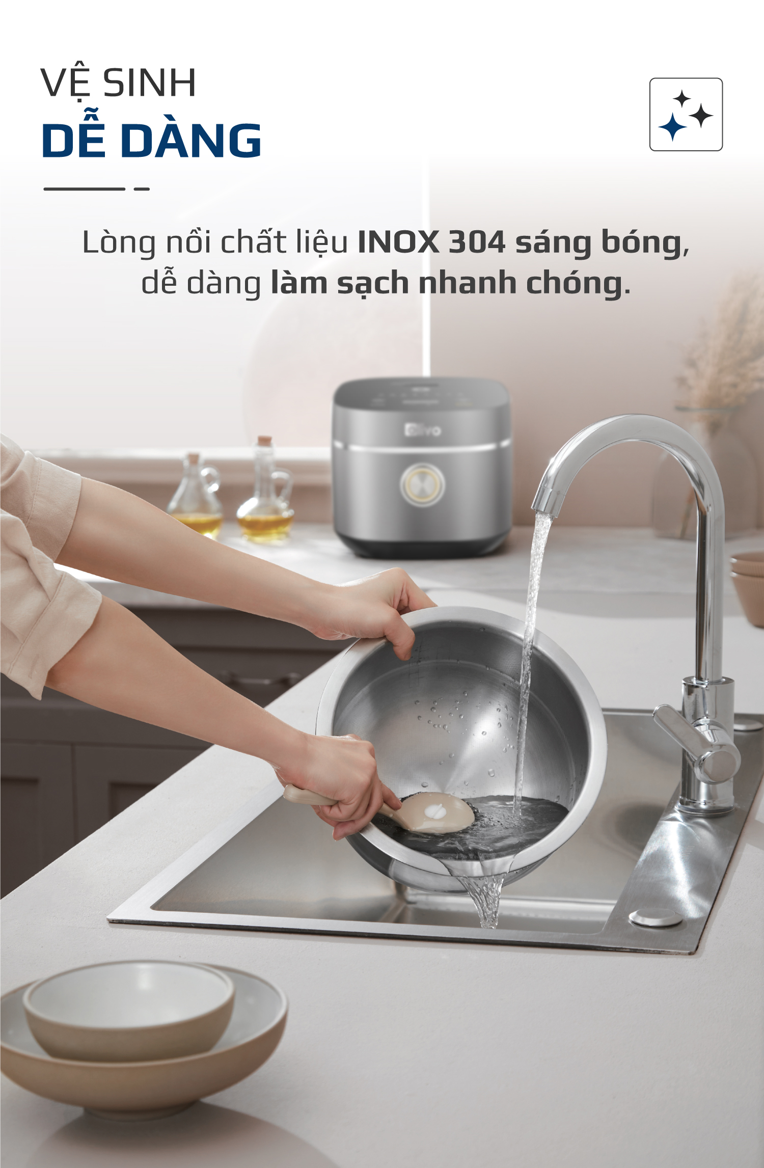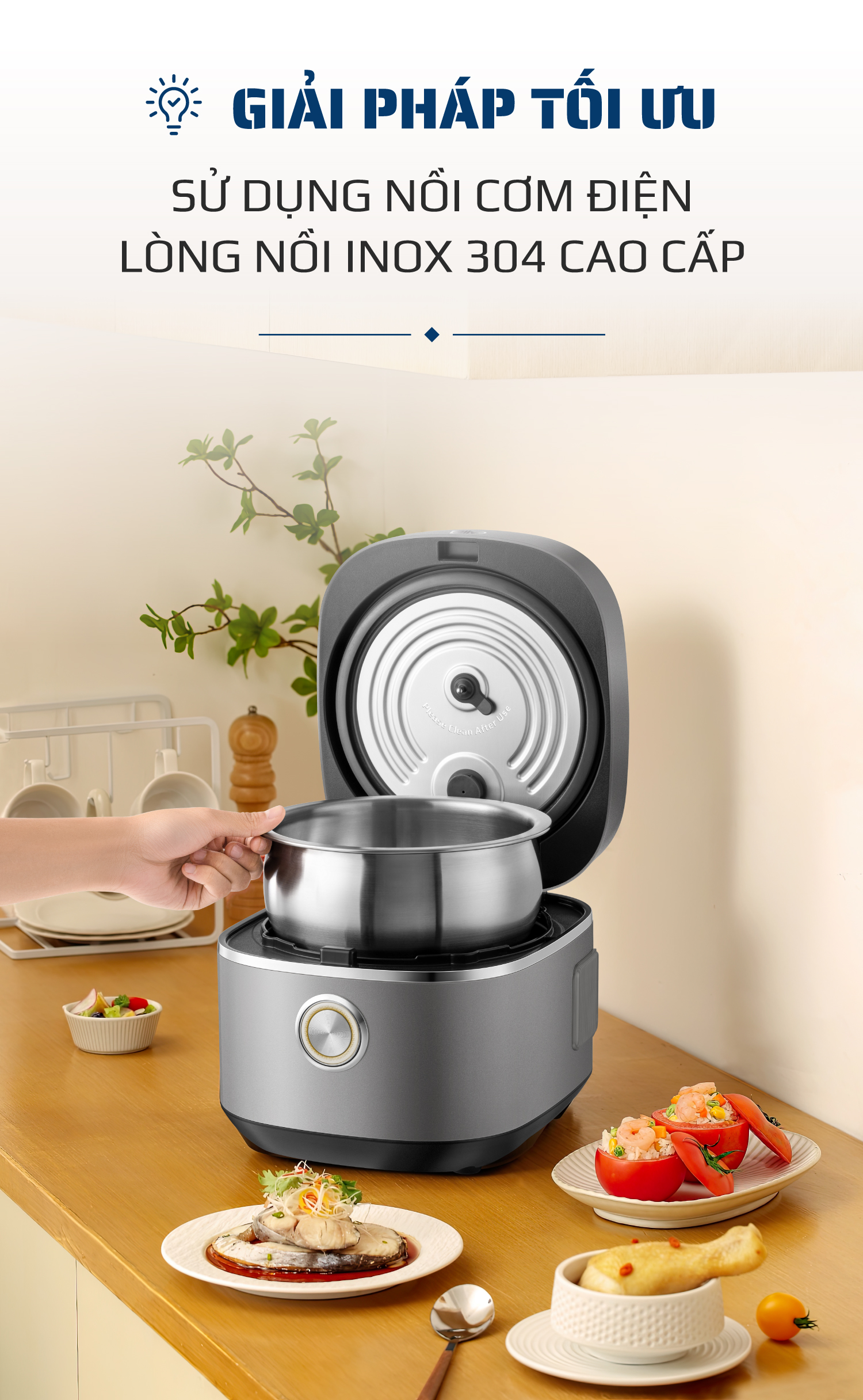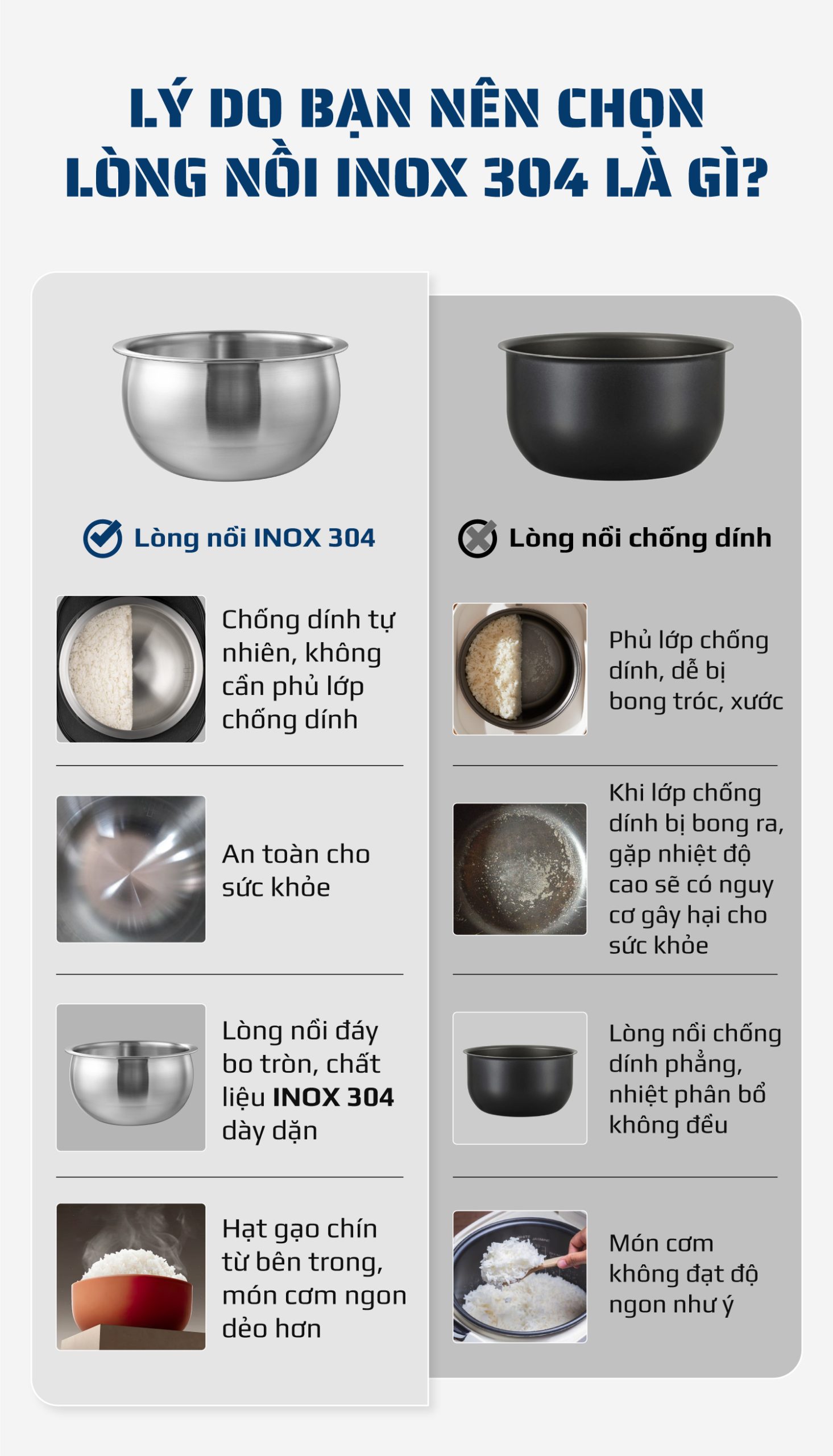 - Nấu cơm ngon hơn: INOX 304 hấp thụ nhiệt tốt, truyền nhiệt đều, cho hạt cơm chín kỹ từ bên trong, mềm dẻo hơn đặc biệt vẫn giữ nguyên hương vị.