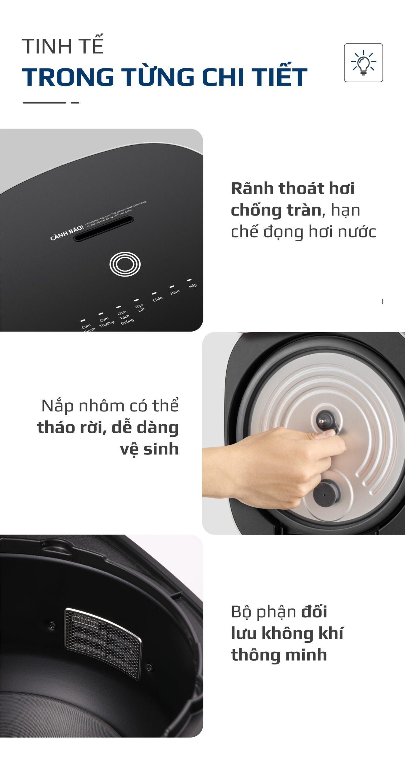 - Các chi tiết nhỏ của nồi cũng có độ hoàn thiện cao như: phần rãnh thoát hơi nước lớn, chống tràn và hạn chế hơi nước đọng lại trên thành nồi. Nắp nhôm có thể tháo rời, thuận tiện cho việc vệ sinh.