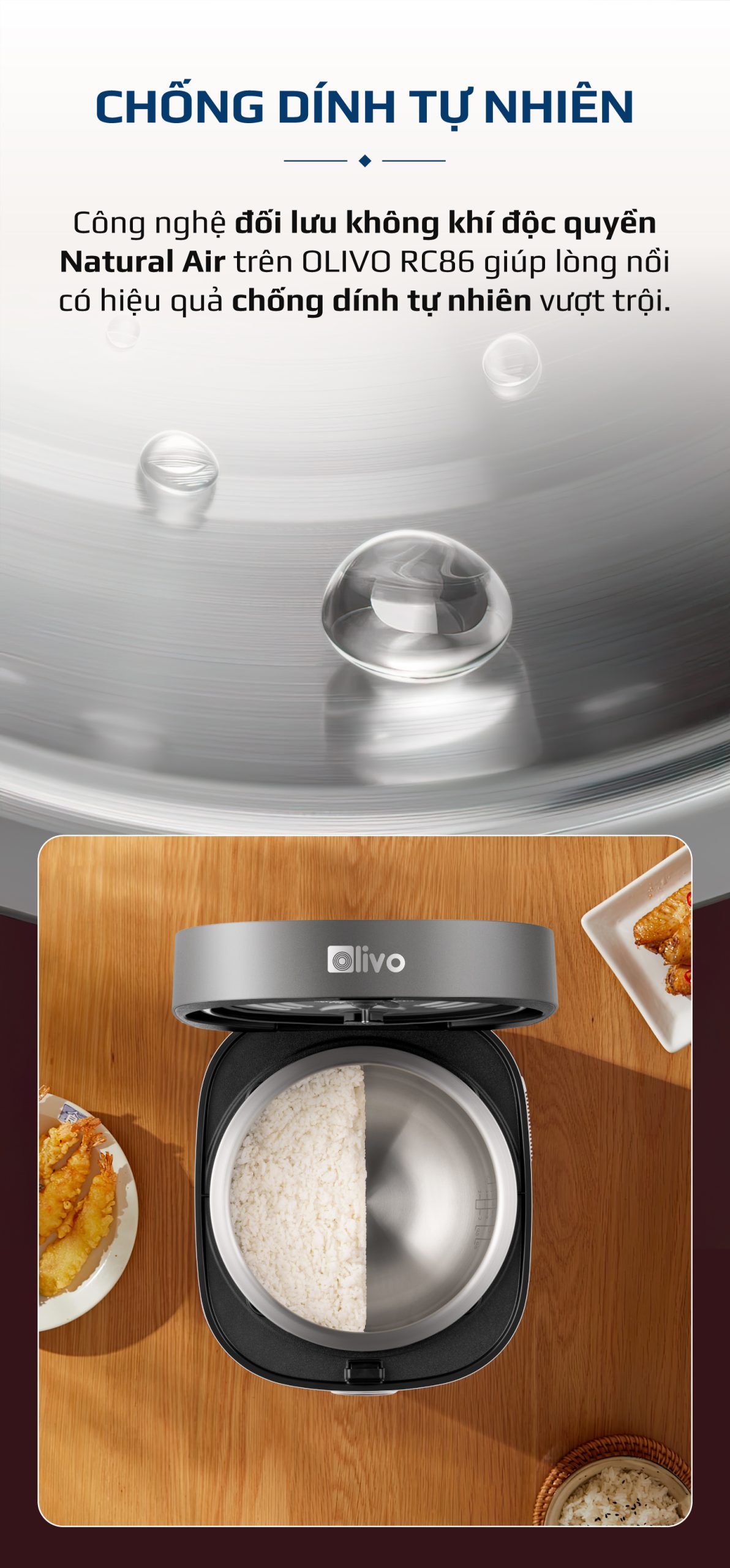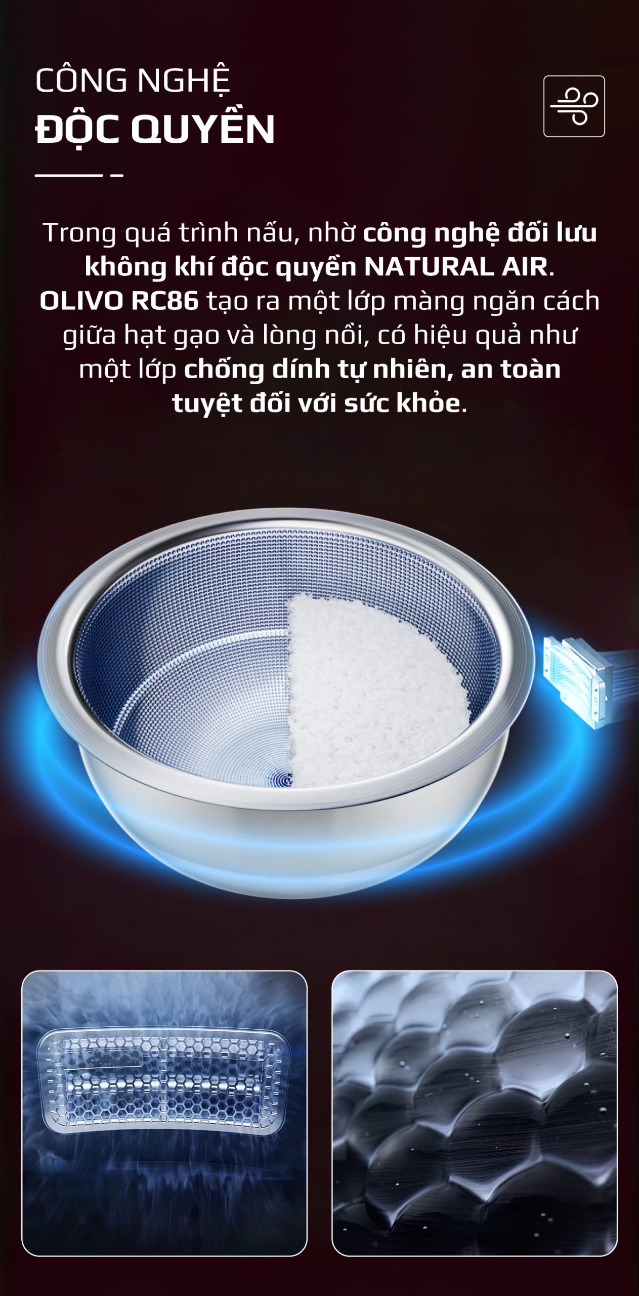 - Là công nghệ hiện đại nhất hiện nay trên nồi cơm điện với cơ chế hoạt động như sau: trong quá trình nấu công nghệ NATURAL AIR trên OLIVO RC86 tạo ra một lớp màng ngăn cách giữa hạt gạo và lòng nồi, có hiệu quả như một lớp chống dính tự nhiên, an toàn tuyệt đối với sức khỏe.
