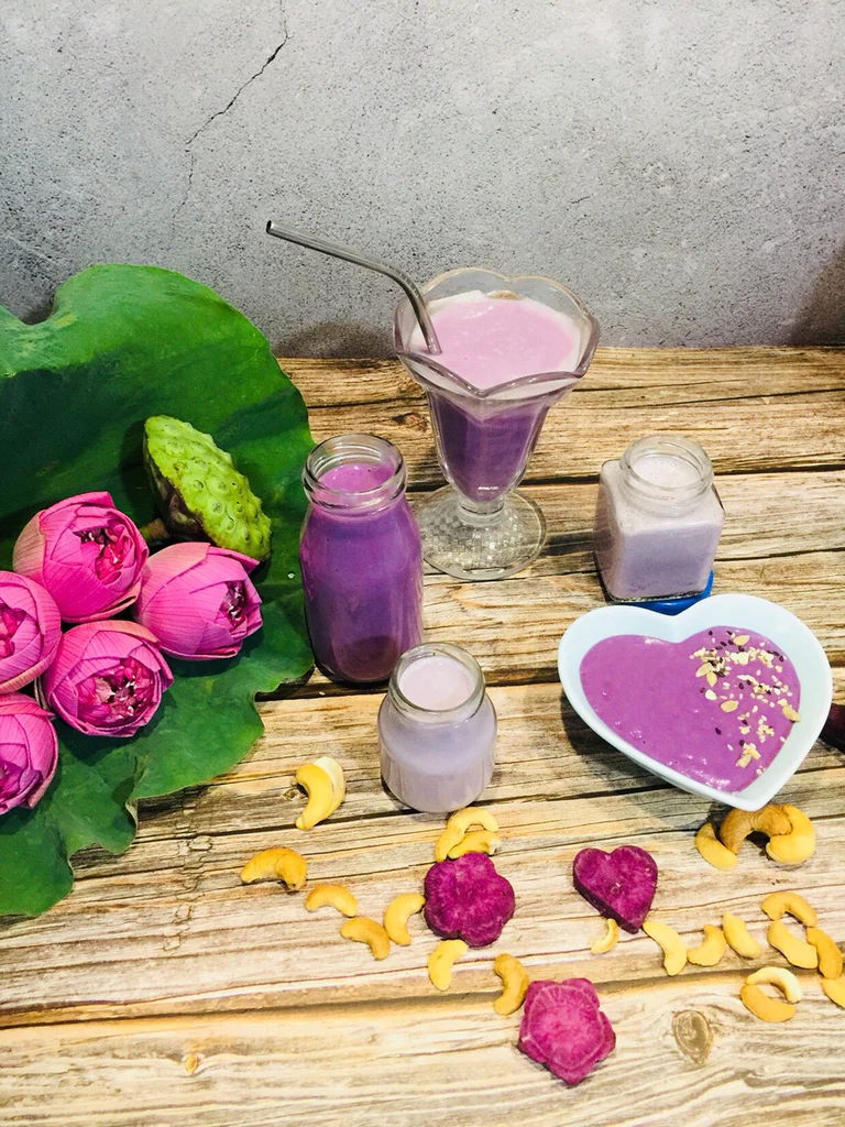 Cho tất cả các nguyên liệu vừa chuẩn bị vào máy xay với đường thốt nốt, ít muối hồng, 1,2 lít nước. Chọn chế độ sữa không nấu. Thành phẩm có màu đỏ bắt mắt, vị ngọt dịu.