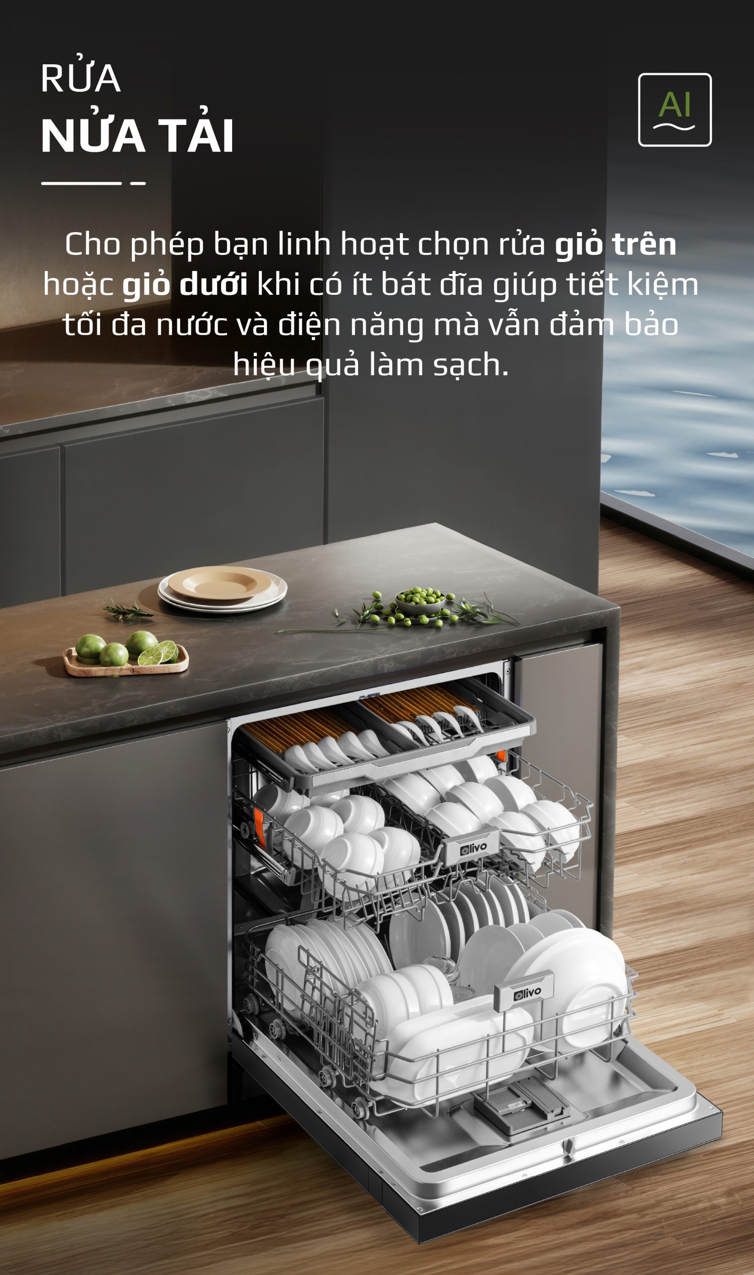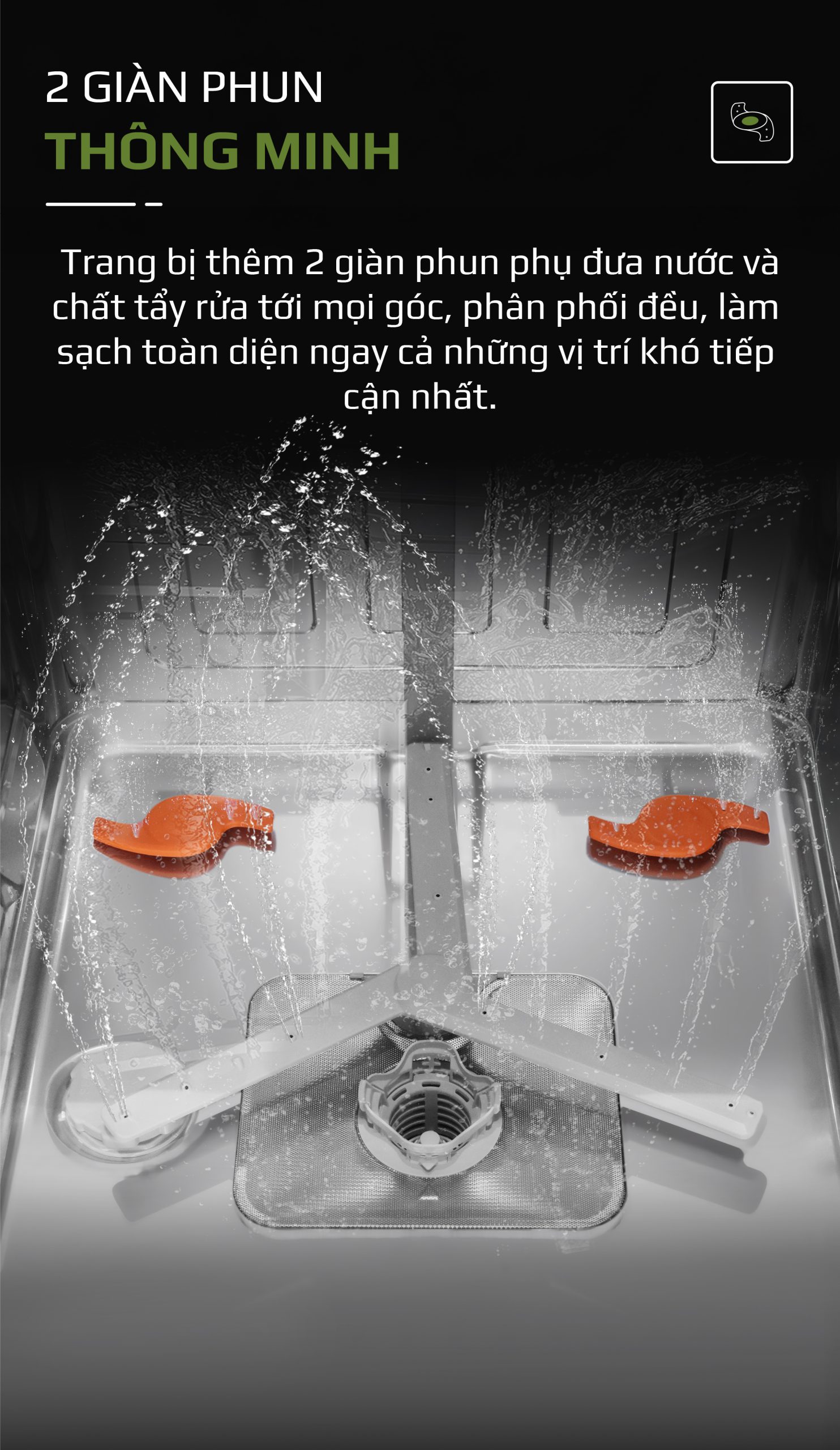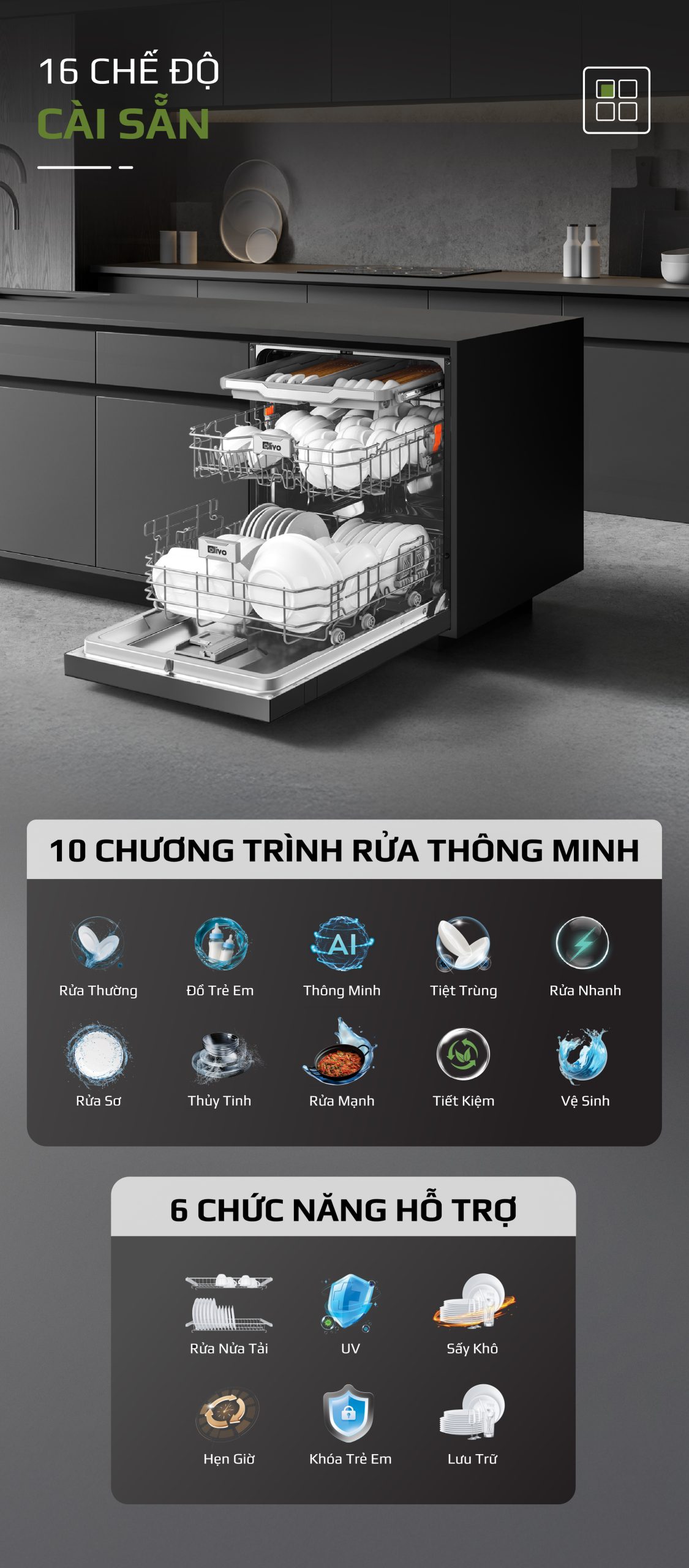 - Thông Minh: Tự động nhận diện mức độ bẩn của bát đĩa để điều chỉnh chương trình rửa phù hợp.