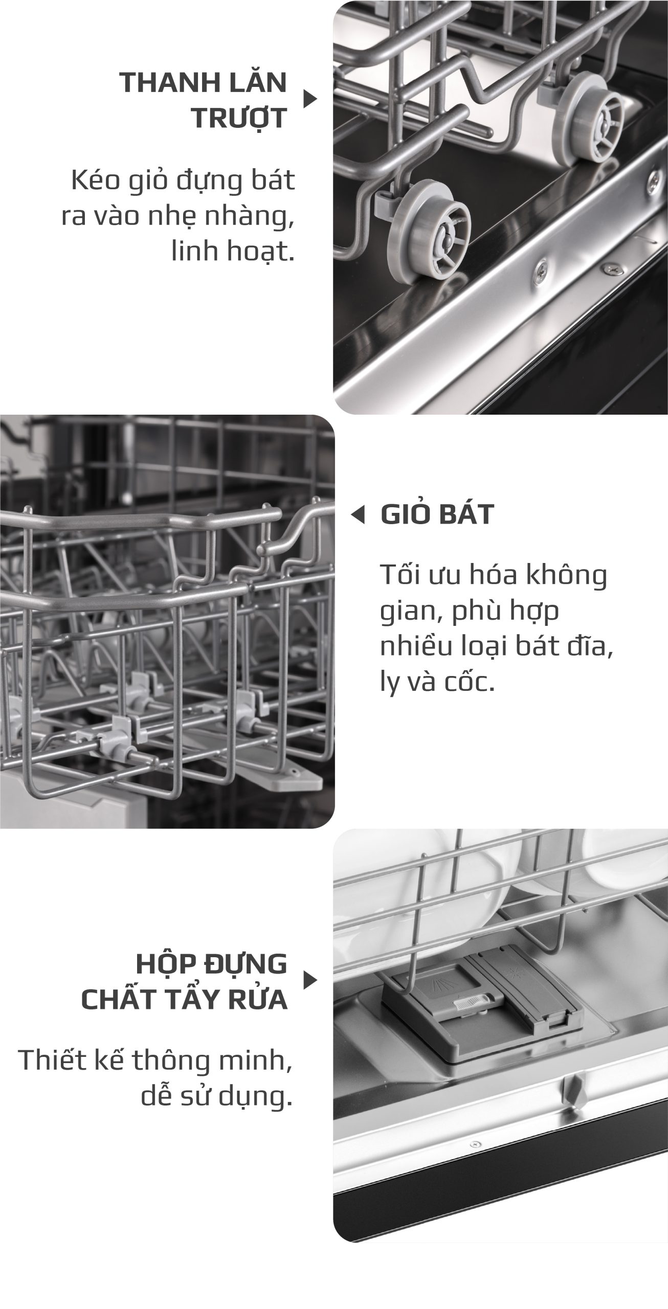 - Tính năng này không chỉ giúp tiết kiệm thời gian lấy ra, cất vào tủ, mà còn duy trì độ sạch và an toàn tối ưu cho bát đĩa, sẵn sàng sử dụng bất cứ lúc nào.