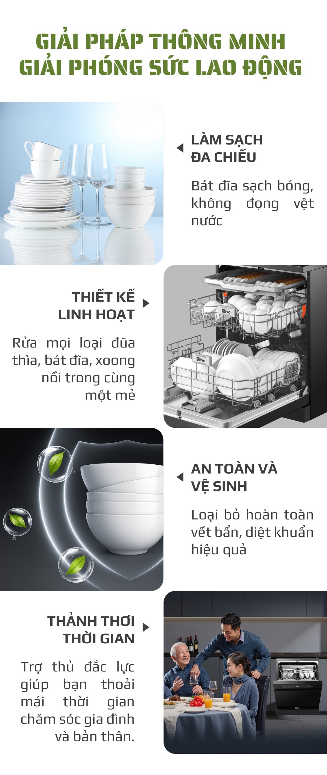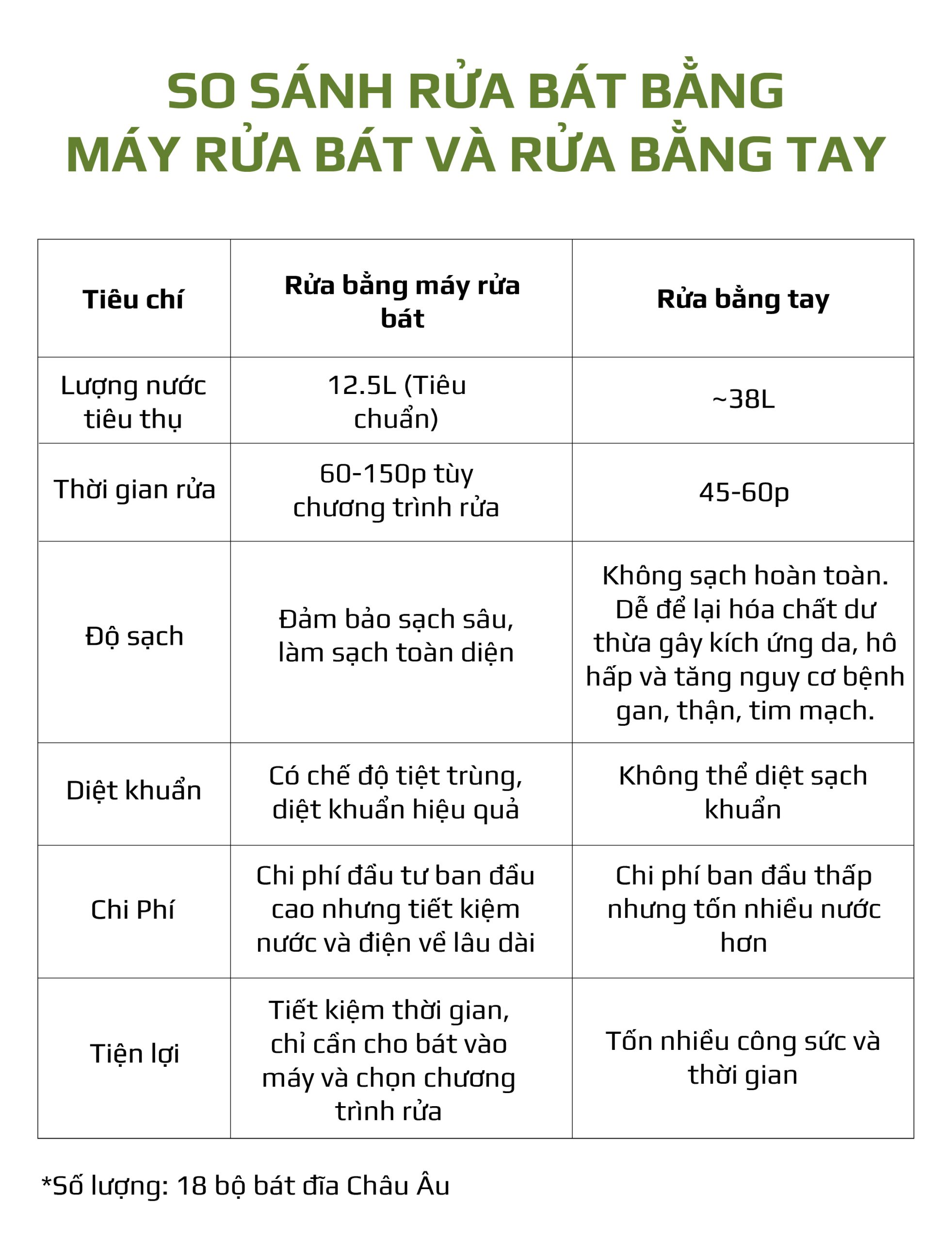 - Trong nhịp sống hiện đại, máy rửa bát không chỉ đơn thuần là thiết bị gia dụng mà là “người trợ lý thầm lặng” giúp bạn tiết kiệm thời gian, công sức mỗi ngày. Thay vì tốn hàng chục phút đứng bên bồn rửa sau mỗi bữa ăn, bạn có thể tận hưởng thời gian bên gia đình, nghỉ ngơi hay làm điều mình thích. Máy rửa bát giúp bát đĩa sạch sâu, tiệt trùng an toàn đặc biệt cần thiết với gia đình có trẻ nhỏ. Tận hưởng sự tiện nghi, sống thông minh và chất lượng hơn trong thời đại 4.0.