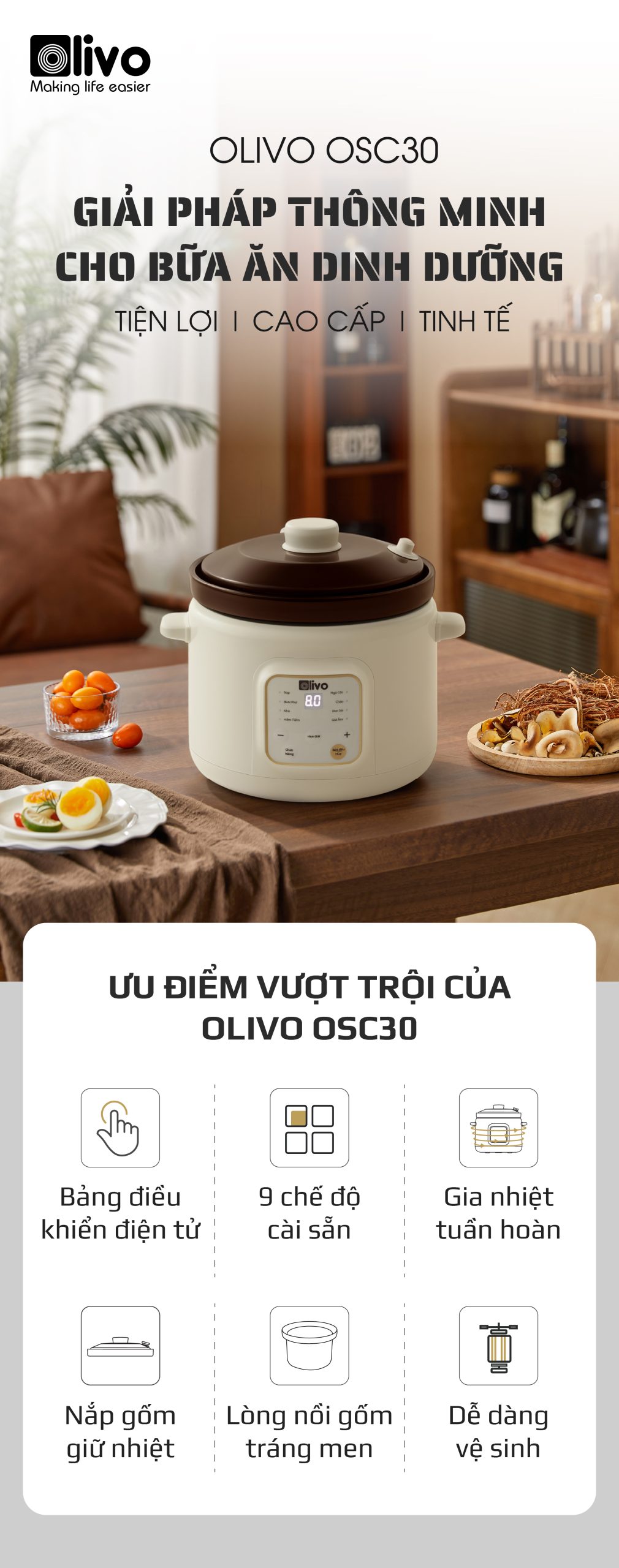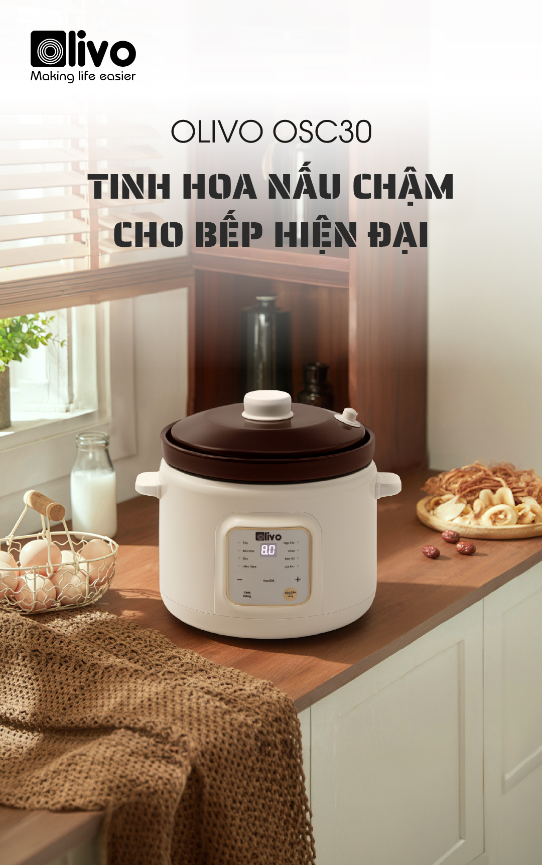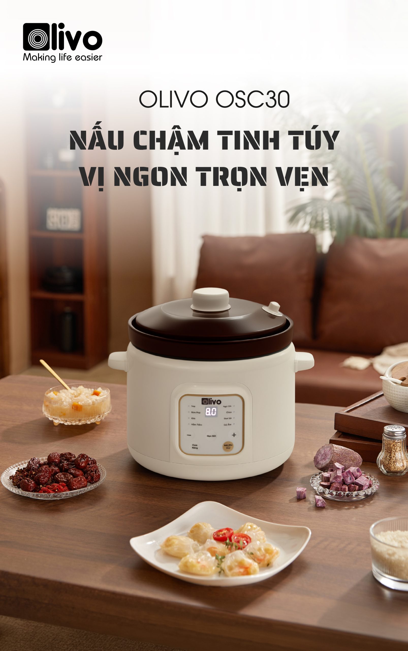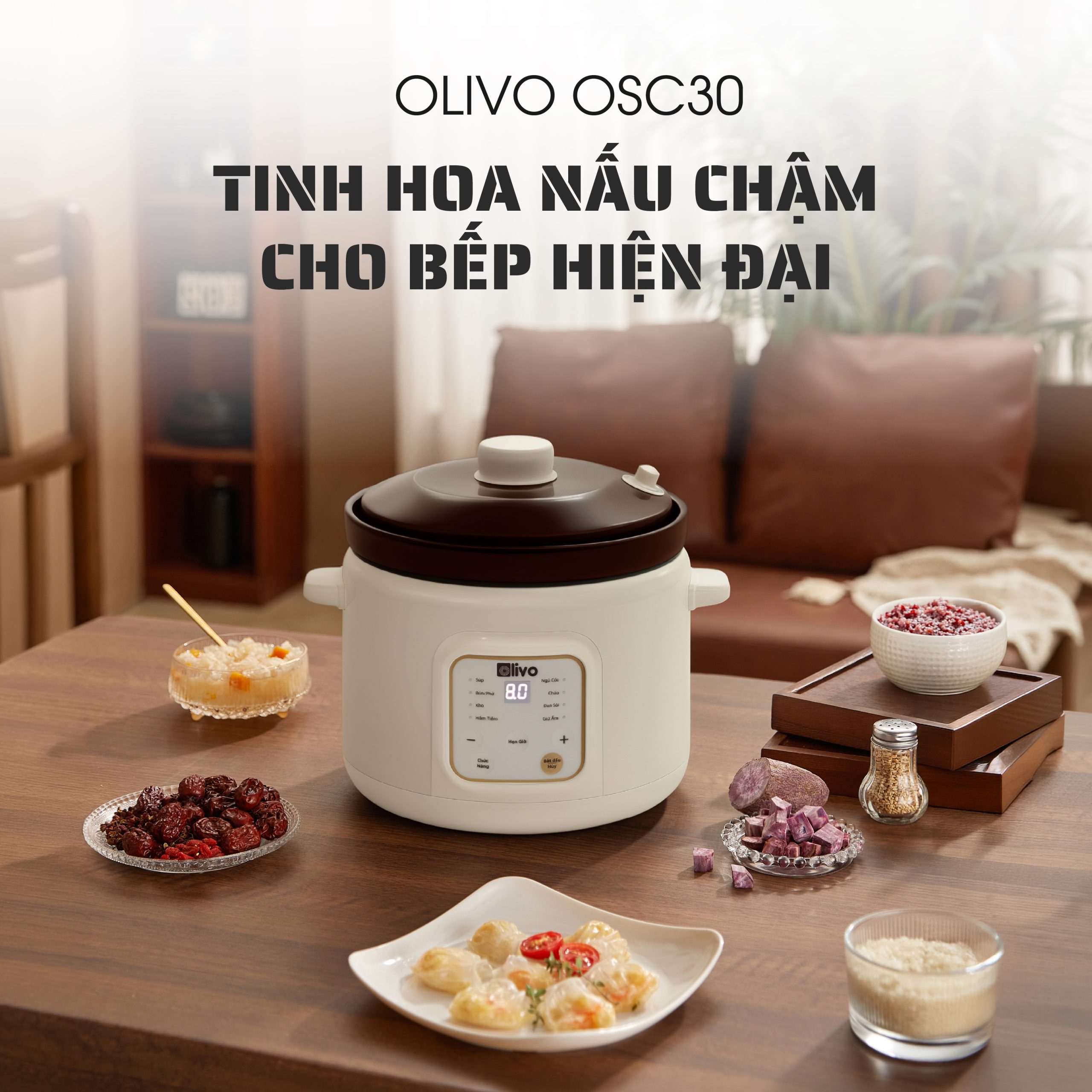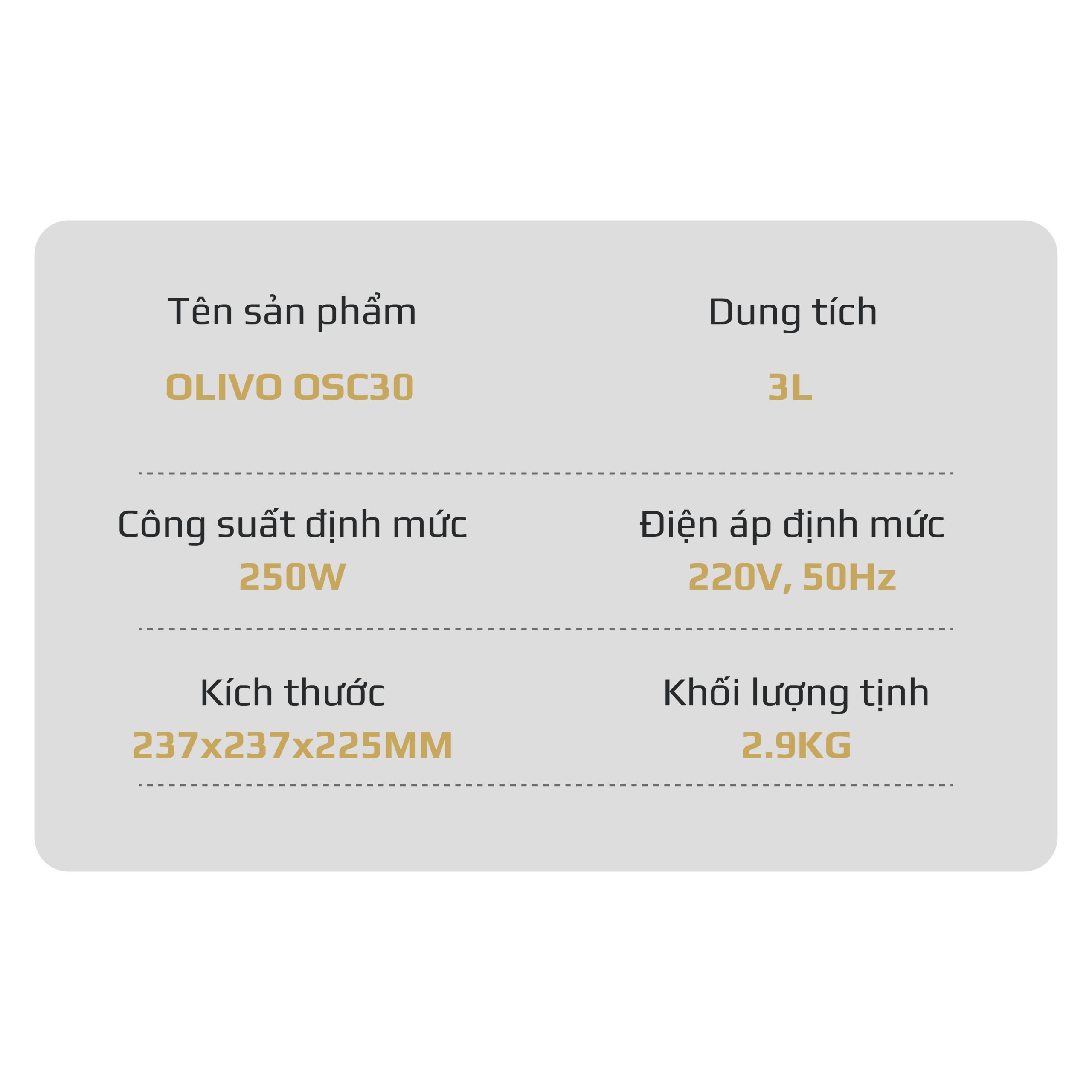 - OLIVO OSC30 không chỉ là một chiếc nồi nấu chậm, mà là trợ lý bếp núc thông minh giúp bạn chuẩn bị những bữa ăn bổ dưỡng, tiết kiệm thời gian, giữ trọn yêu thương và sự an tâm cho cả gia đình.