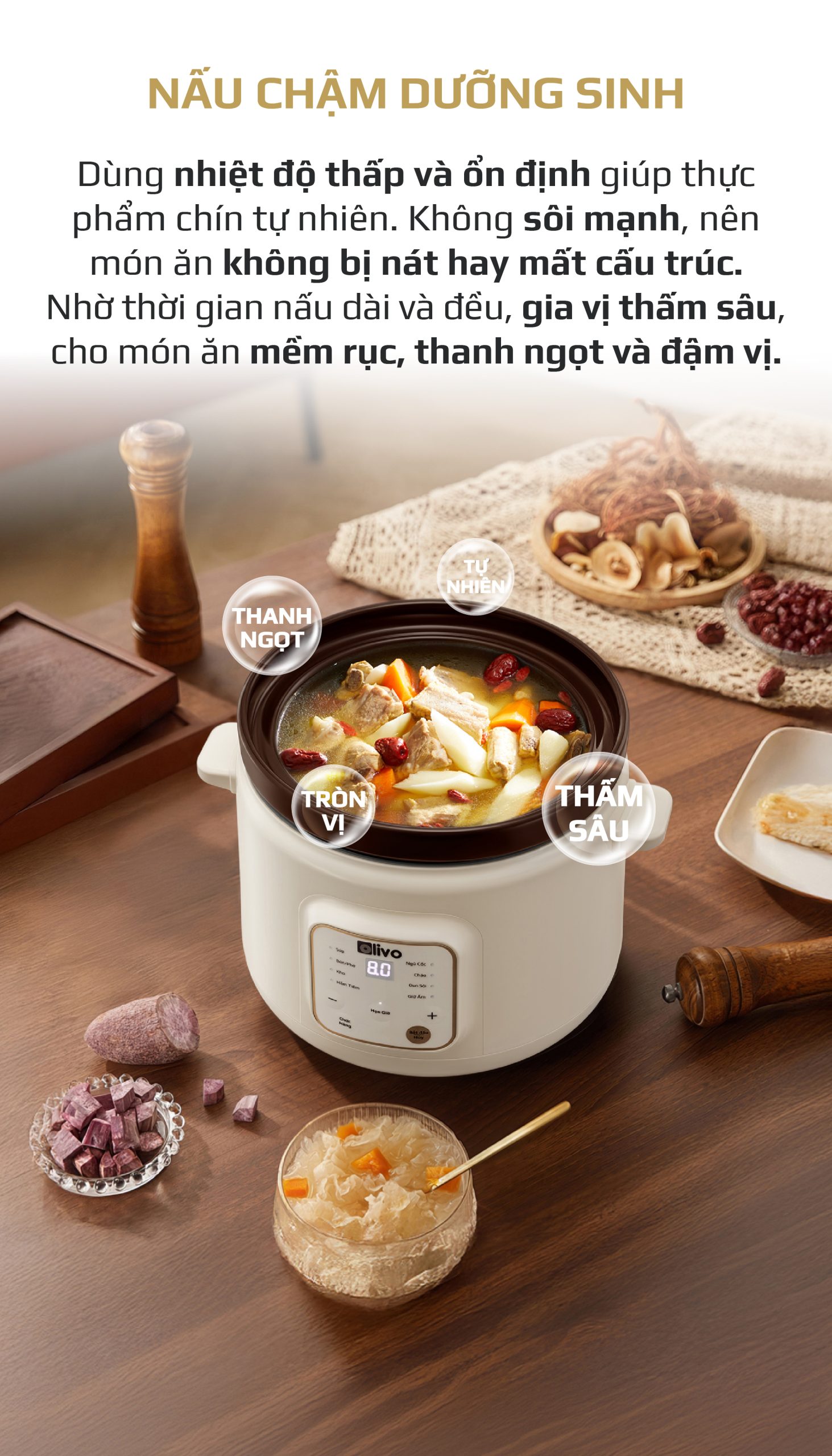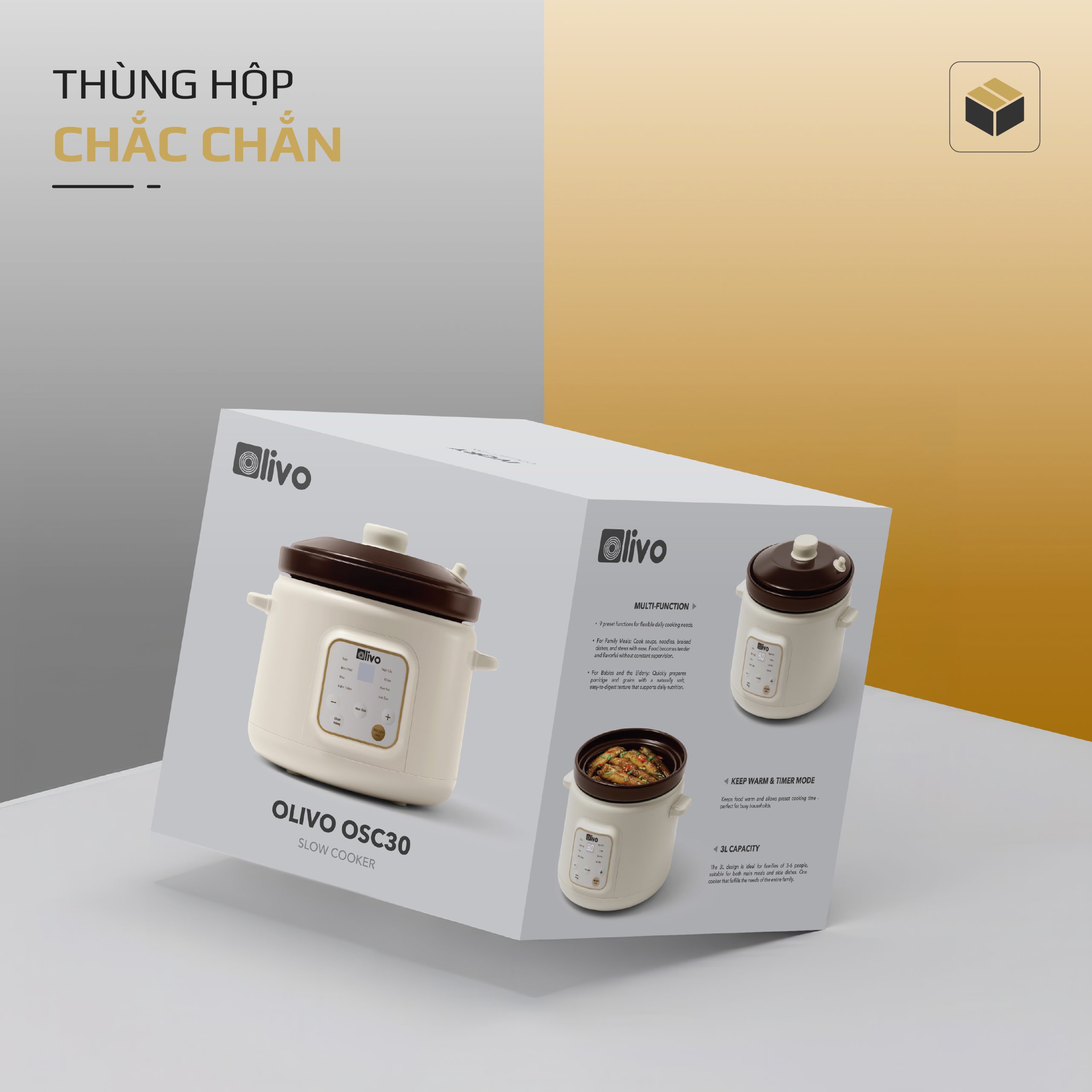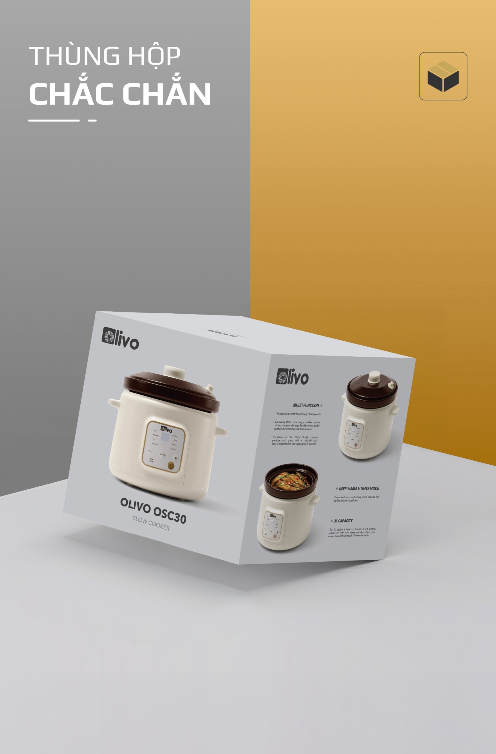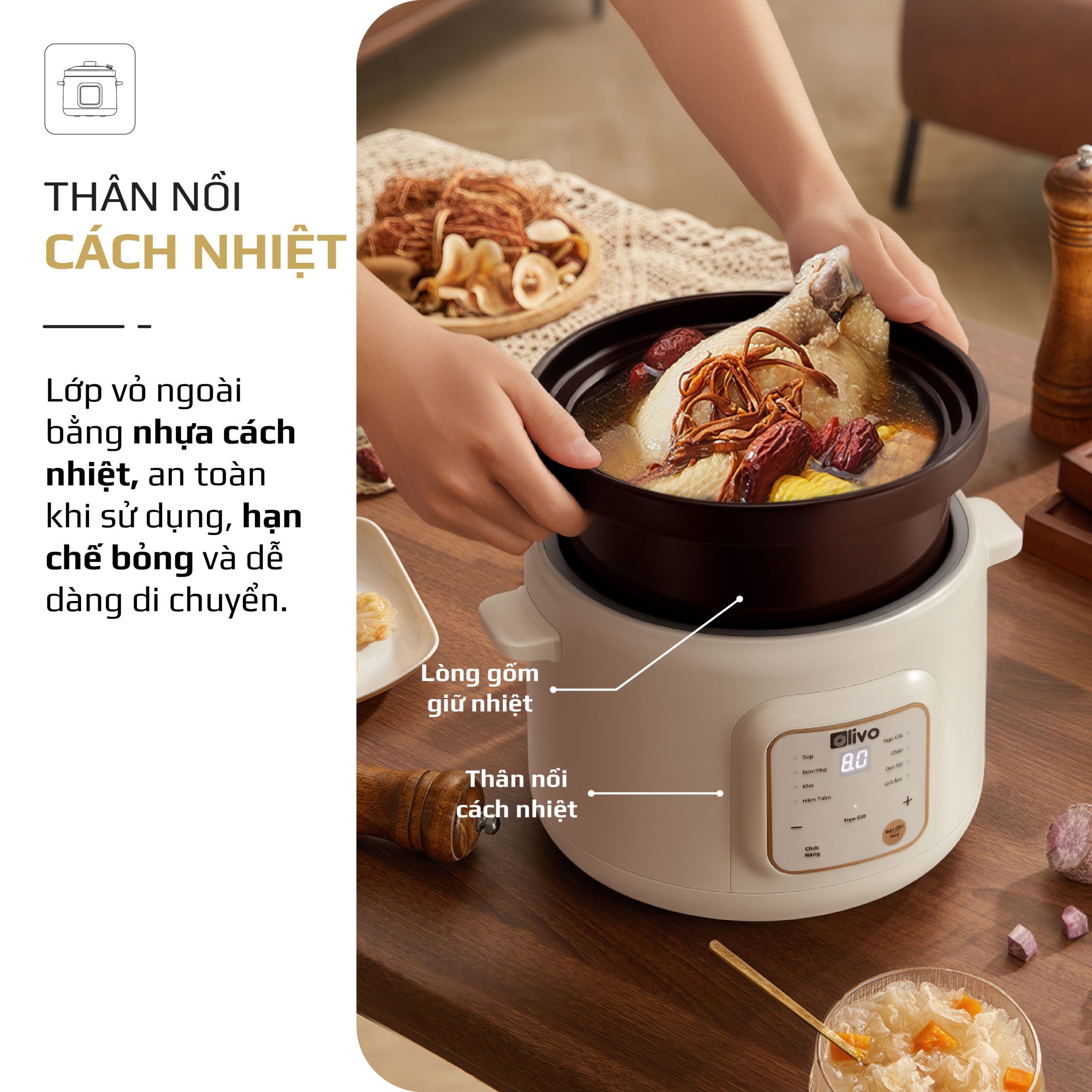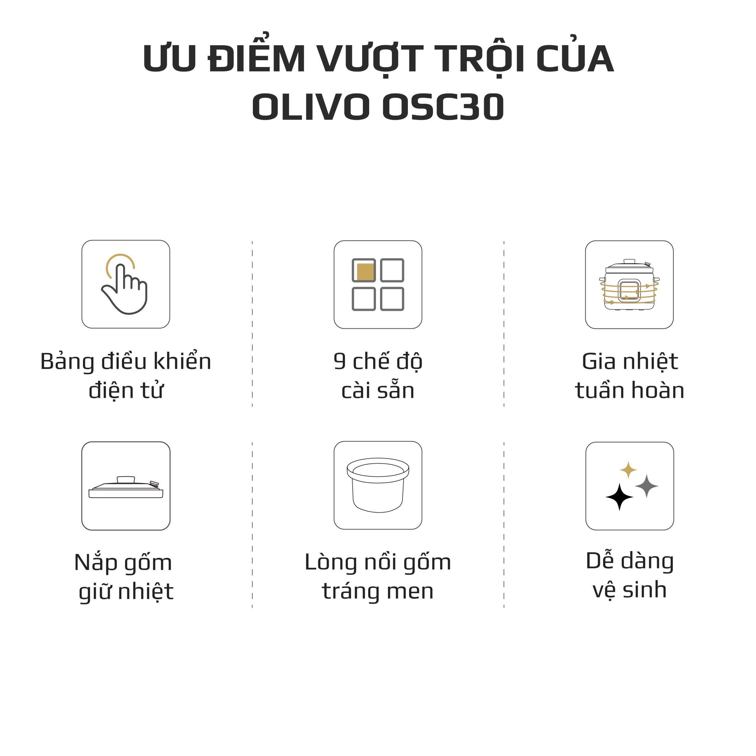 - OLIVO OSC30 không chỉ là một chiếc nồi nấu chậm, mà là trợ lý bếp núc thông minh giúp bạn chuẩn bị những bữa ăn bổ dưỡng, tiết kiệm thời gian, giữ trọn yêu thương và sự an tâm cho cả gia đình.