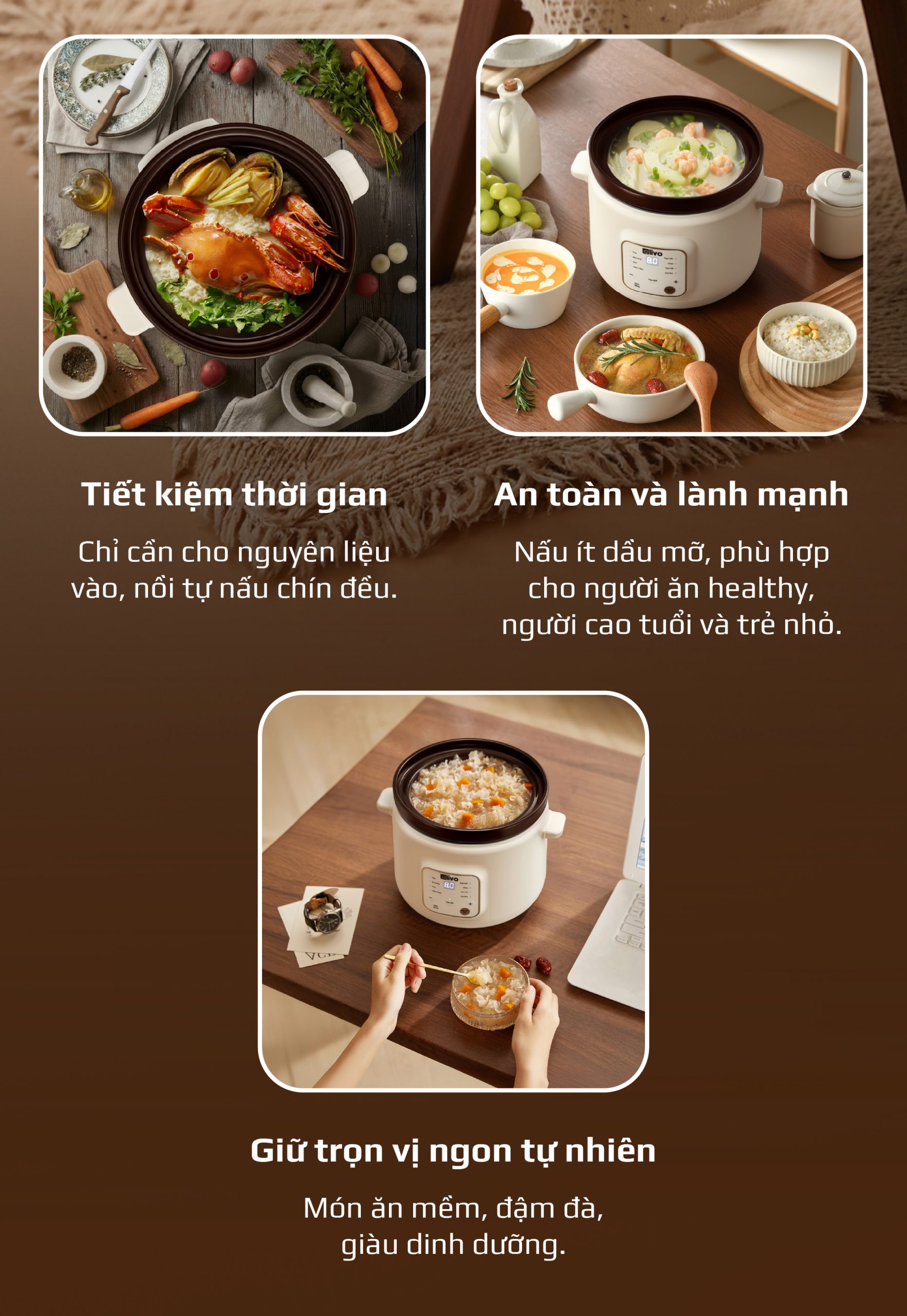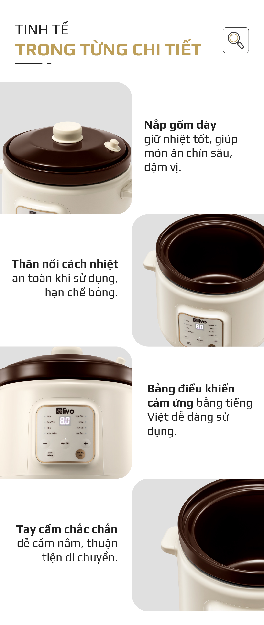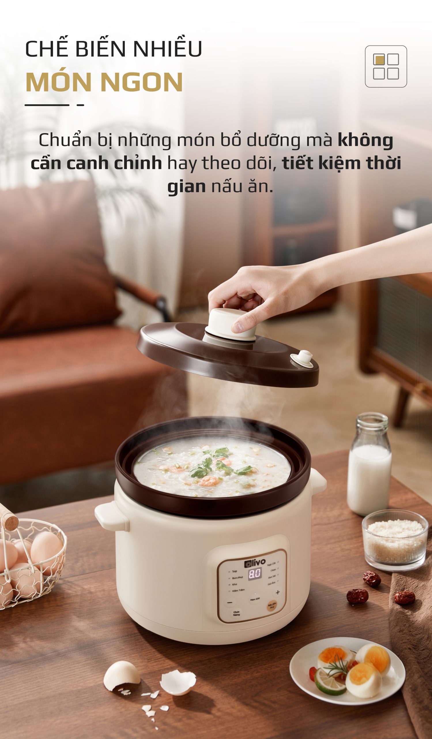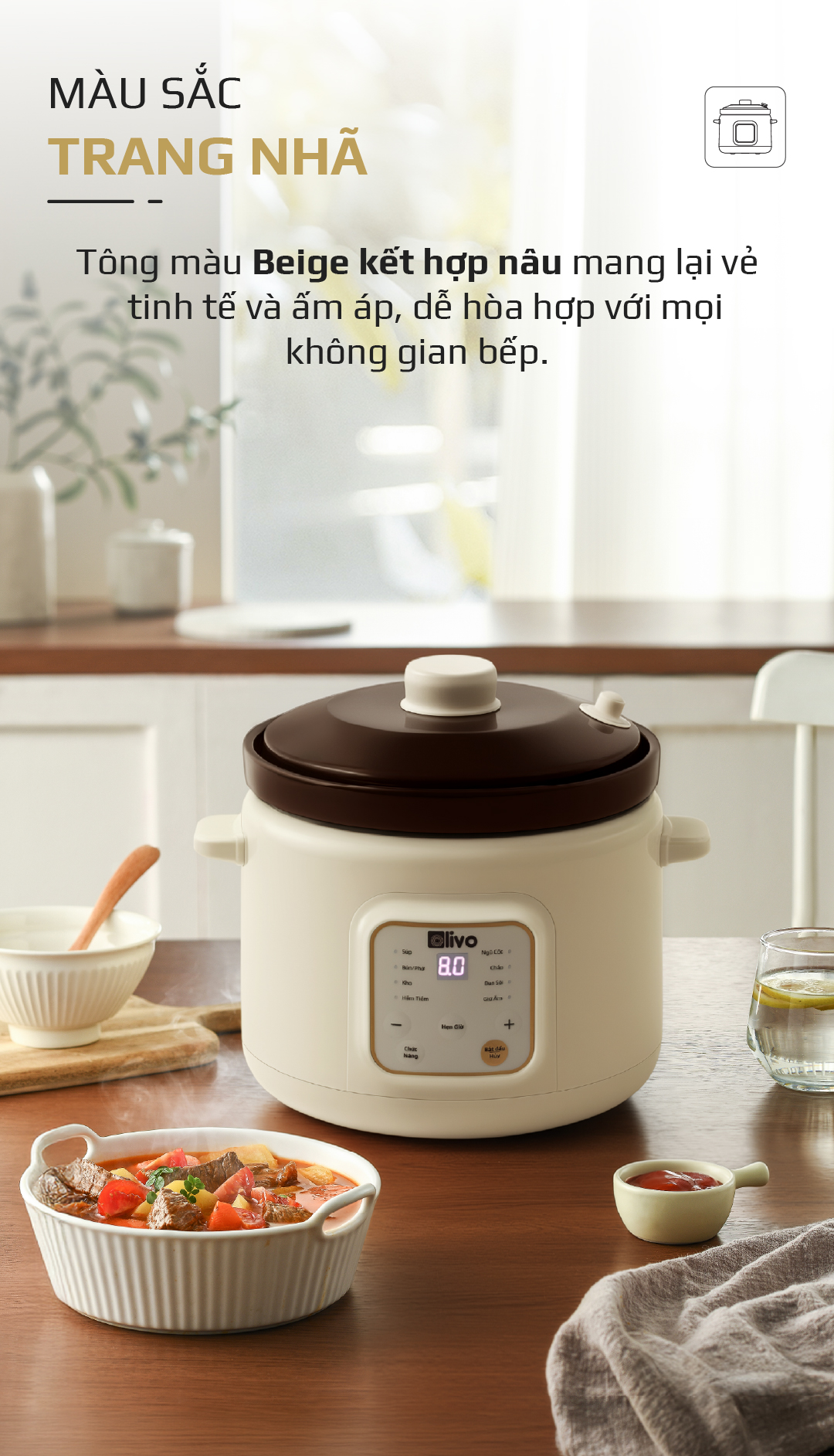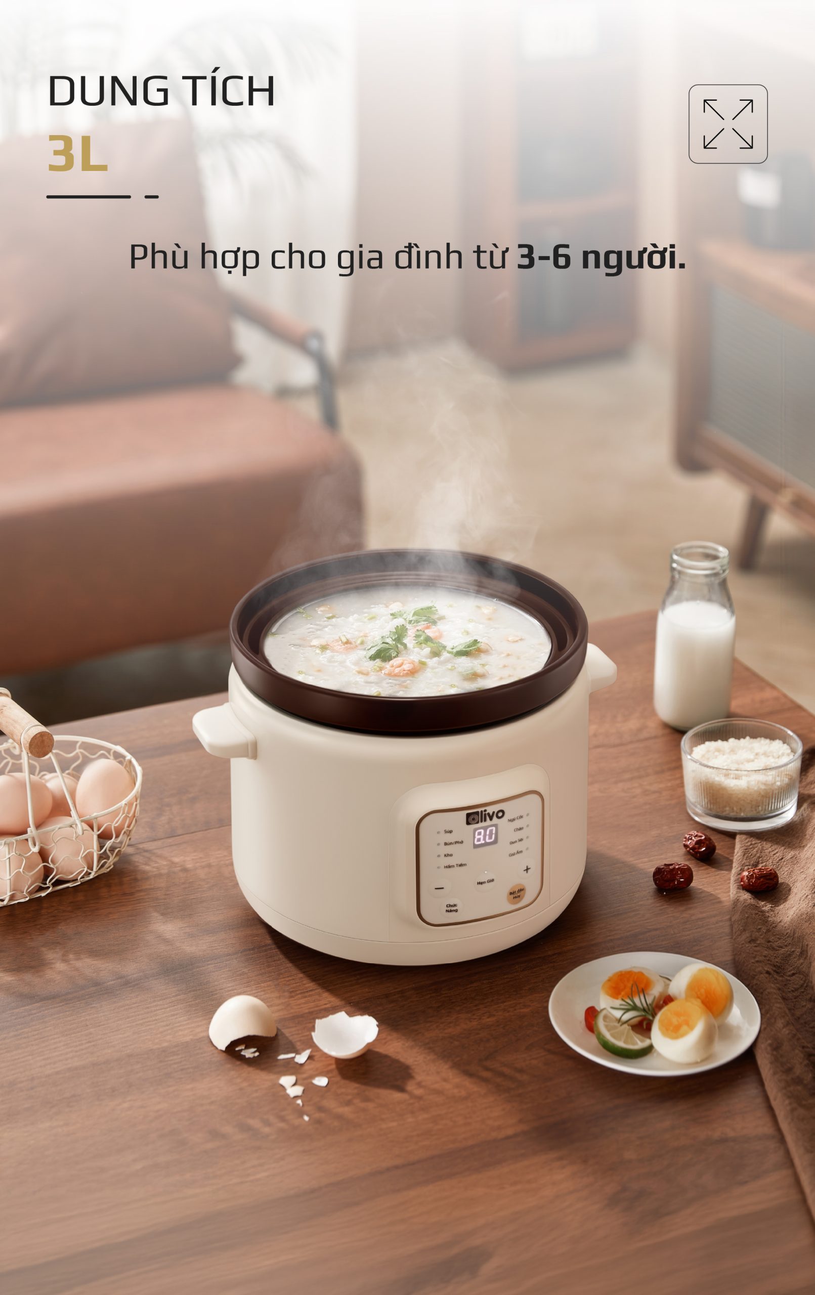 - OLIVO OSC30 không chỉ là một chiếc nồi nấu chậm, mà là trợ lý bếp núc thông minh giúp bạn chuẩn bị những bữa ăn bổ dưỡng, tiết kiệm thời gian, giữ trọn yêu thương và sự an tâm cho cả gia đình.
