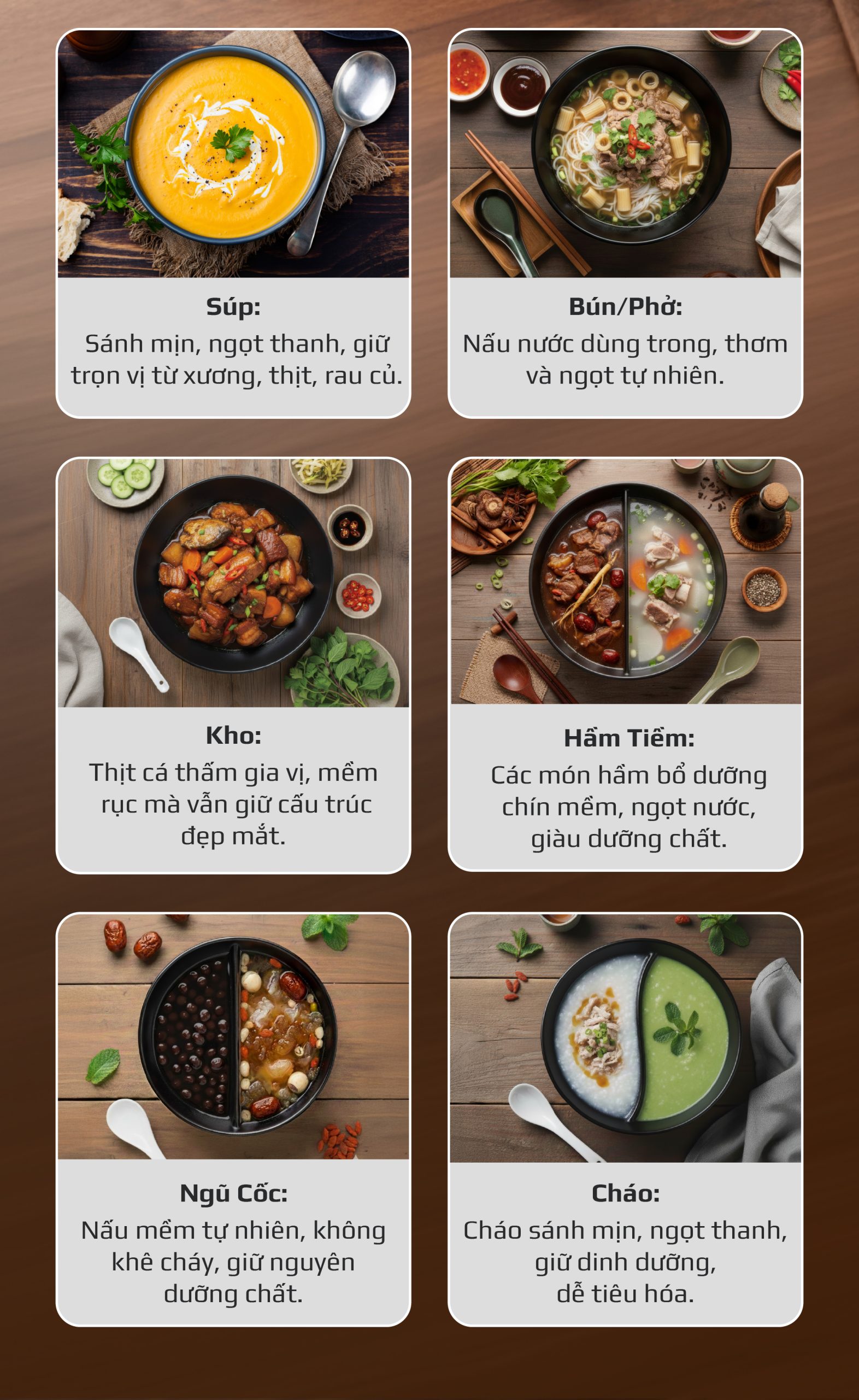 - Ngũ cốc: Nấu mềm tự nhiên, không khê cháy, giữ nguyên giá trị dinh dưỡng.