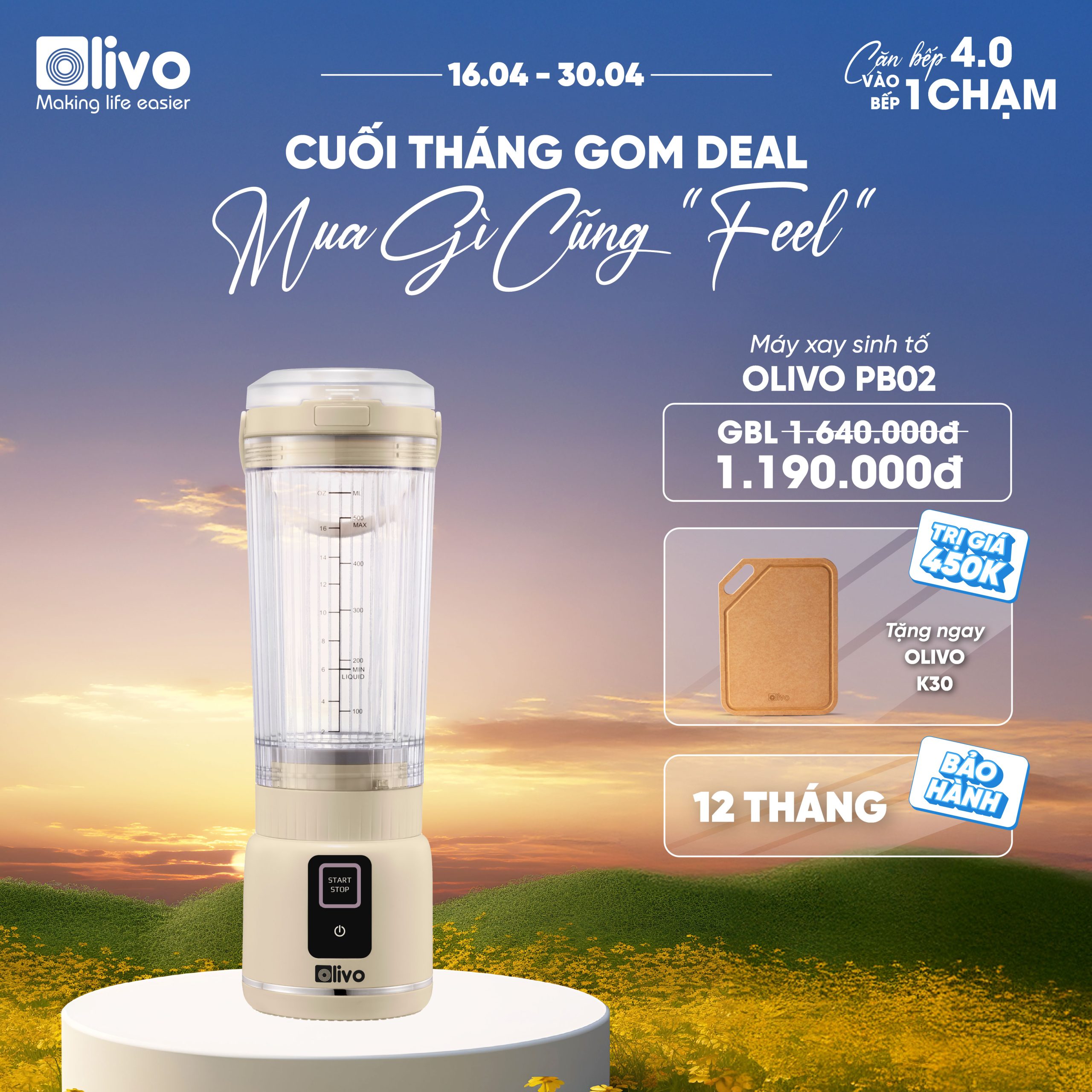 - Với OLIVO PB02, bạn có thể thưởng thức đồ uống ngay sau khi xay mà không cần rót ra ly. Chỉ cần thay nắp đế tiện lợi, bạn đã có ngay một chiếc ly cầm tay nhỏ gọn.