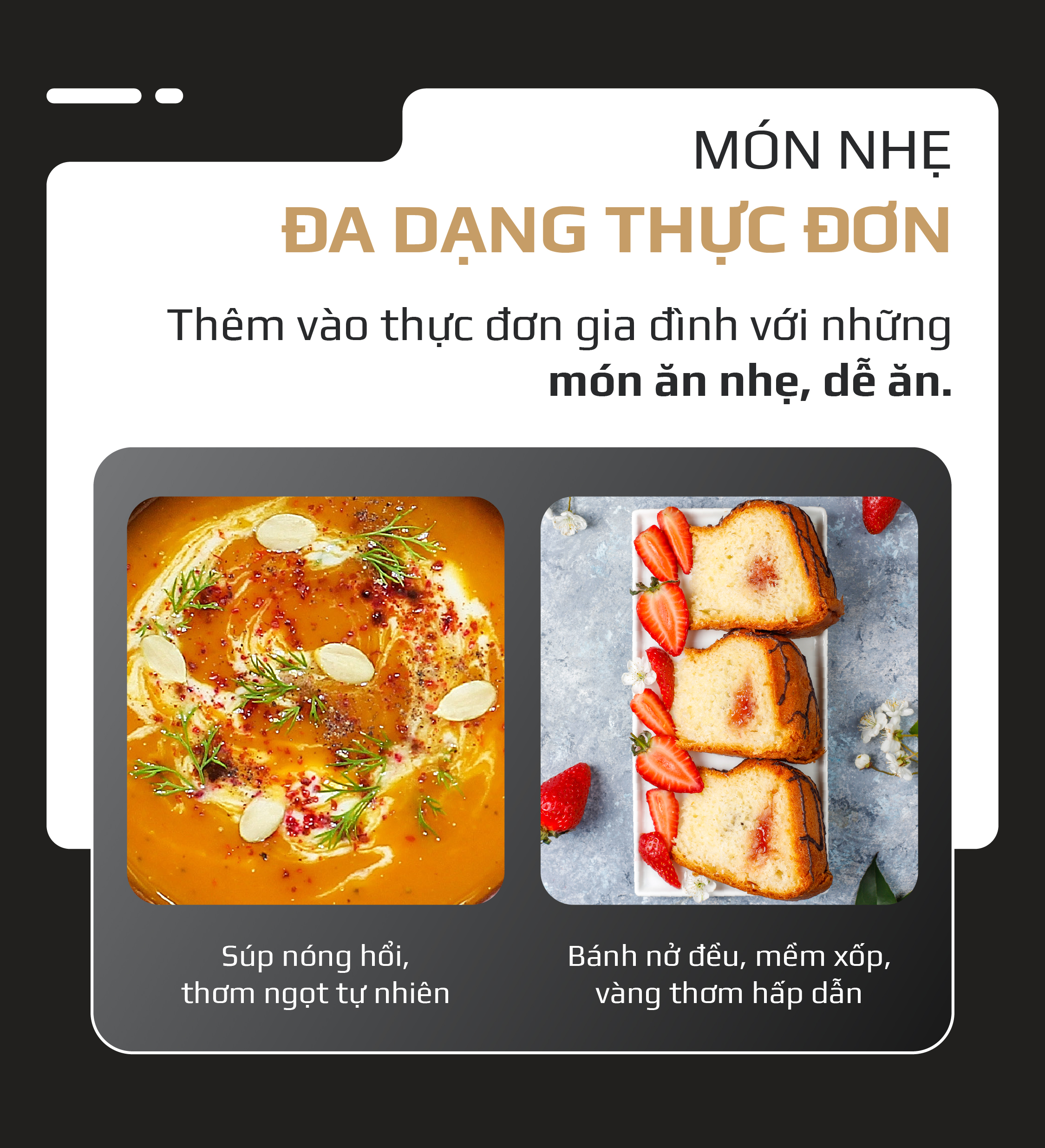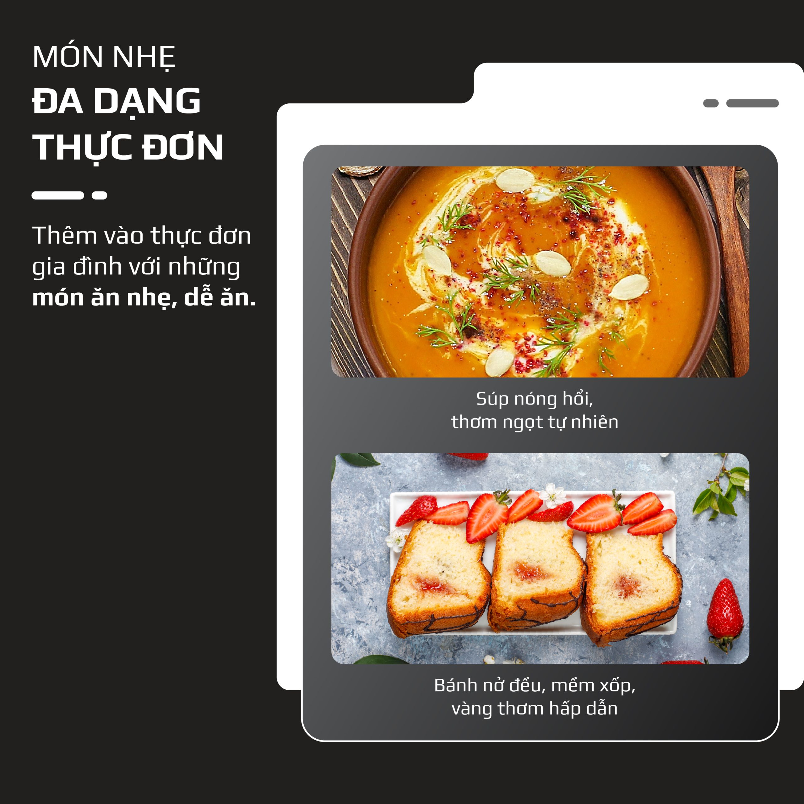 - Làm phong phú thực đơn gia đình với những món ăn nhẹ thơm ngon, dễ thưởng thức và tốt cho sức khỏe. Với công nghệ cao tần thông minh, nồi giúp bạn dễ dàng chế biến những món súp nóng hổi, thơm ngọt tự nhiên hay những chiếc bánh mềm xốp, nở đều và vàng thơm hấp dẫn.