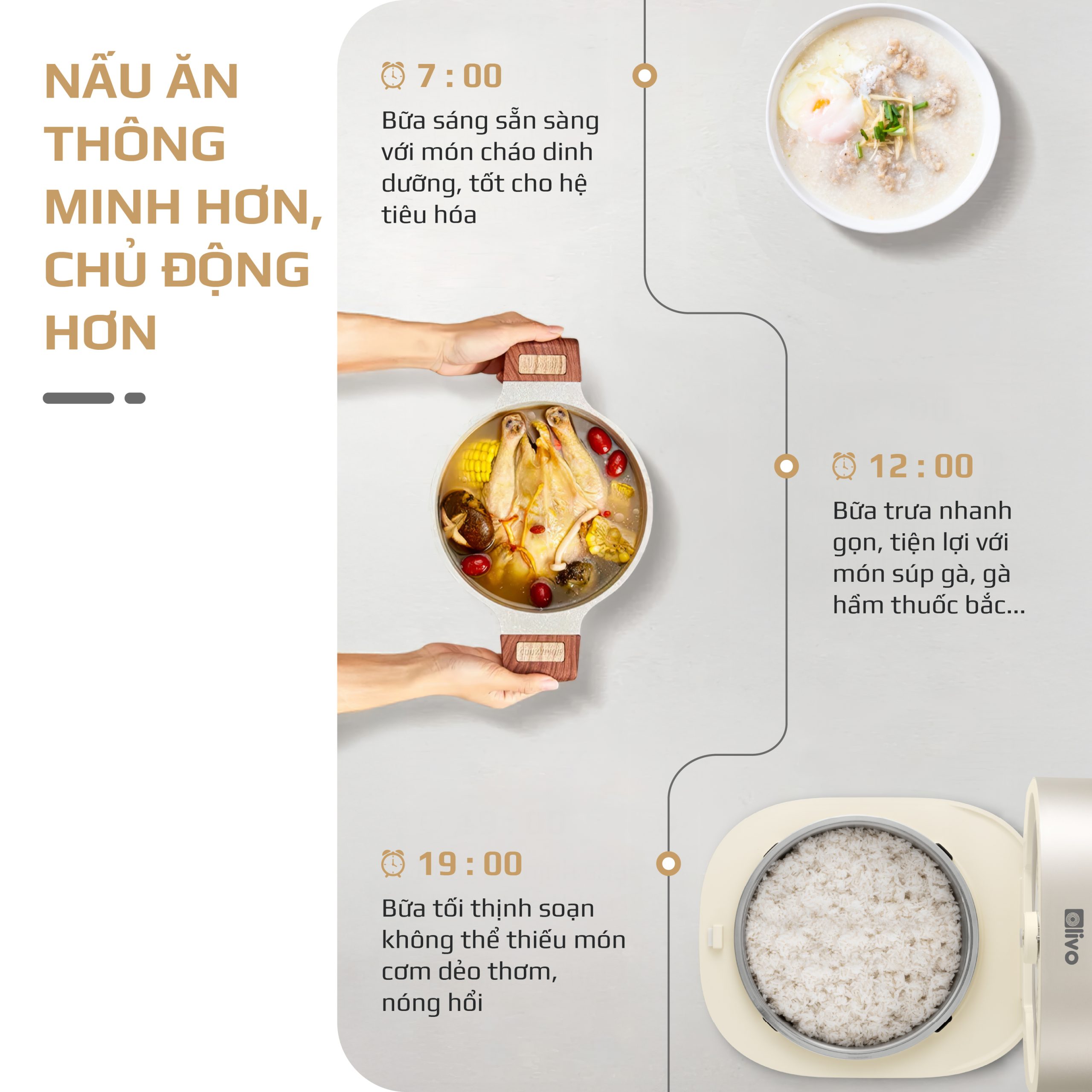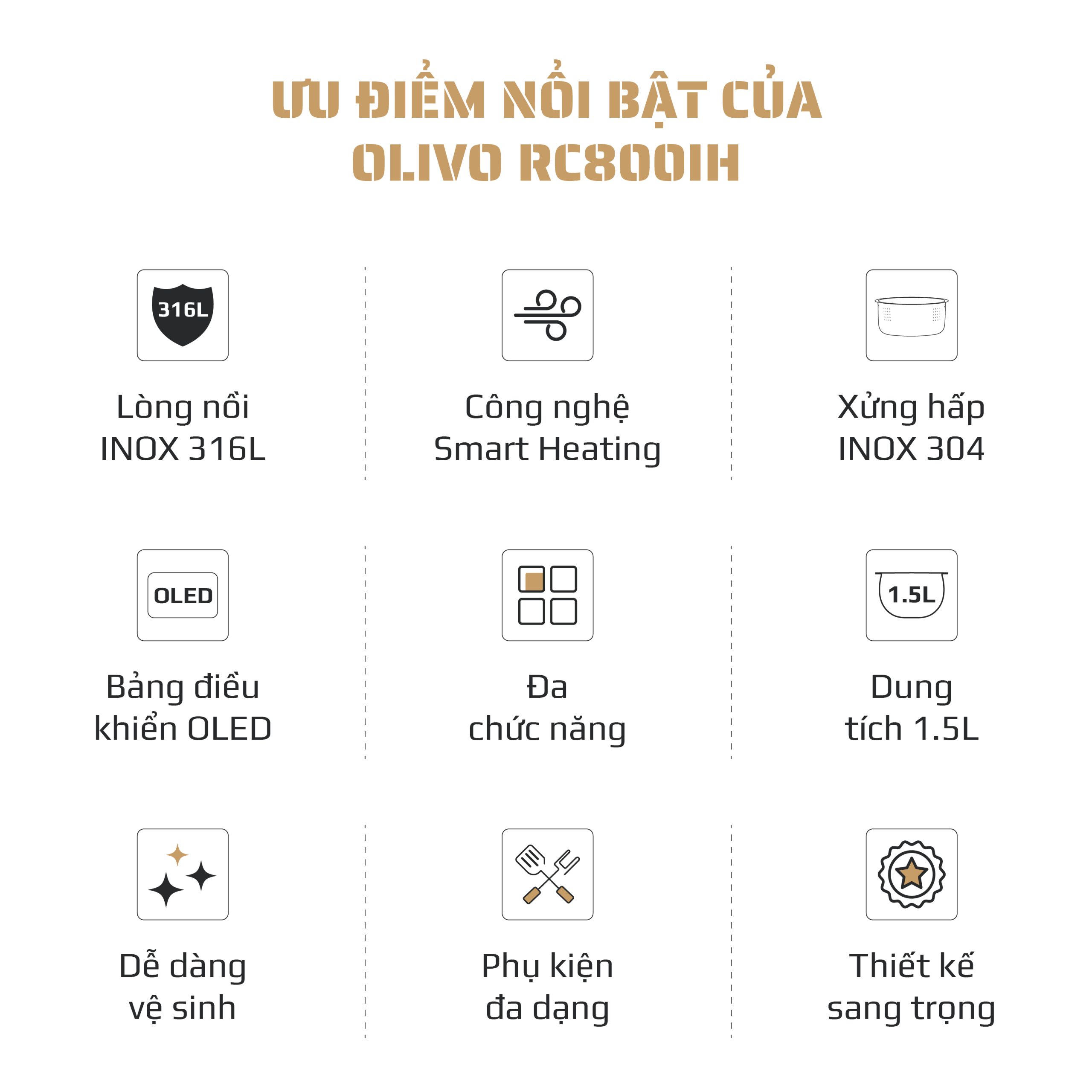 - Với nồi cơm điện cao tần OLIVO RC800IH, công nghệ không đơn thuần là sự tiện nghi, mà là cầu nối giữa hiện đại và ẩm thực truyền thống. Mỗi hạt cơm được nấu chín đều bằng công nghệ cao tần Smart Heating, lưu giữ vị ngọt tự nhiên của gạo, tái hiện cảm giác cơm bếp củi ngày xưa nhưng với sự chuẩn xác, tinh tế của thời đại mới.