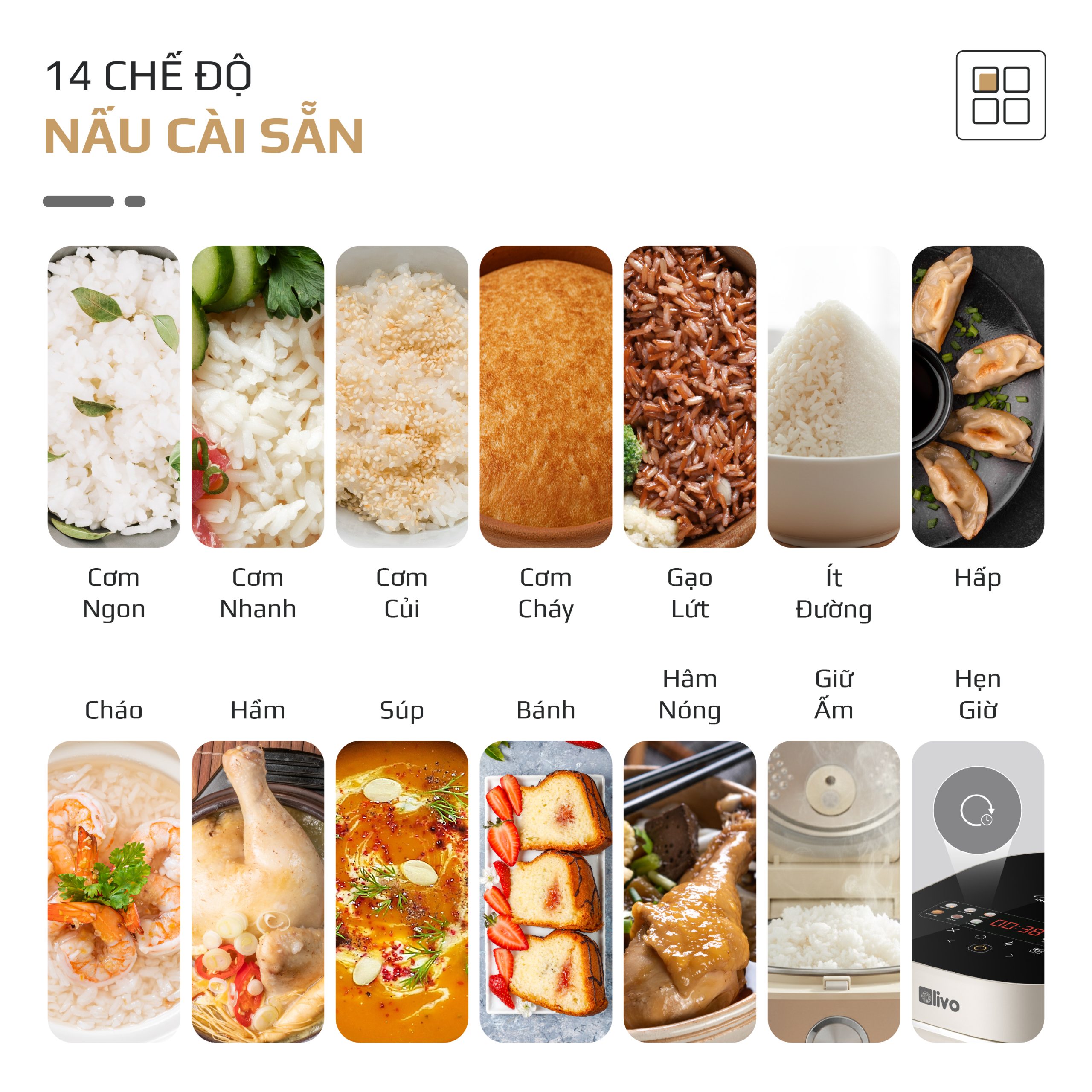 Nồi cơm điện cao tần OLIVO RC800IH được tích hợp 14 chế độ cài đặt sẵn, giúp bạn dễ dàng chế biến các món ăn yêu thích mà không cần tốn thêm bất kỳ dụng cụ nấu bếp nào khác.