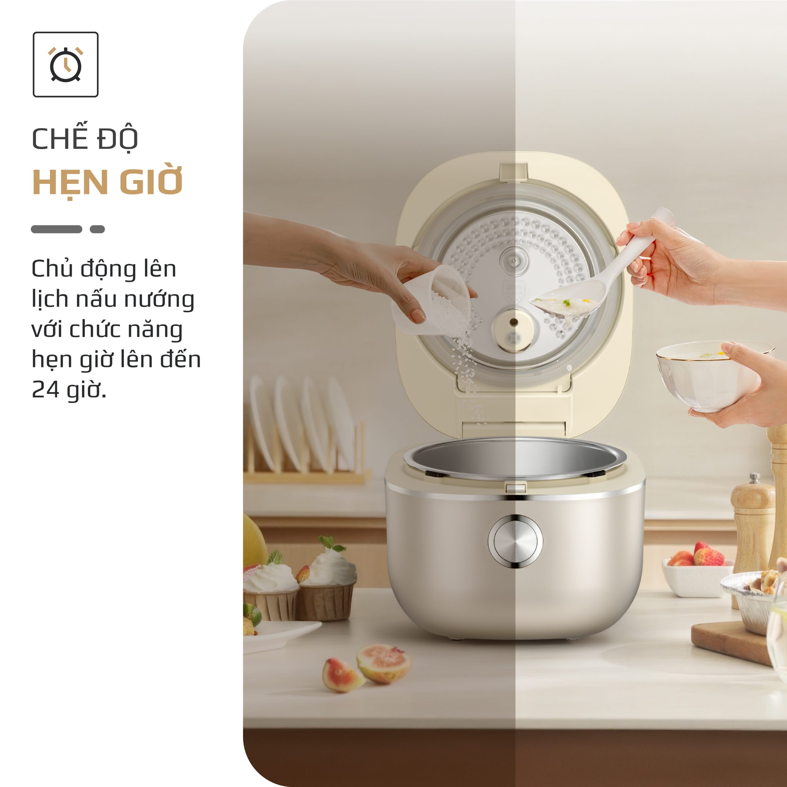 - Chỉ cần cài đặt trước thời gian nấu, nồi sẽ tự động bắt đầu và hoàn tất đúng giờ, mang đến sự tiện lợi tối đa và giúp bạn luôn yên tâm mỗi khi trở về nhà.