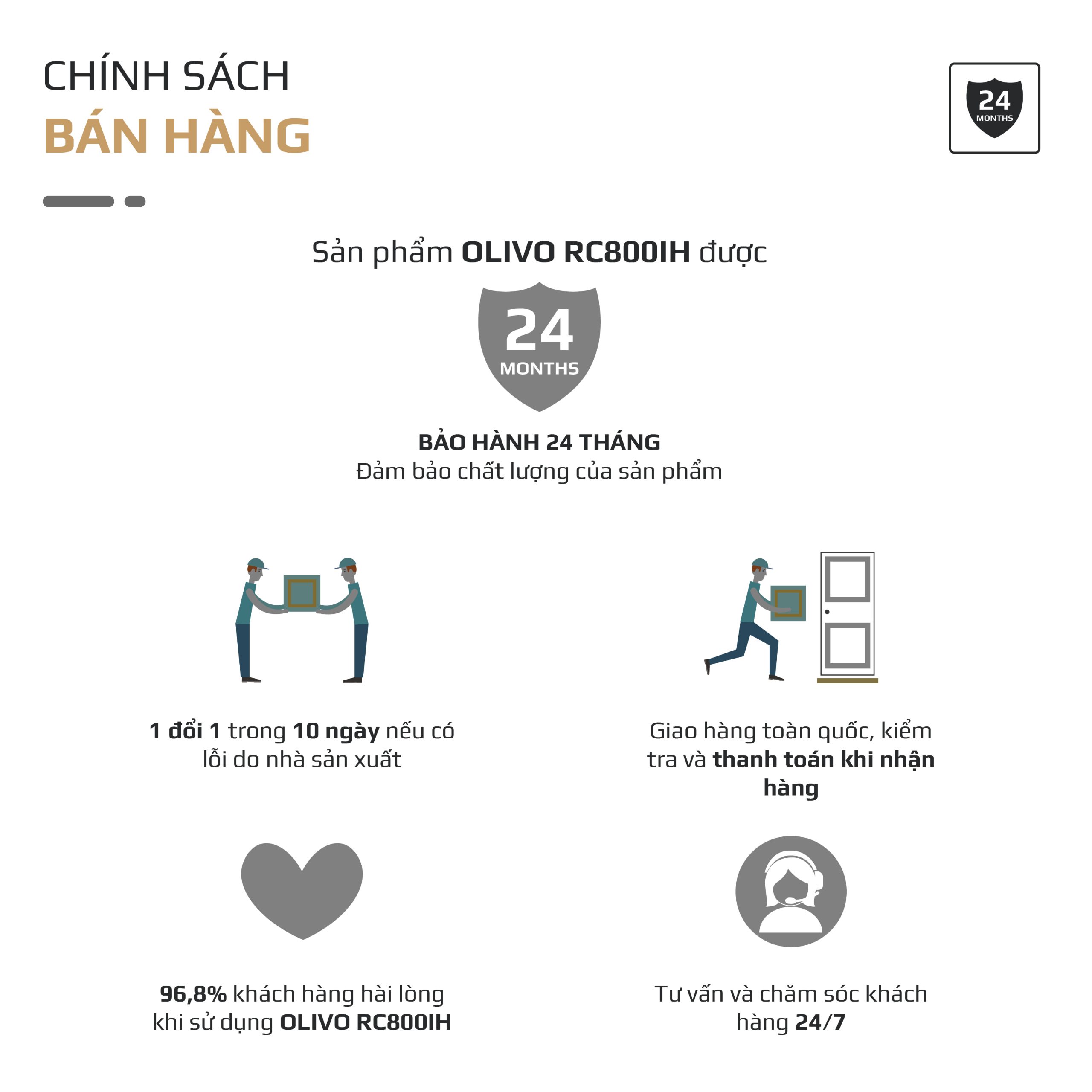 - OLIVO cam kết đồng hành lâu dài cùng khách hàng với chính sách bảo hành chính hãng 2 năm và bảo trì trọn đời. Trong thời gian bảo hành, sản phẩm được sửa chữa hoặc thay thế miễn phí nếu phát sinh lỗi kỹ thuật từ nhà sản xuất.