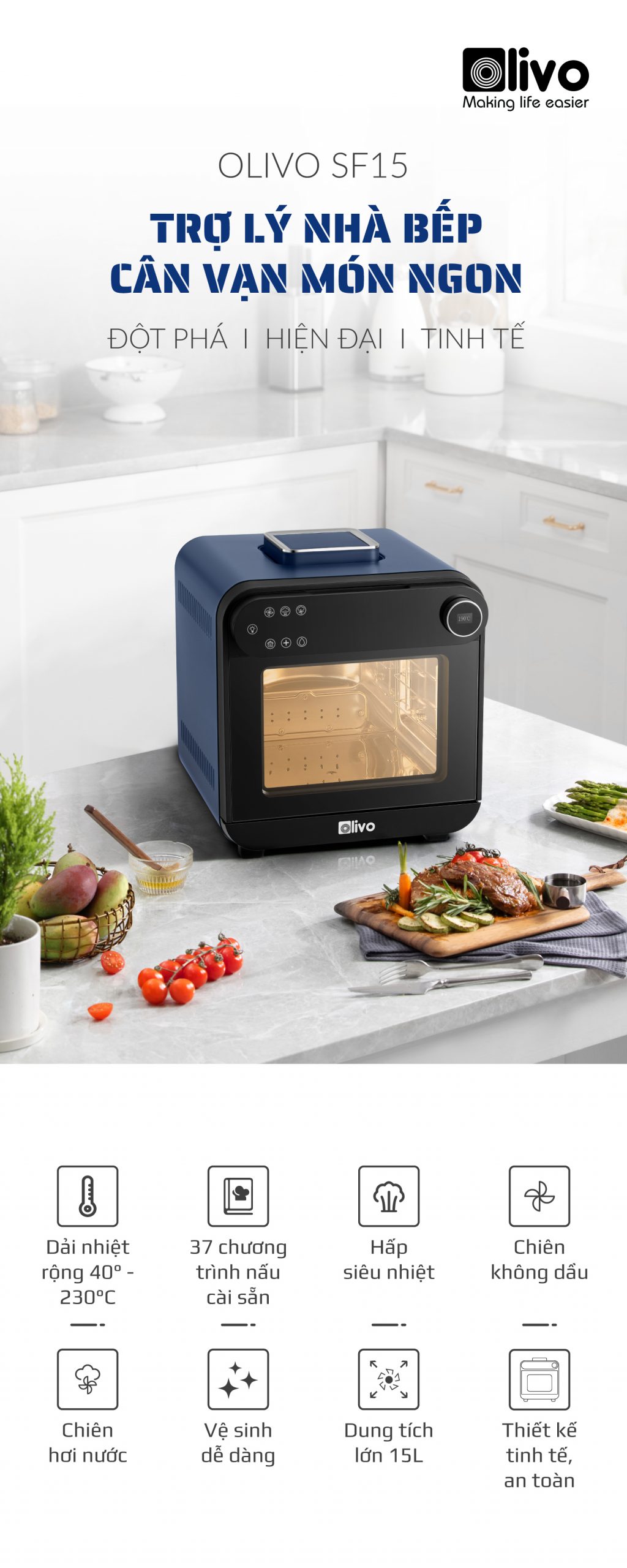 - Nồi Chiên Hơi Nước OLIVO SF15 là sản phẩm nồi chiên hơi nước thế hệ mới nhất của OLIVO – Thương hiệu gia dụng cao cấp đến từ Mỹ. Đây là dòng sản phẩm mang tính đột phá, bùng nổ công nghệ với sự kết hợp giữa nồi chiên không dầu và nồi hấp mang đến sự tiện lợi cho khách hàng. Đặc biệt có những tính năng chỉ có trên OLIVO SF15 mà chưa từng có trên bất kỳ sản phẩm cùng loại nào trên thị trường.