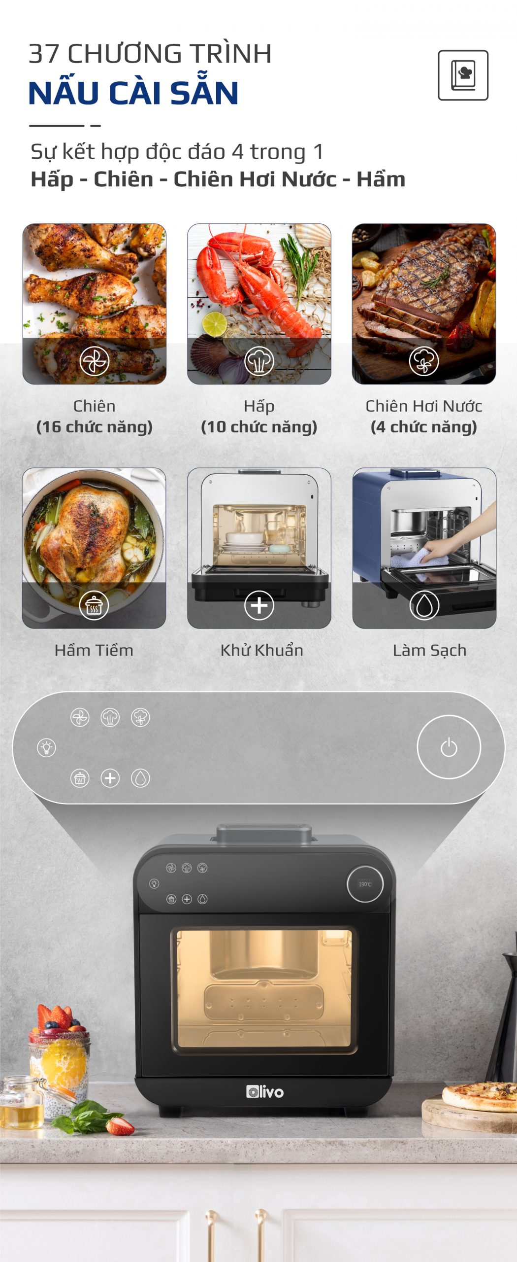- OLIVO mang lại sự đột phá về công nghệ hết sức độc đáo khi kết hợp những tính năng như Hấp – Chiên không dầu – Chiên Hấp kết hợp – Hầm chỉ trong một sản phẩm duy nhất OLIVO SF15.