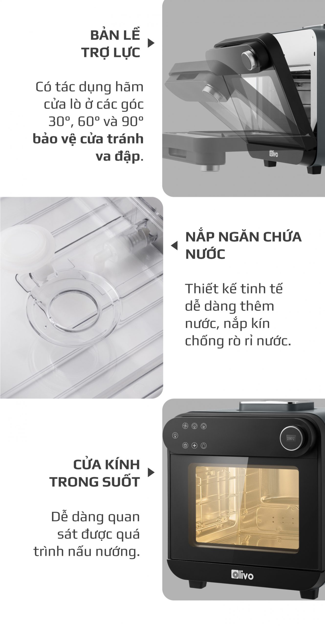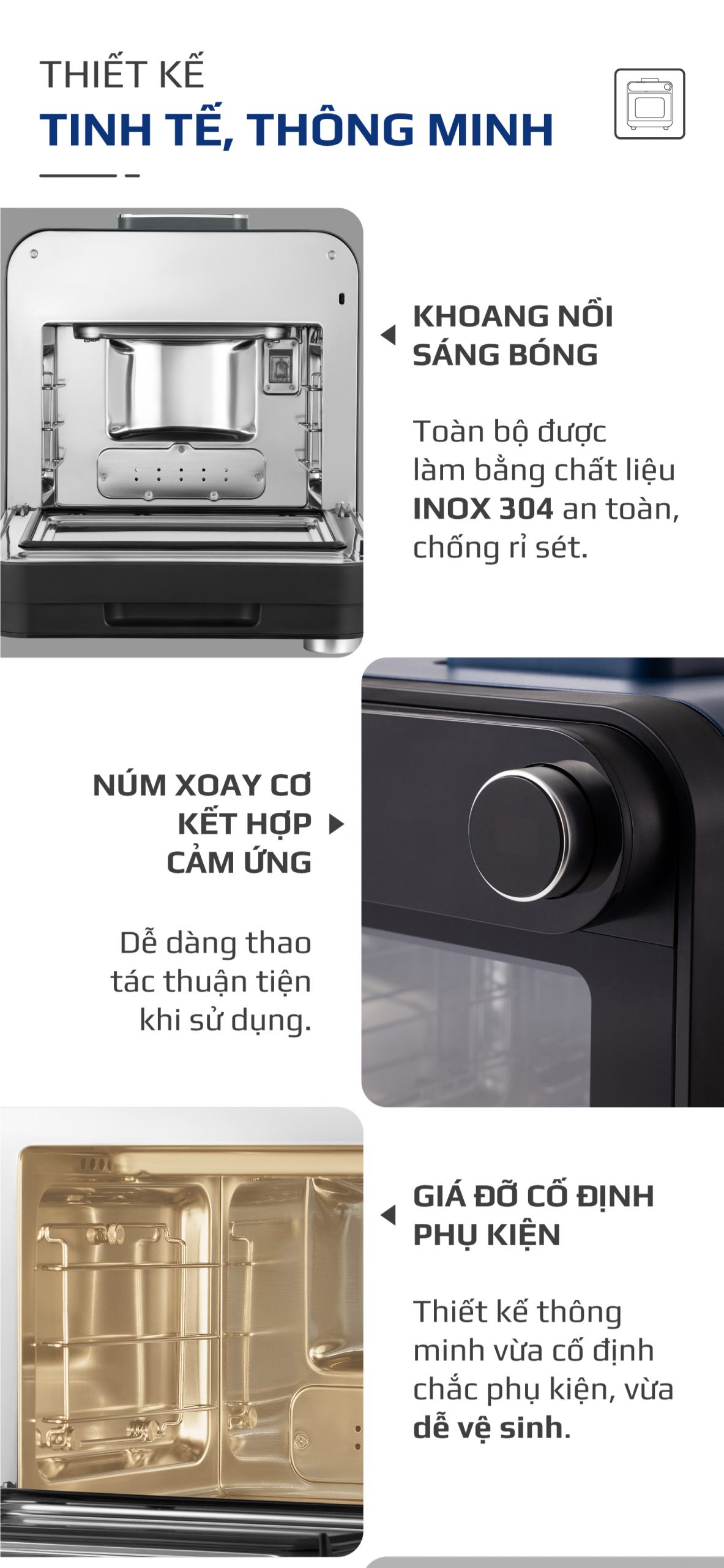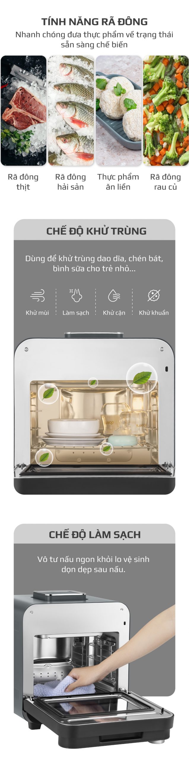 - Với công nghệ phun hơi nước siêu nhiệt giúp món ăn chín đều, giữ được độ mềm ẩm và vị ngọt tự nhiên của thực phẩm.