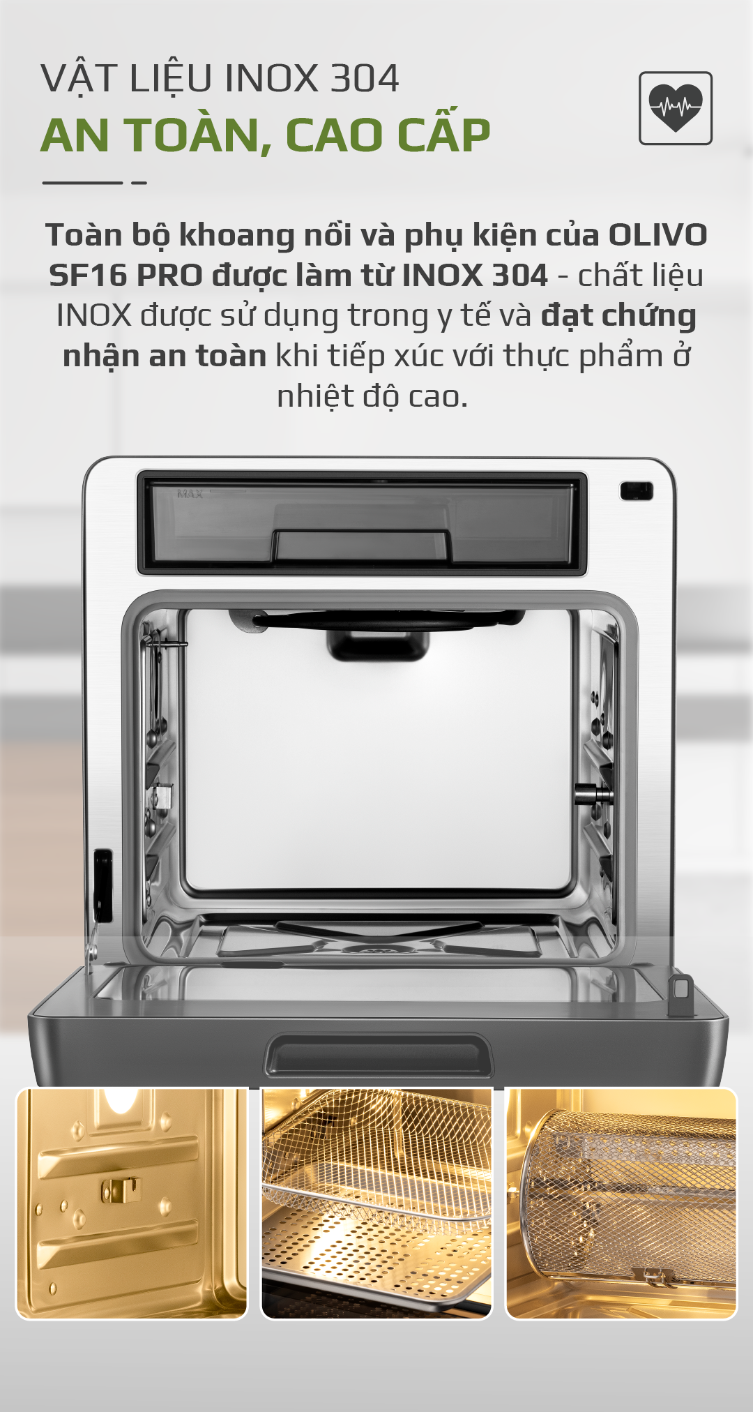 Toàn bộ khoang nồi và phụ kiện của OLIVO SF16 PRO được làm từ Inox 304 cao cấp, đạt chuẩn an toàn thực phẩm, chịu nhiệt tốt, không thôi nhiễm hóa chất, an toàn tuyệt đối cho sức khỏe người dùng.
