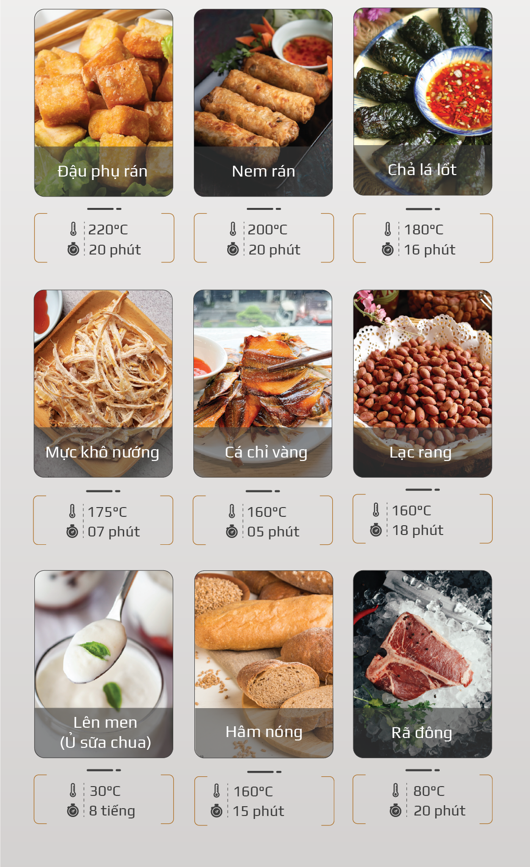 Bạn có thể chiên, hấp, nướng, hầm, sấy, làm bánh, ủ sữa chua… và nhiều món Việt quen thuộc như gà quay, cá nướng, chả lá lốt, nem rán, thịt kho tàu. Với 70 chế độ cài sẵn, chỉ cần chọn món, nồi sẽ tự động nấu.