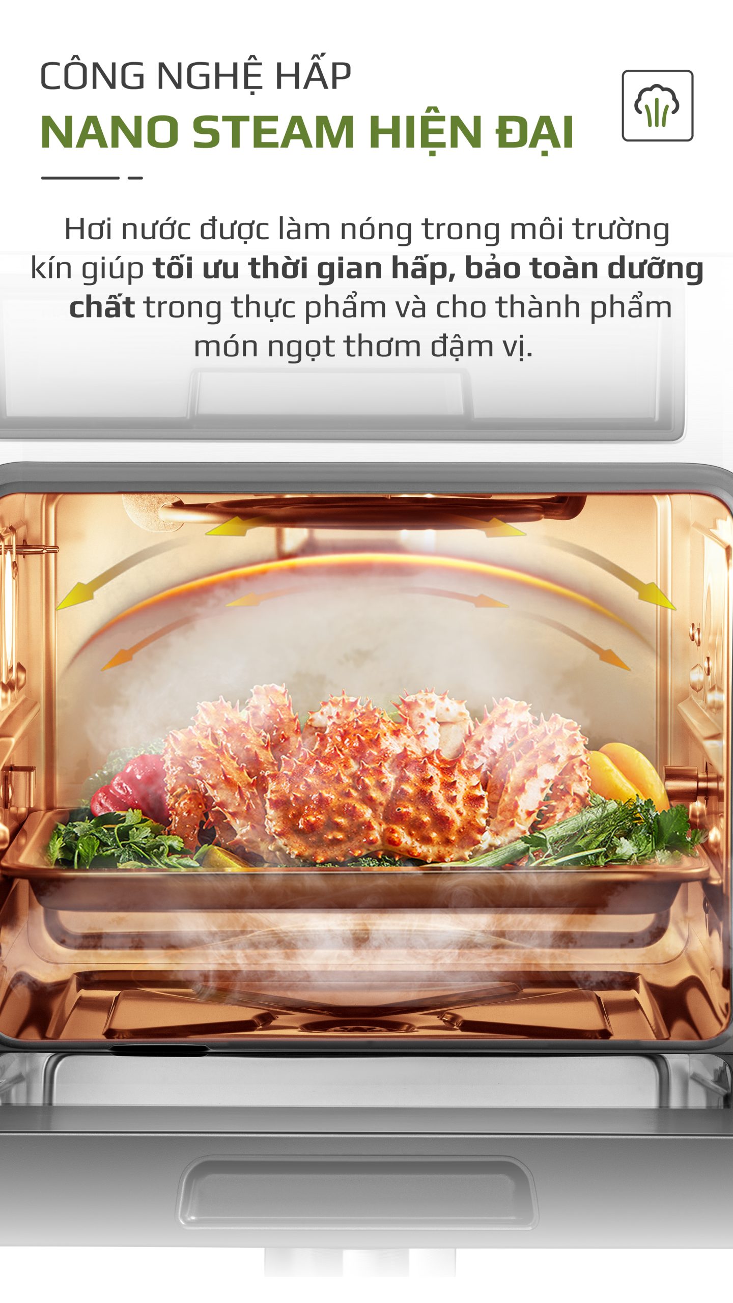 • Công nghệ chiên không dầu chiên đồ ăn vàng giòn mà không cần dùng đến dầu mỡ, giảm đến 95% lượng dầu mỡ dư thừa trong bữa ăn hàng ngày. Trong khi đó, hấp đồ ăn bằng hơi nước siêu nhiệt giúp giảm thời gian hấp, đồng thời bảo toàn tối đa dinh dưỡng có trong thực phẩm.