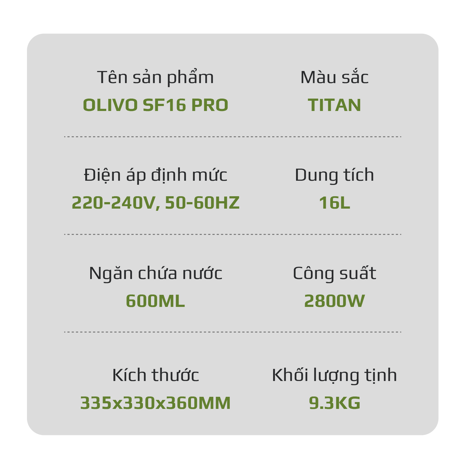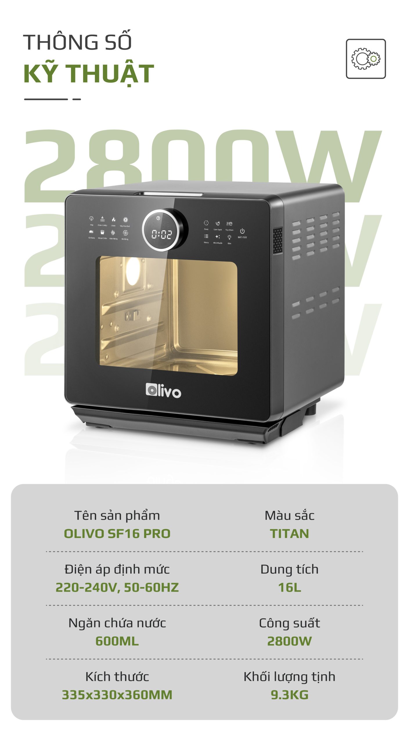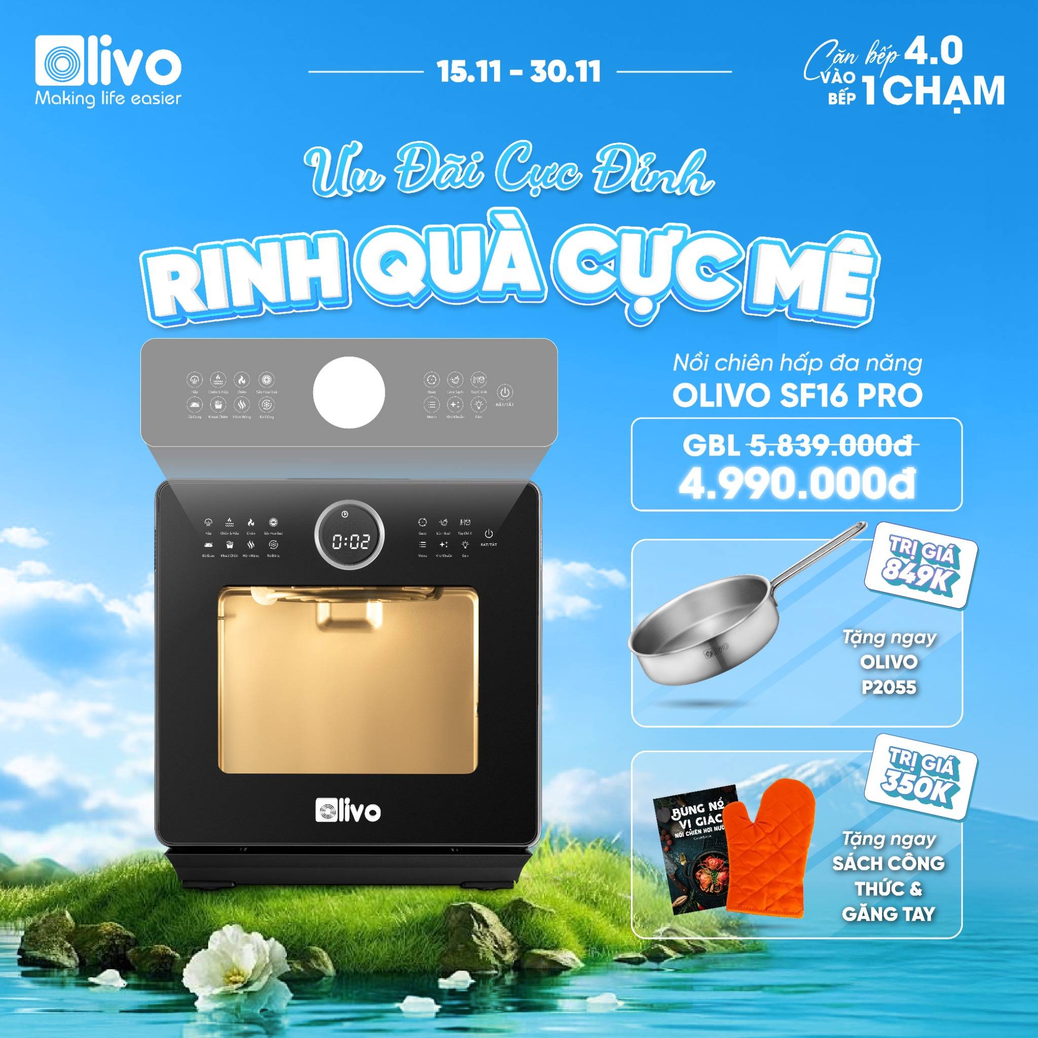 - Nồi chiên hấp OLIVO SF16 PRO là sản phẩm nồi chiên hơi nước đến từ thương hiệu OLIVO. Phiên bản mới cải tiến vượt trội với bộ phụ kiện đa dạng thêm xiên quay và lồng đảo đa năng tiện lợi. Đây sẽ là trợ thủ đắc lực cho người làm nội trợ trong công việc bếp núc.