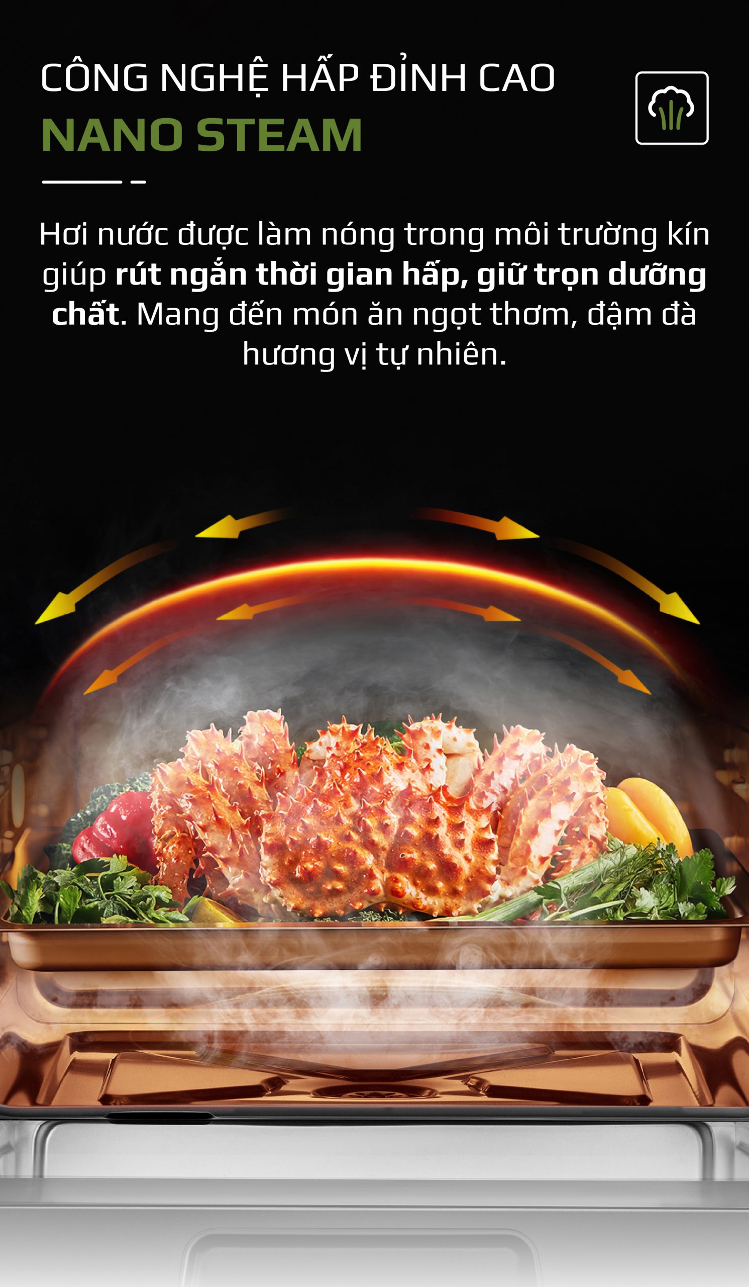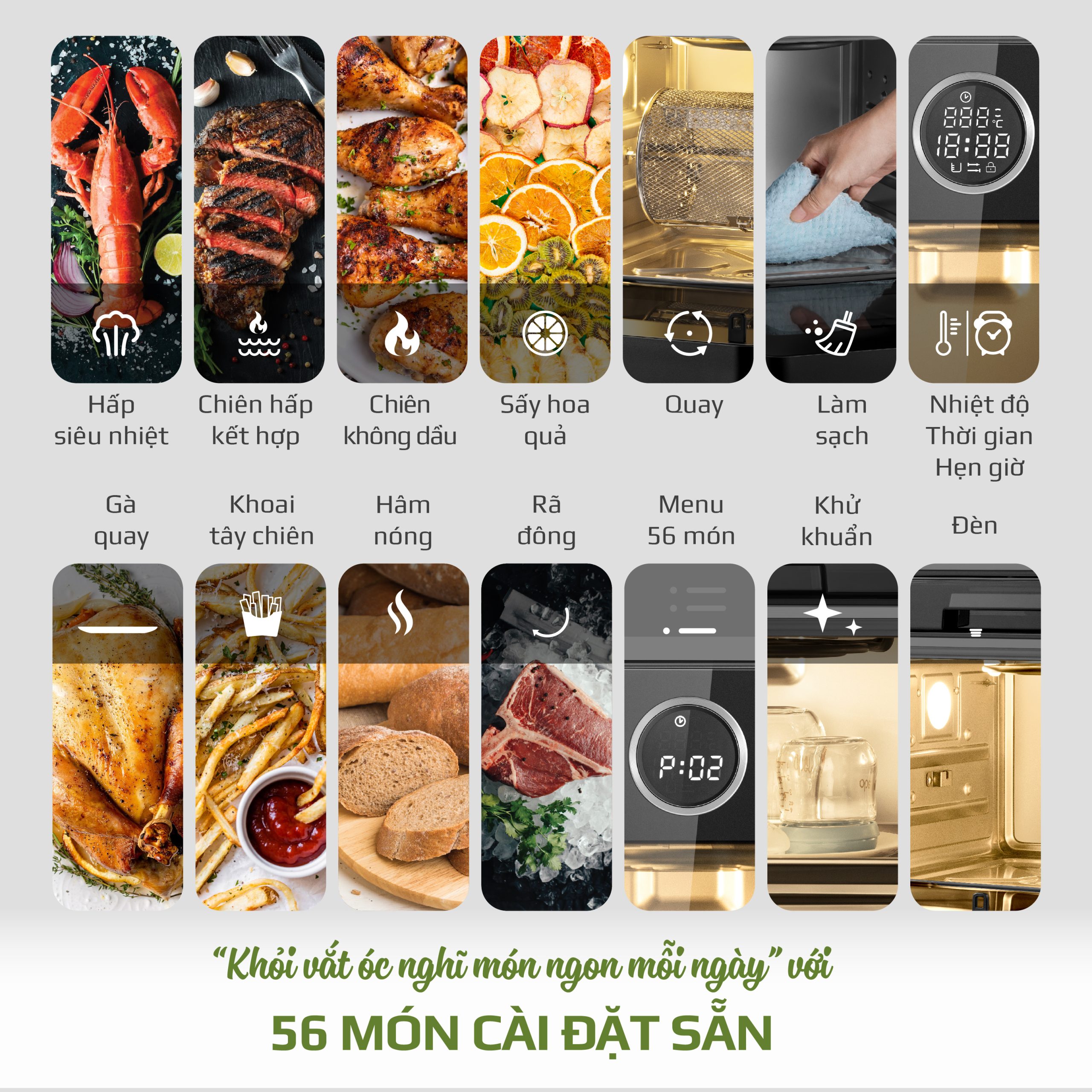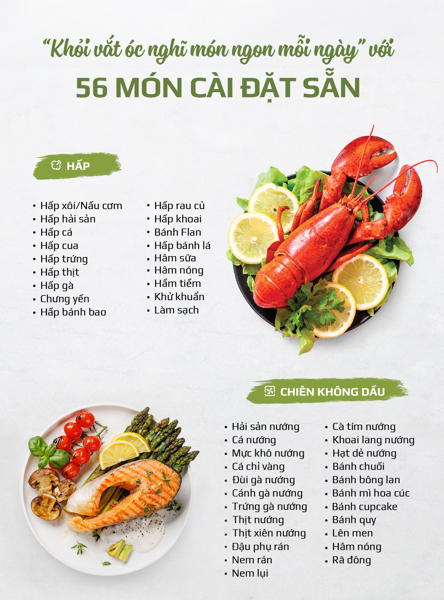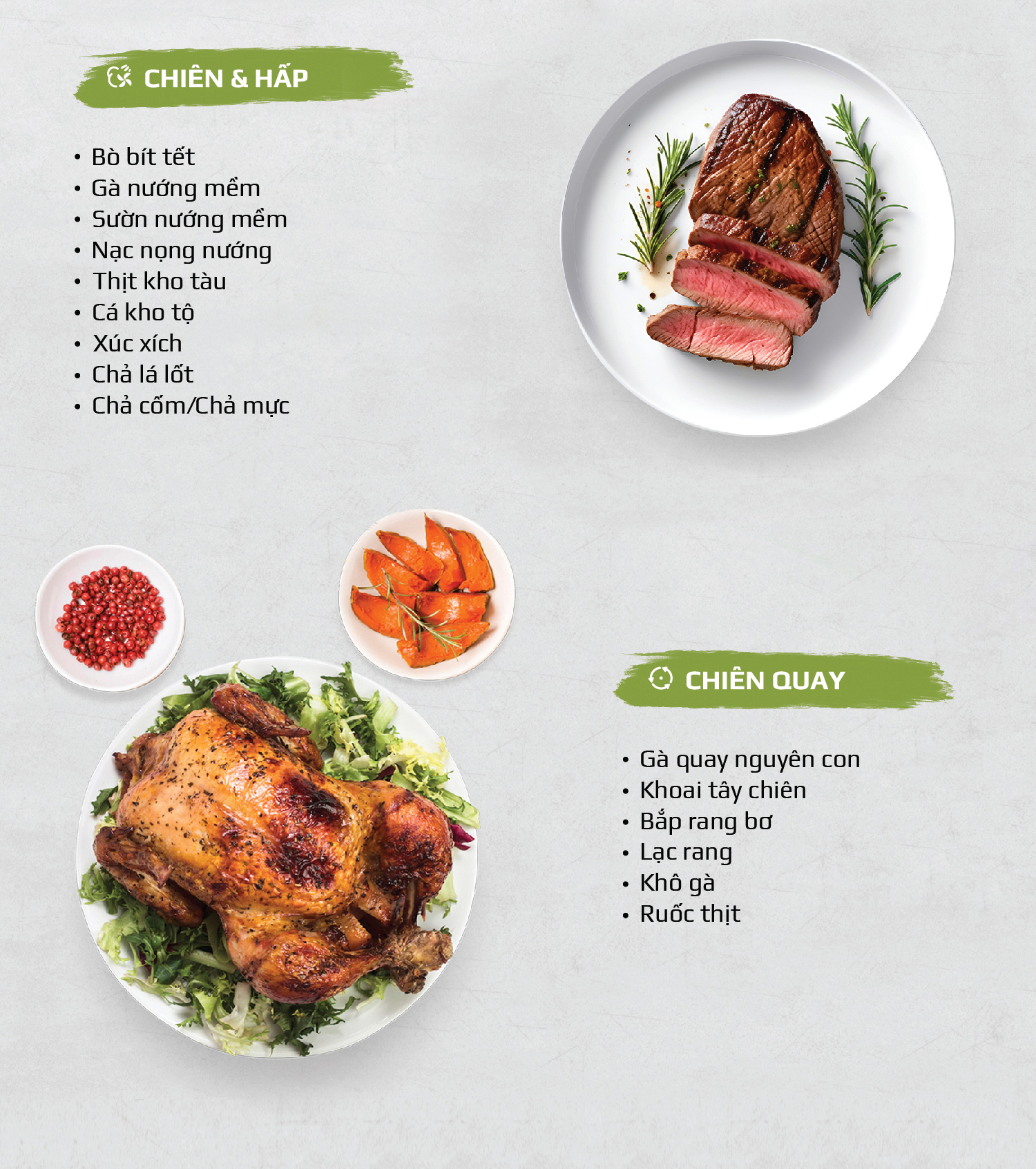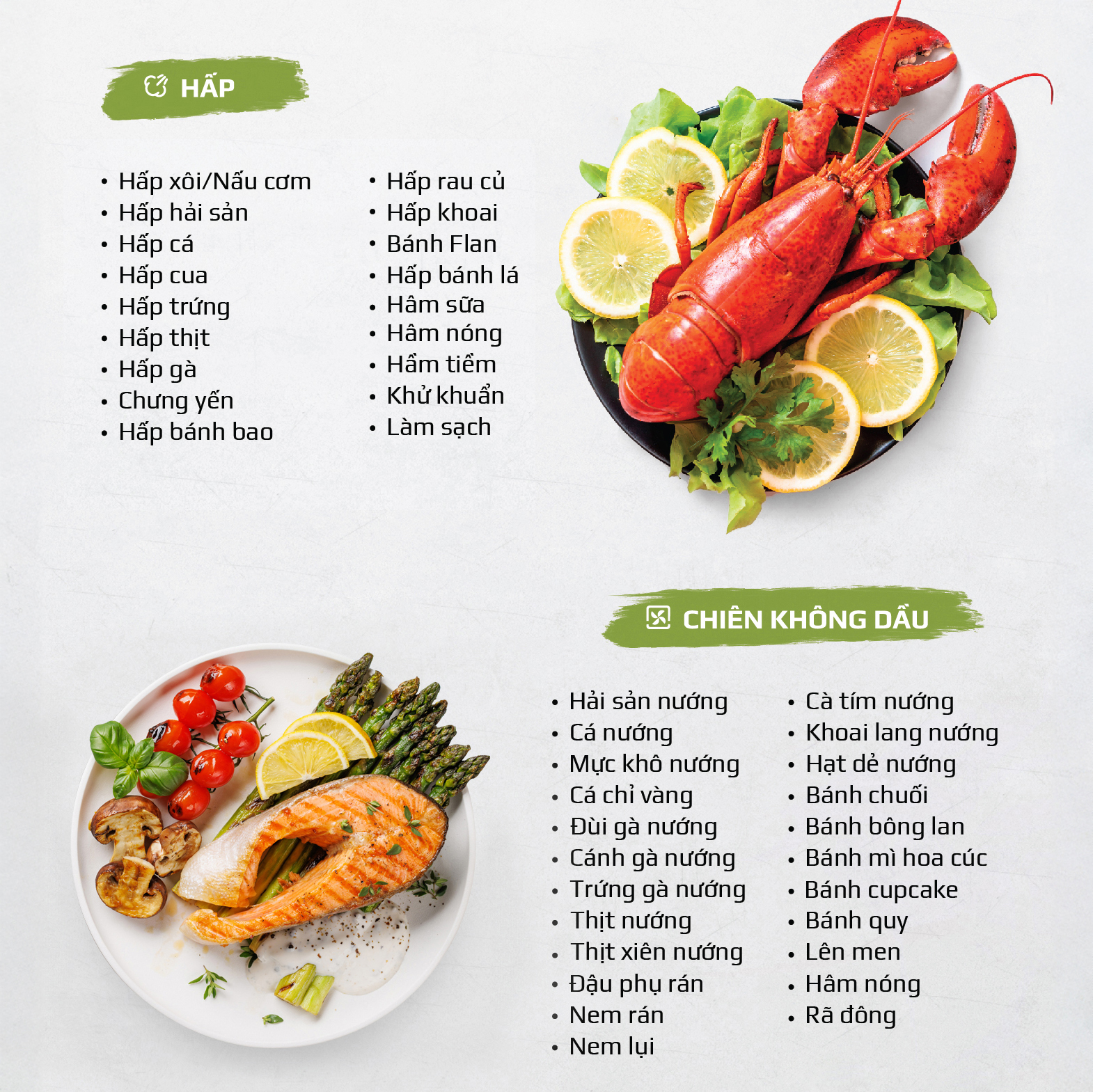 - Công nghệ chiên không dầu chiên đồ ăn vàng giòn mà không cần dùng đến dầu mỡ, giảm đến 95% lượng dầu mỡ dư thừa trong bữa ăn hàng ngày. Trong khi đó, hấp đồ ăn bằng hơi nước siêu nhiệt giúp giảm thời gian hấp, đồng thời bảo toàn tối đa dinh dưỡng có trong thực phẩm.