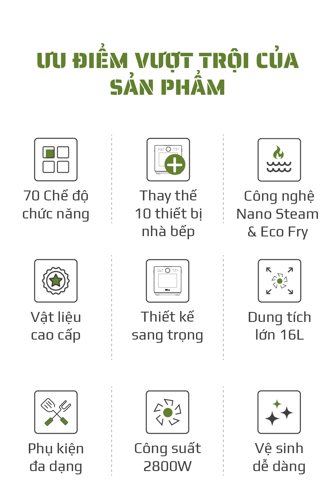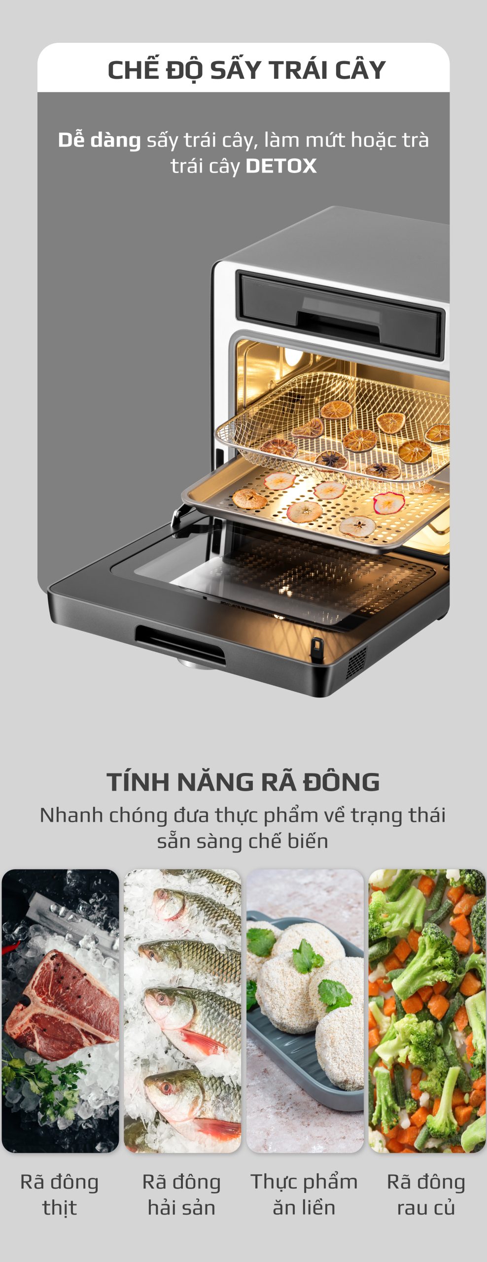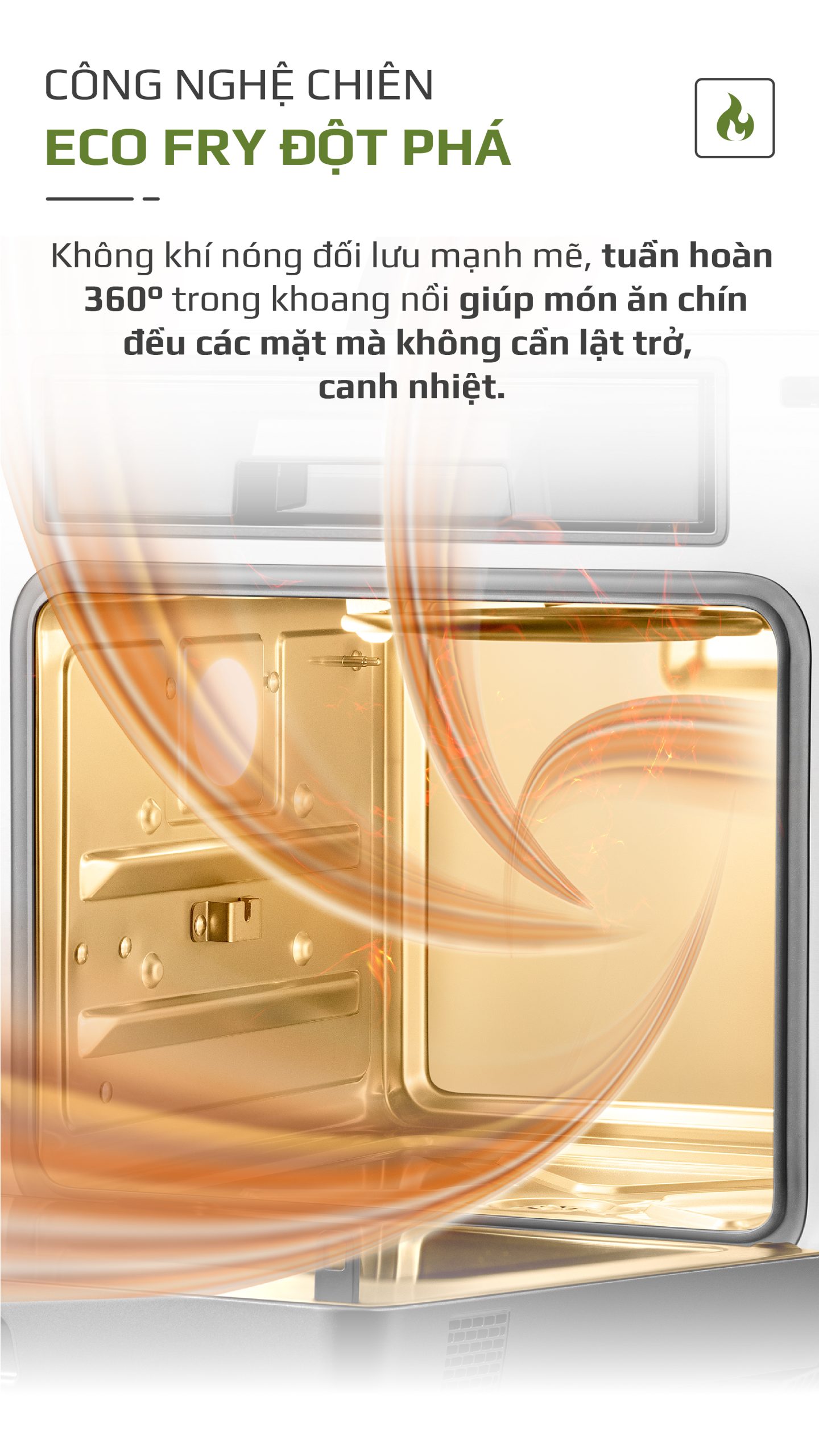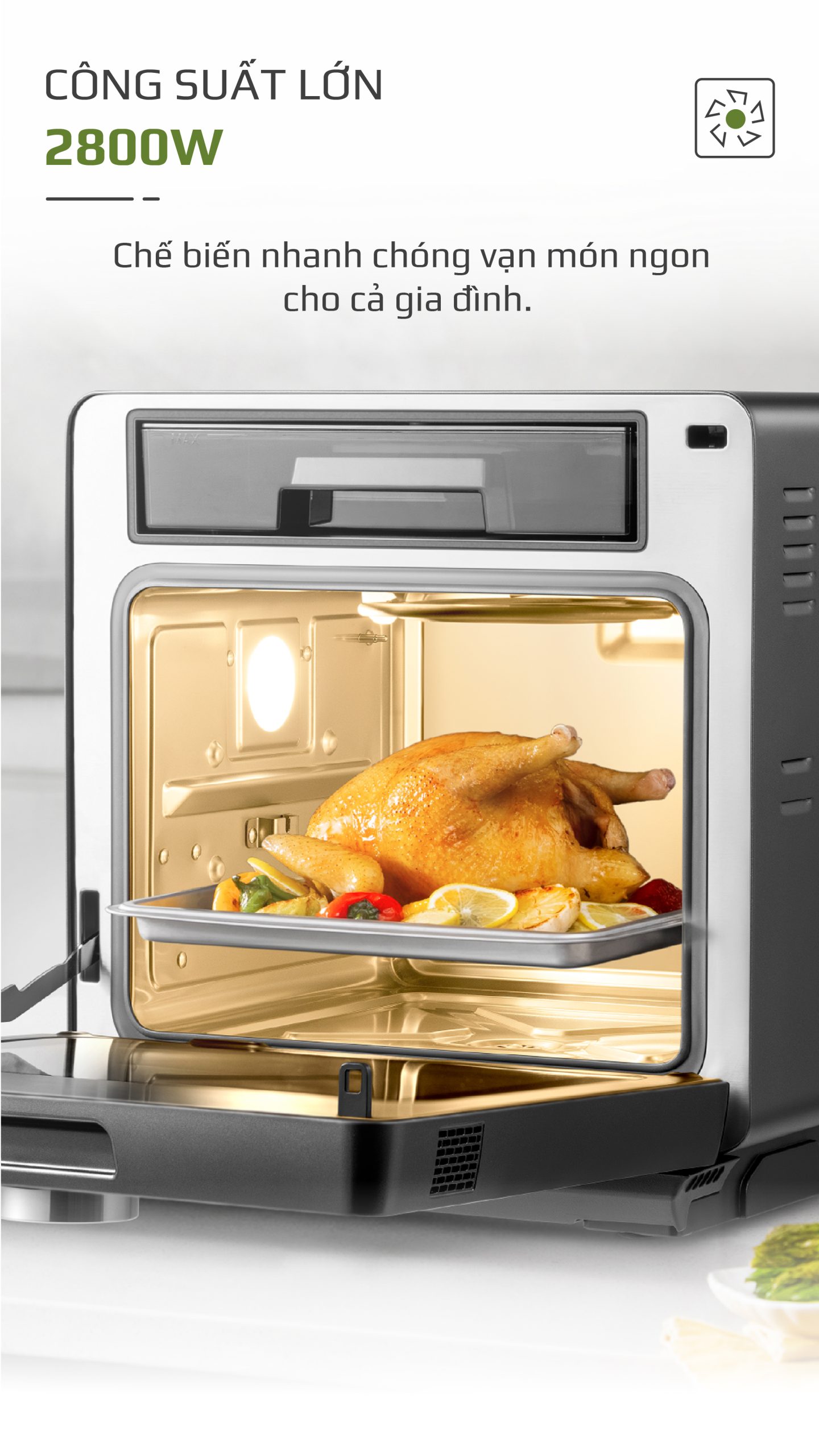 - Công nghệ chiên không dầu chiên đồ ăn vàng giòn mà không cần dùng đến dầu mỡ, giảm đến 95% lượng dầu mỡ dư thừa trong bữa ăn hàng ngày. Trong khi đó, hấp đồ ăn bằng hơi nước siêu nhiệt giúp giảm thời gian hấp, đồng thời bảo toàn tối đa dinh dưỡng có trong thực phẩm.