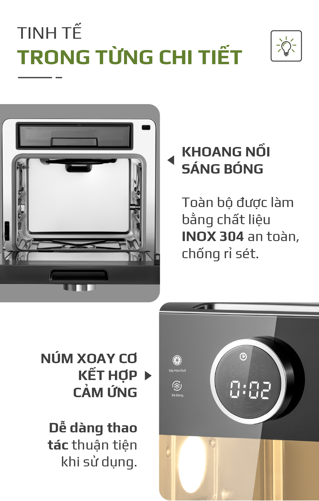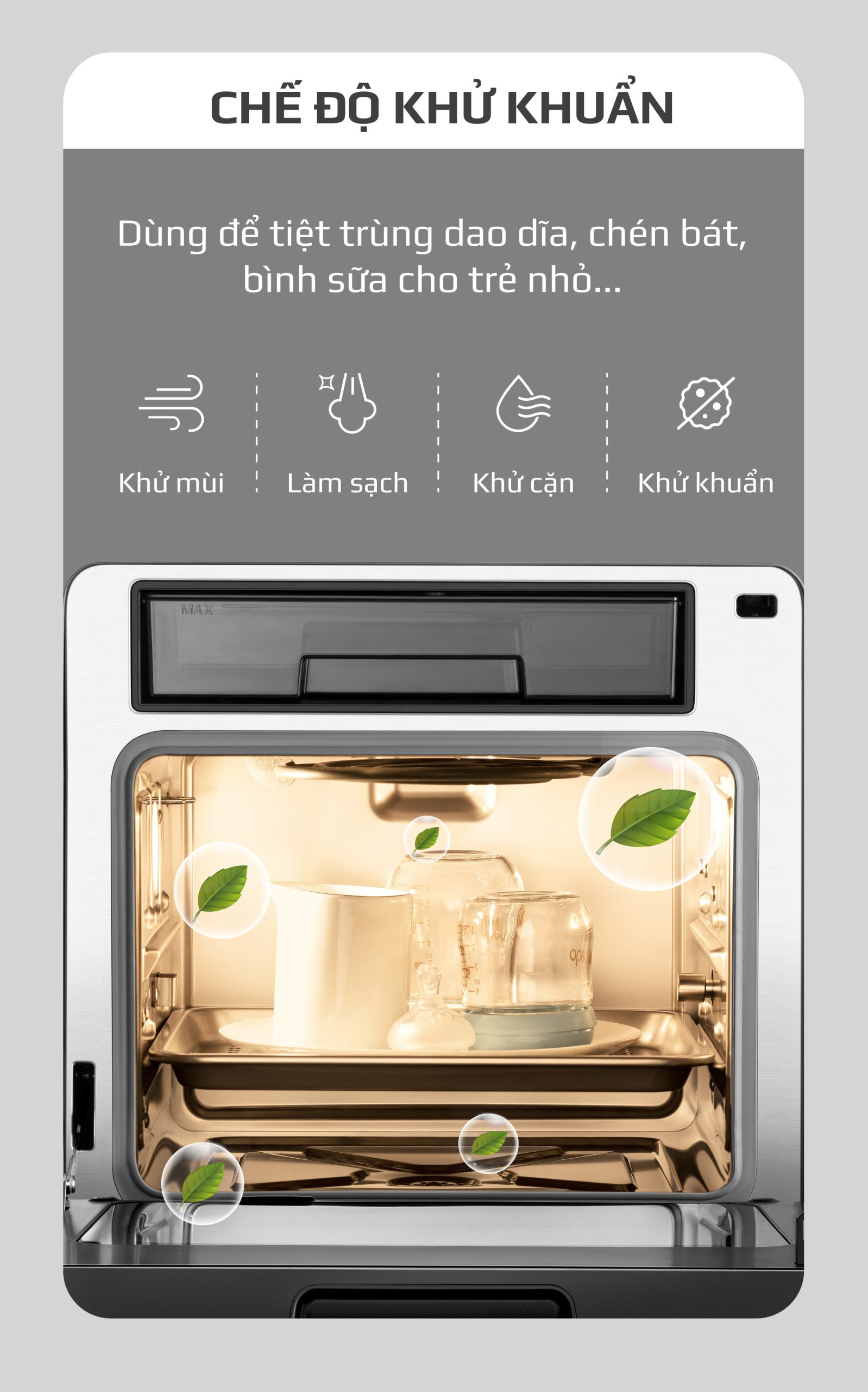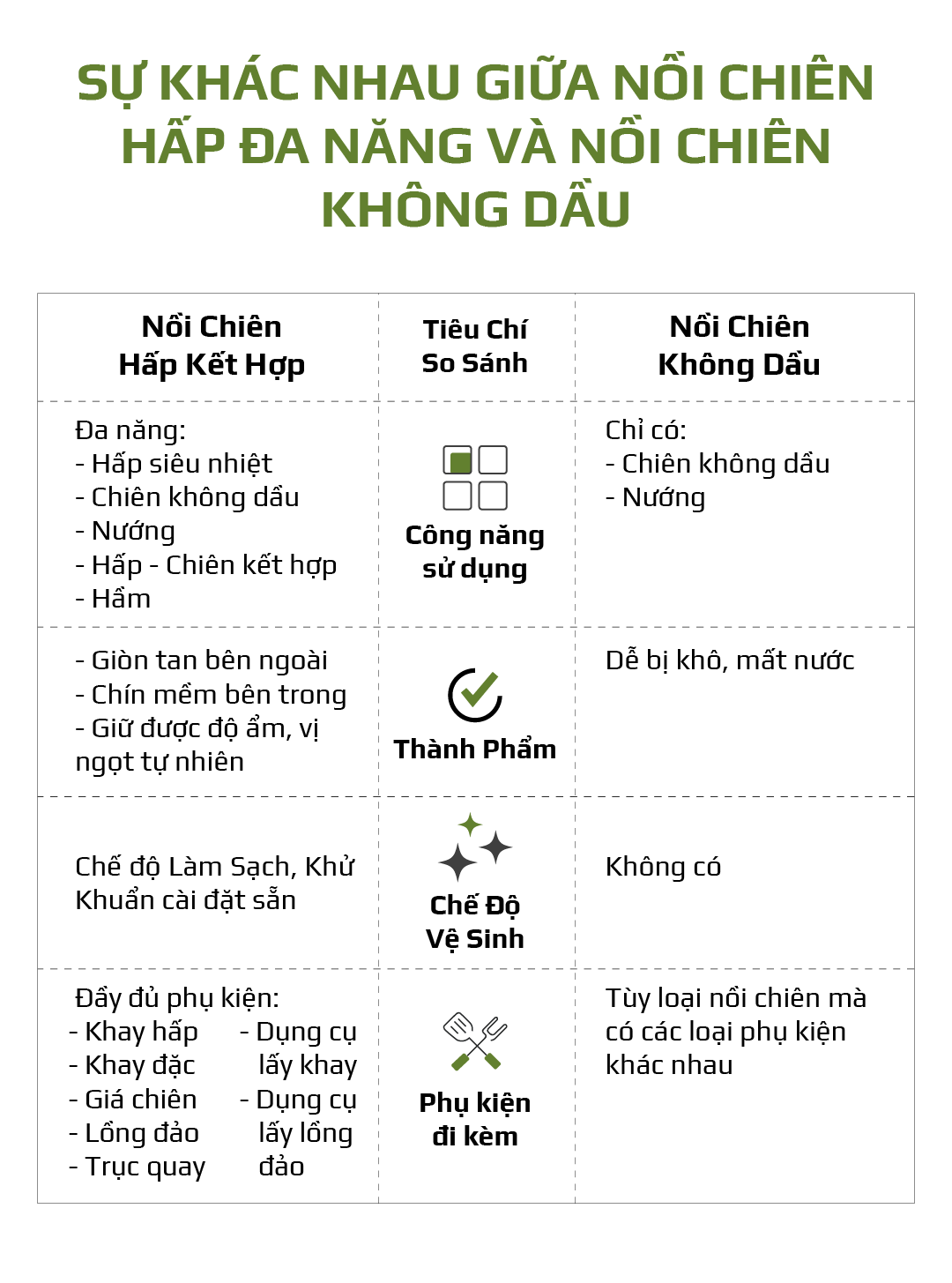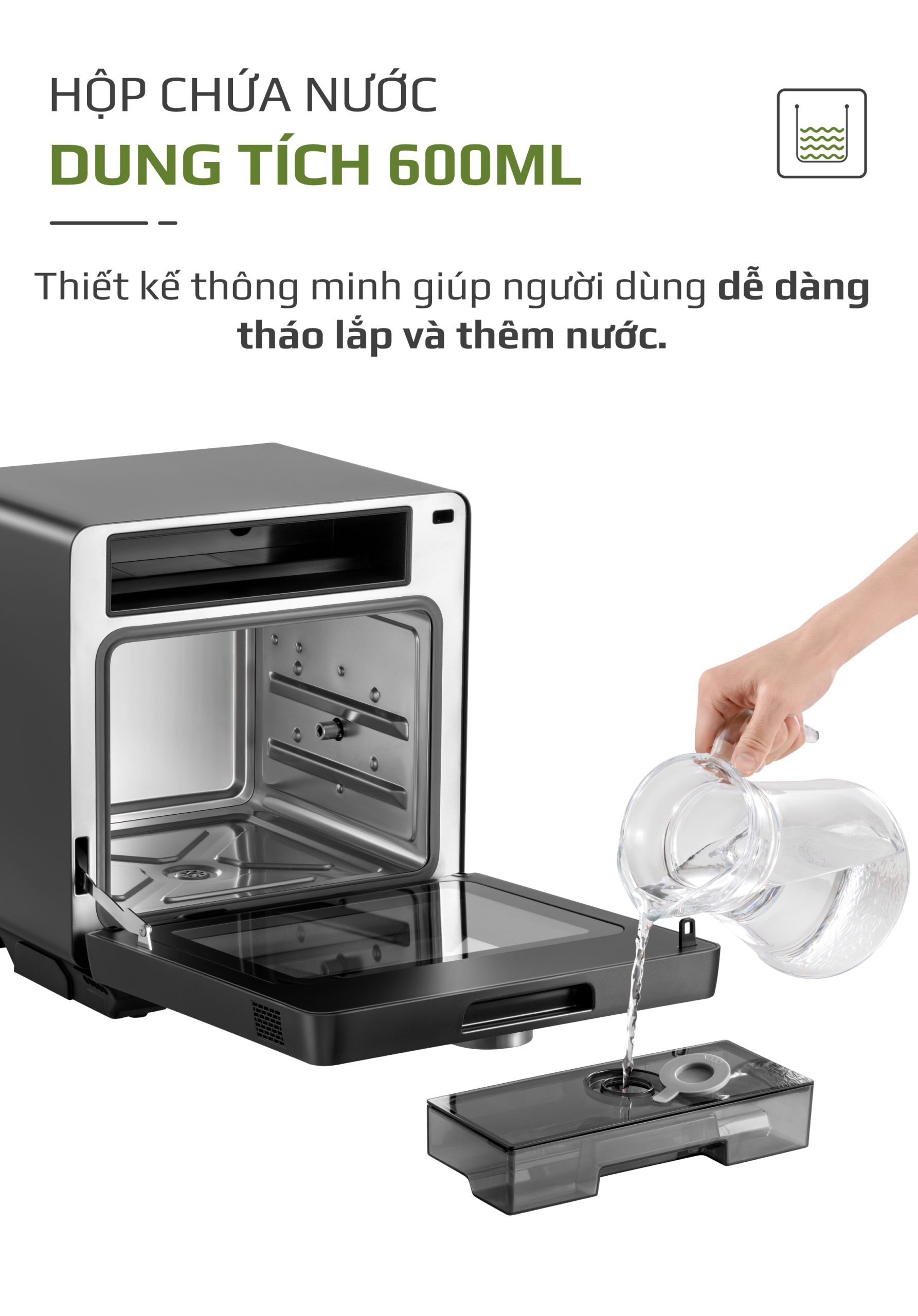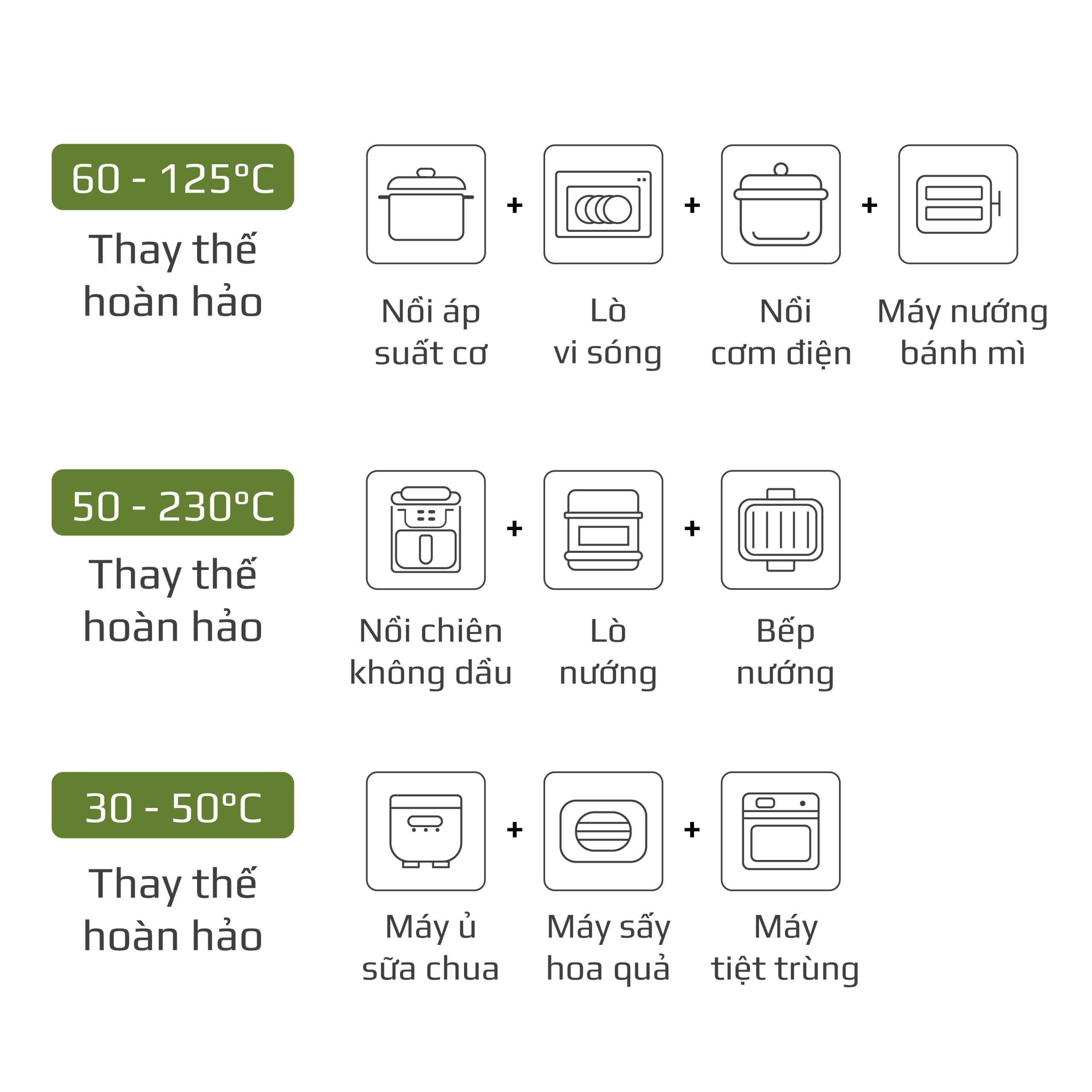 - Công nghệ chiên không dầu chiên đồ ăn vàng giòn mà không cần dùng đến dầu mỡ, giảm đến 95% lượng dầu mỡ dư thừa trong bữa ăn hàng ngày. Trong khi đó, hấp đồ ăn bằng hơi nước siêu nhiệt giúp giảm thời gian hấp, đồng thời bảo toàn tối đa dinh dưỡng có trong thực phẩm.