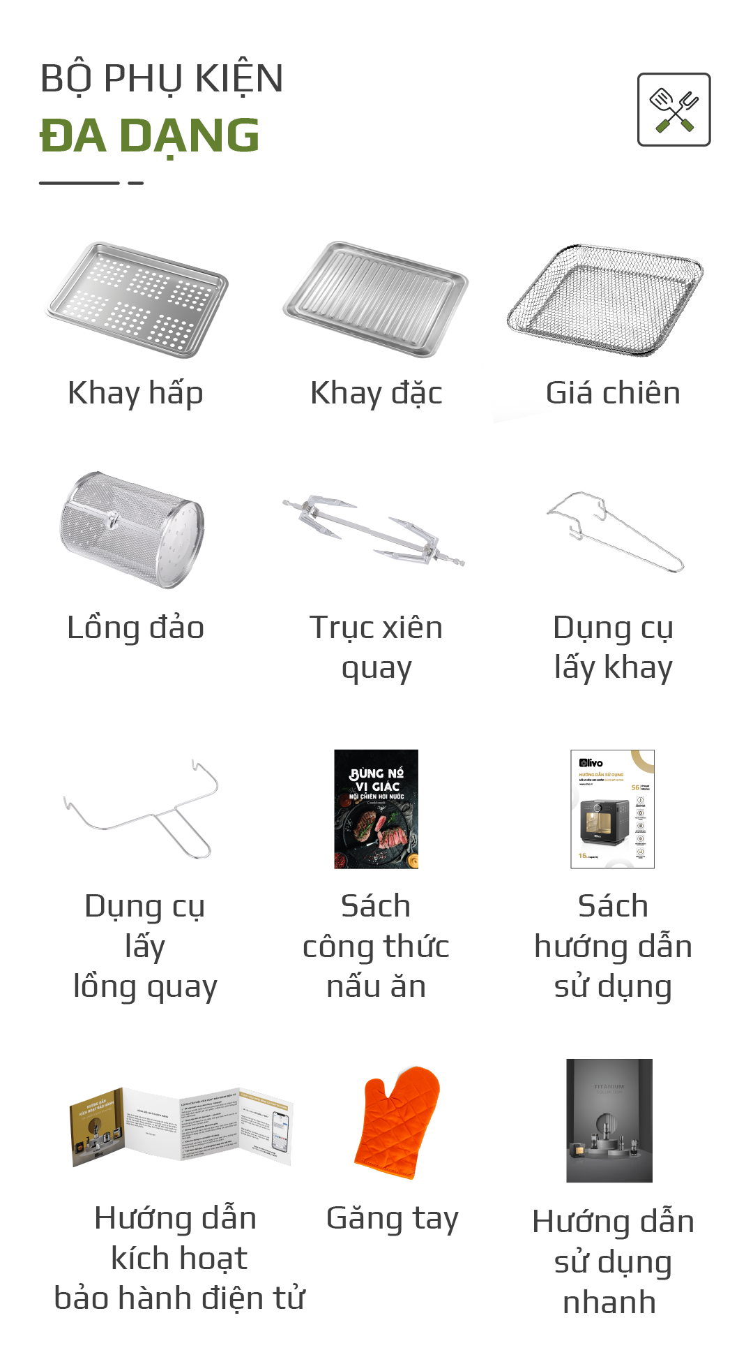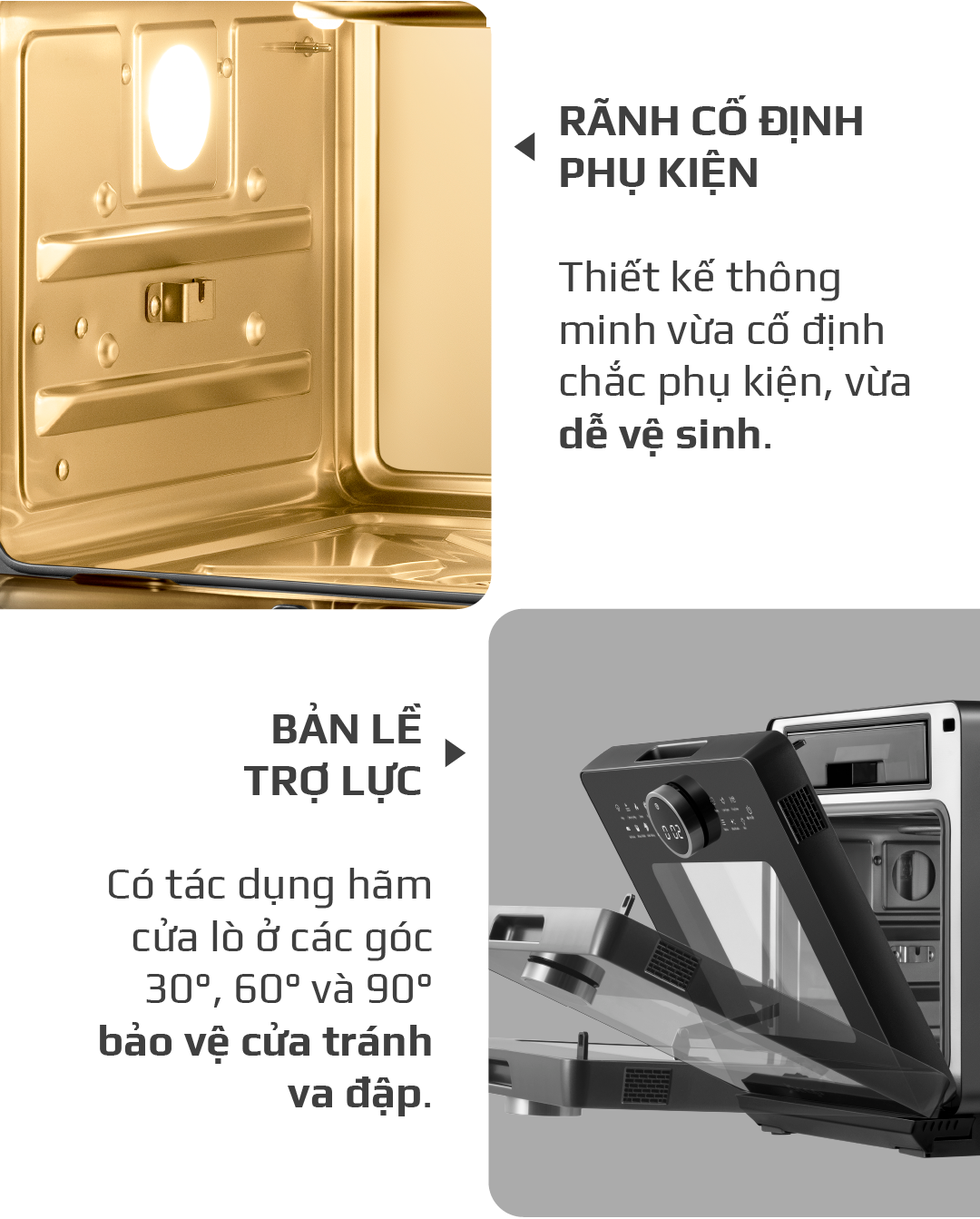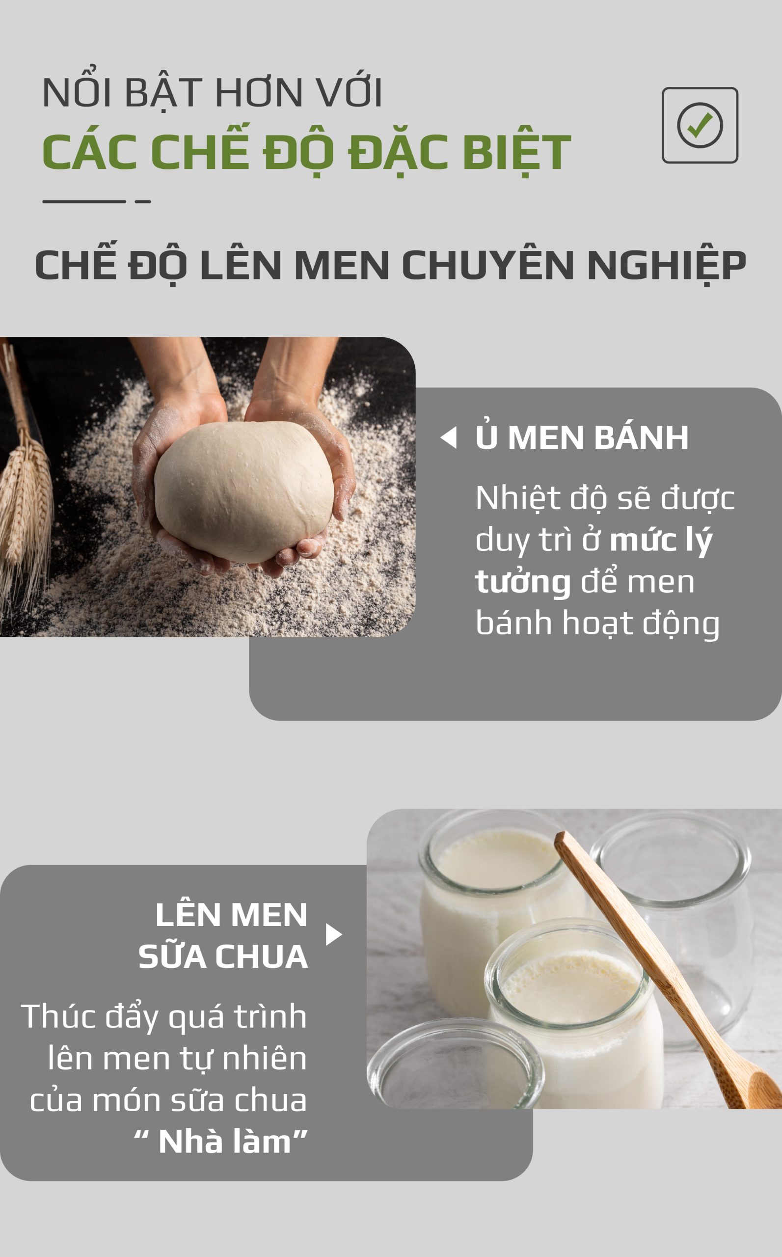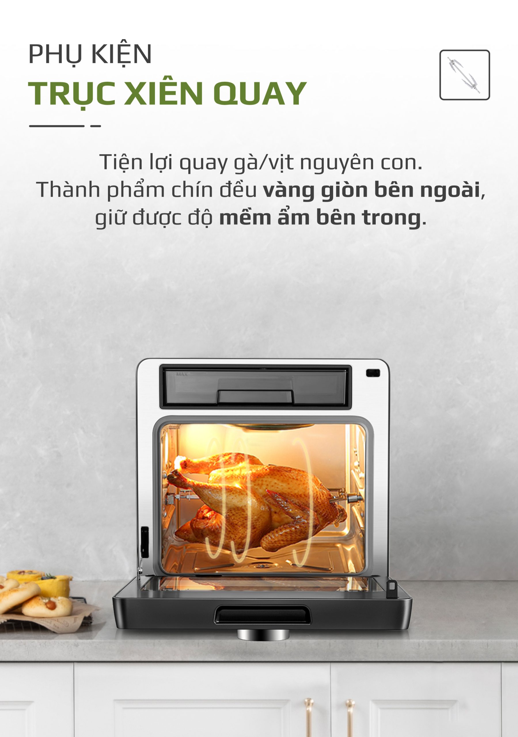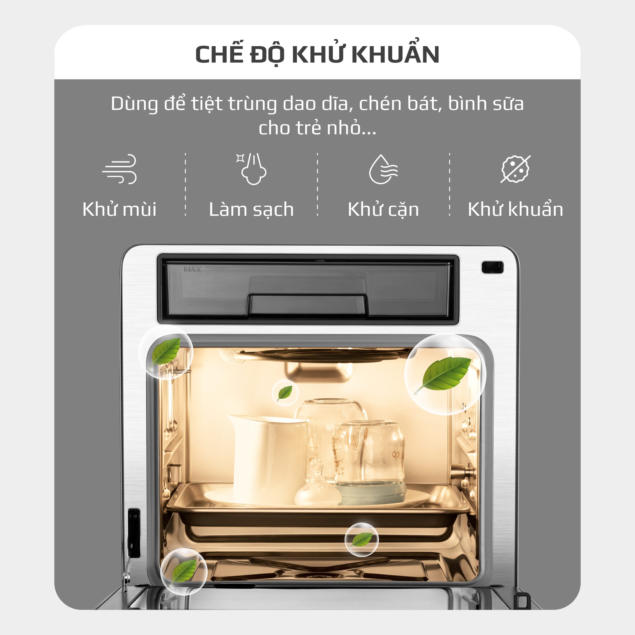 - Công nghệ chiên không dầu chiên đồ ăn vàng giòn mà không cần dùng đến dầu mỡ, giảm đến 95% lượng dầu mỡ dư thừa trong bữa ăn hàng ngày. Trong khi đó, hấp đồ ăn bằng hơi nước siêu nhiệt giúp giảm thời gian hấp, đồng thời bảo toàn tối đa dinh dưỡng có trong thực phẩm.