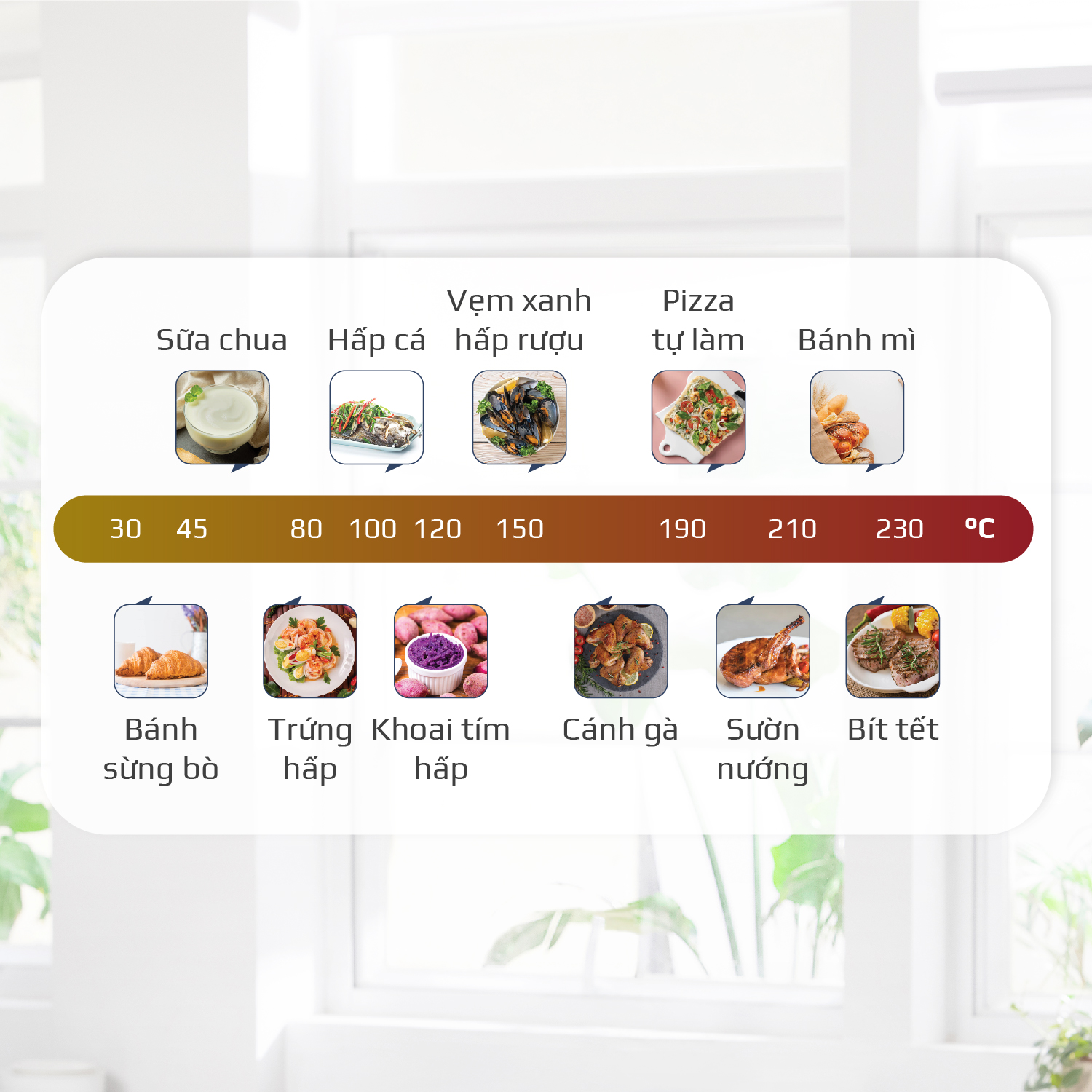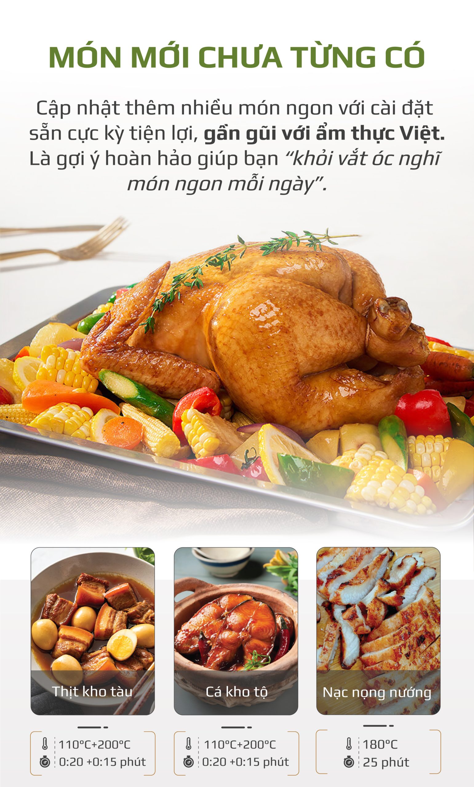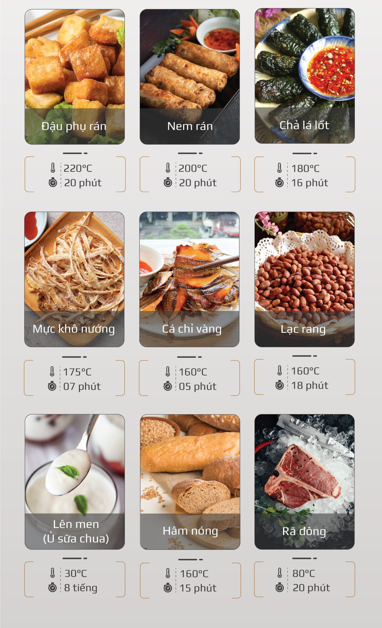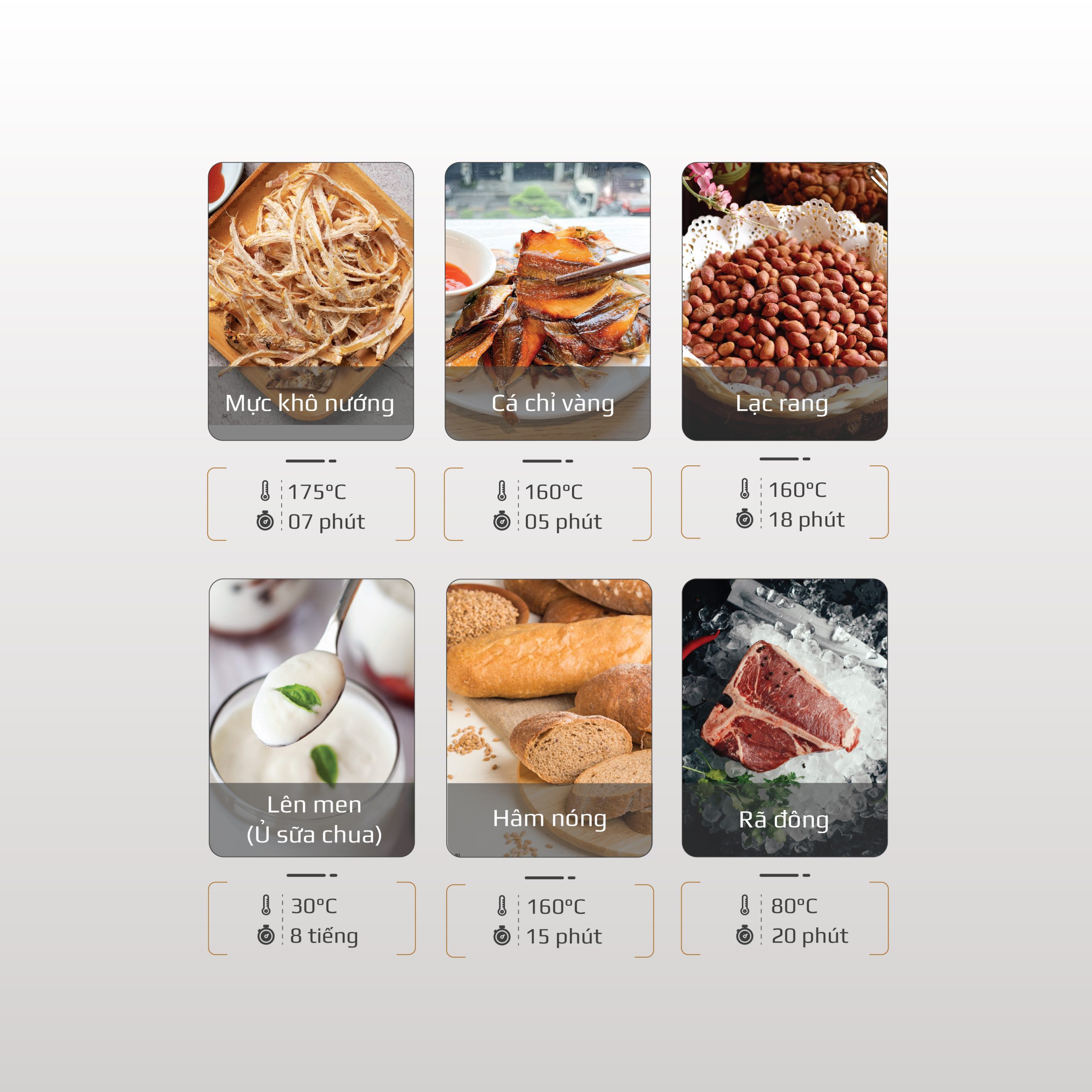 - Ngoài 13 chương trình setup trên bảng điều khiển bên ngoài, còn có menu 43 món cài đặt sẵn phù hợp với ẩm thực và phong tục chế biến món ăn của người Việt.