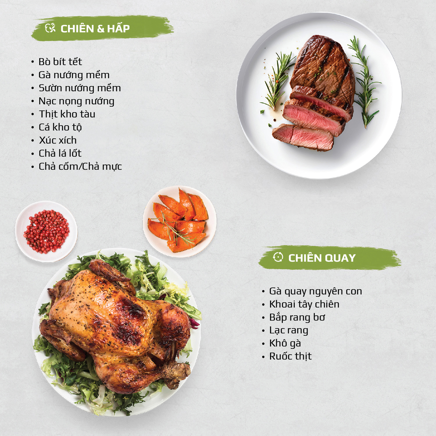 - Sử dụng nồi chiên hơi nước giúp bạn chế biến đa dạng món ngon, nấu những bữa ăn dinh dưỡng, lành mạnh, ít dầu mỡ, tiết kiệm thời gian tối đa.