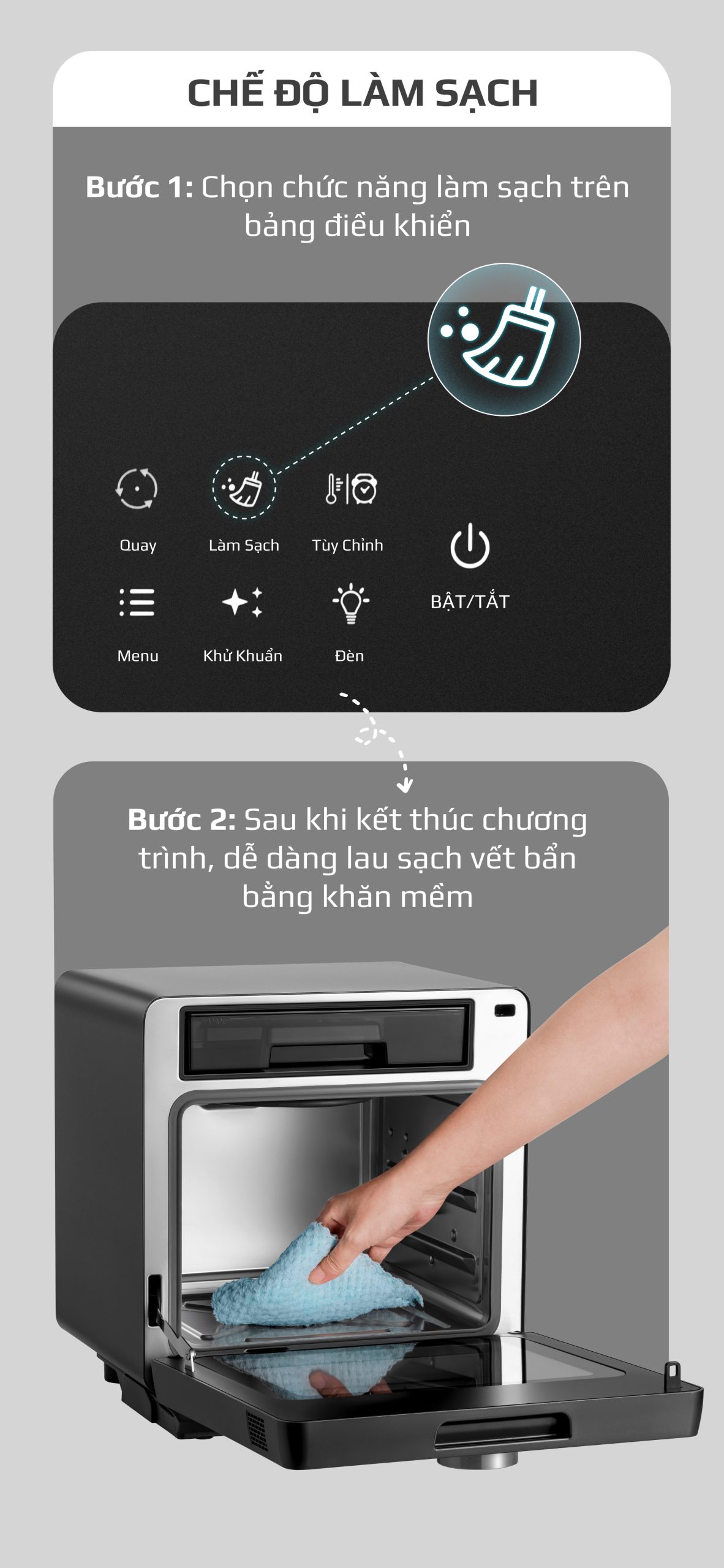 - Ngoài ra, sau khi chọn chức năng Làm Sạch có thể chọn thêm chức năng Khử Khuẩn để làm sạch sâu, loại bỏ vi khuẩn đảm bảo khoang nồi luôn sạch bong, sáng bóng.