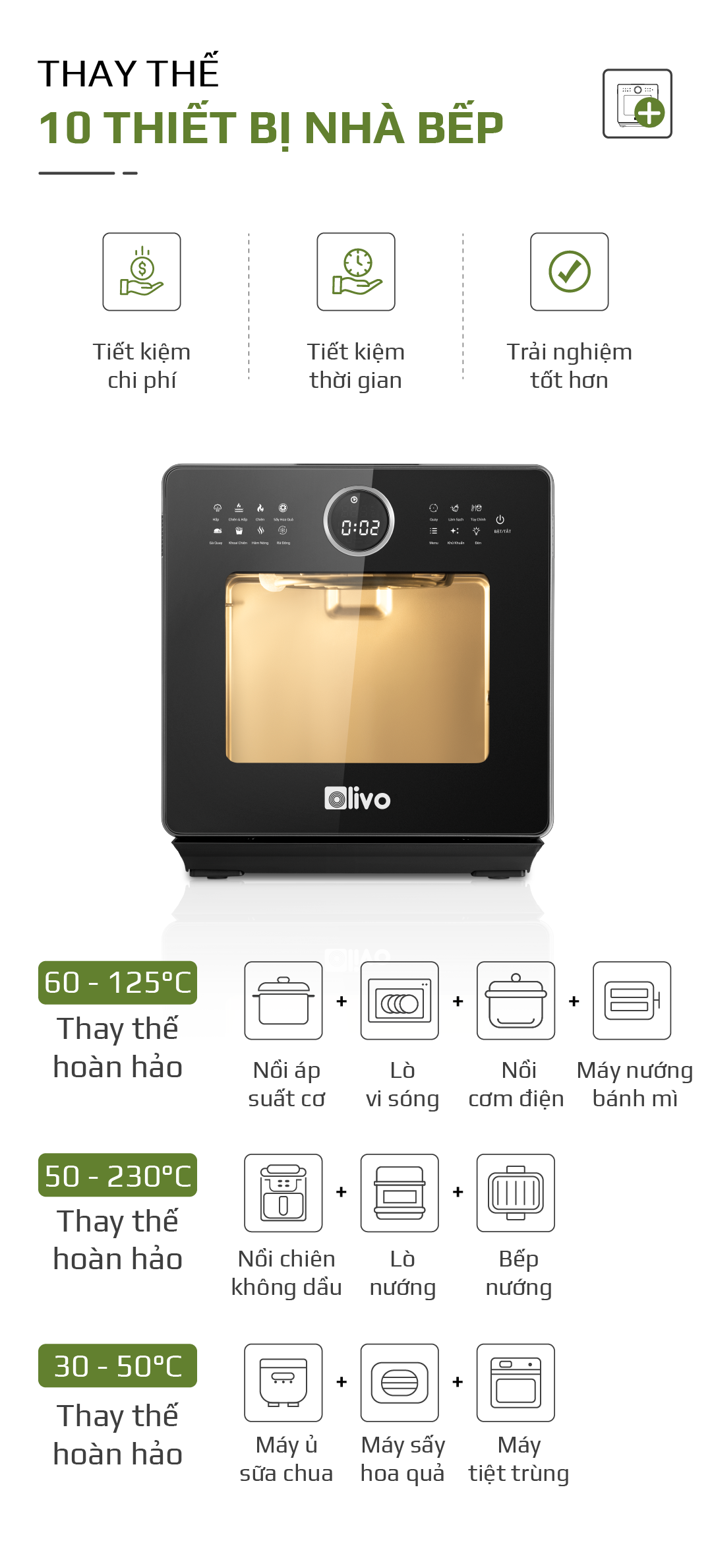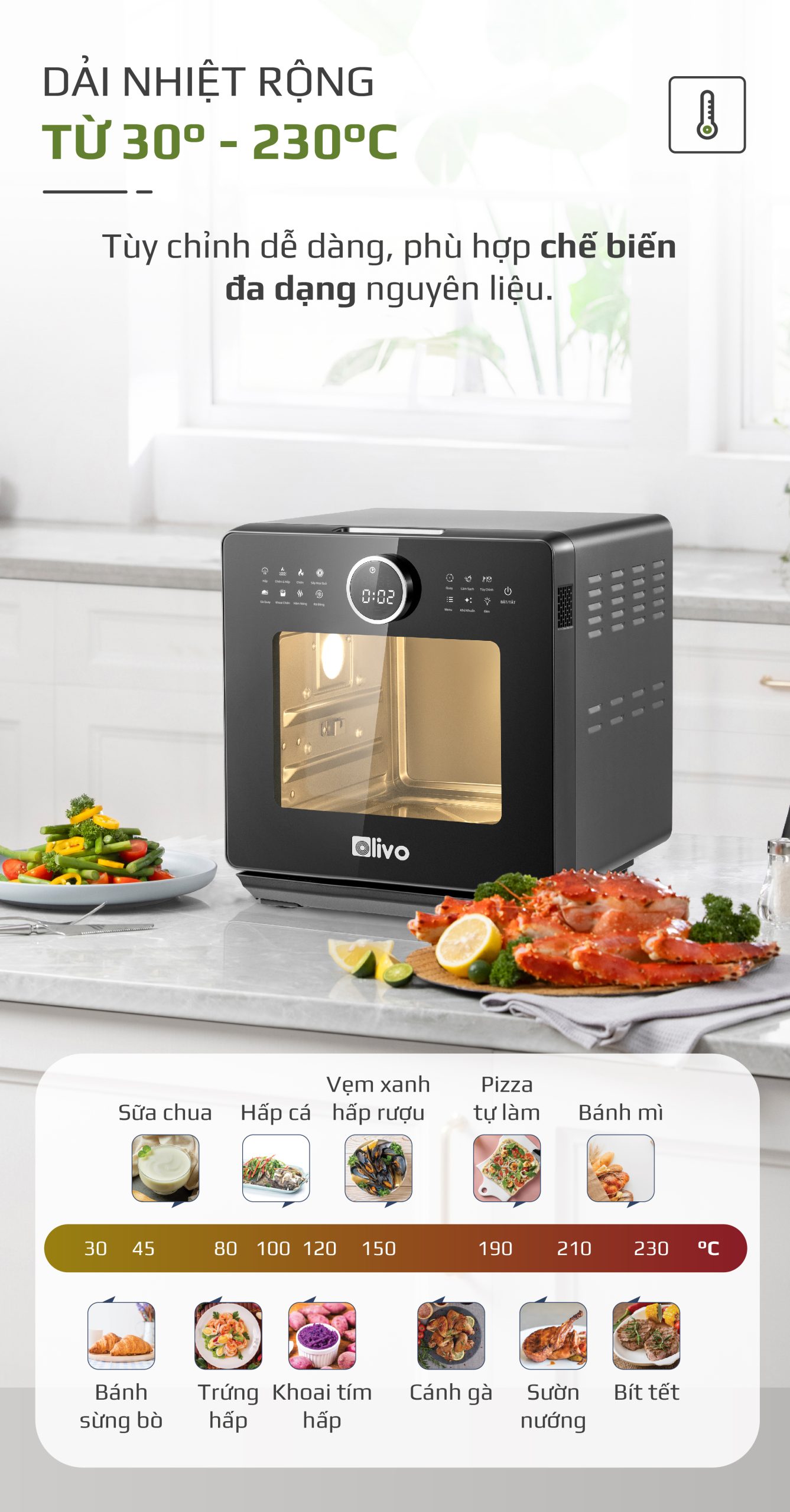 - Nồi chiên hơi nước OLIVO SF16 PRO có dải nhiệt từ 30-230 độ C, đây được coi là dải nhiệt rộng ấn tượng ở một chiếc nồi chiên. Với dải nhiệt rộng vượt trội, bạn có thể dùng nồi để chế biến nhiều món hơn như ủ sữa chua, sấy hoa quả đến quay gà, tôm, cá…