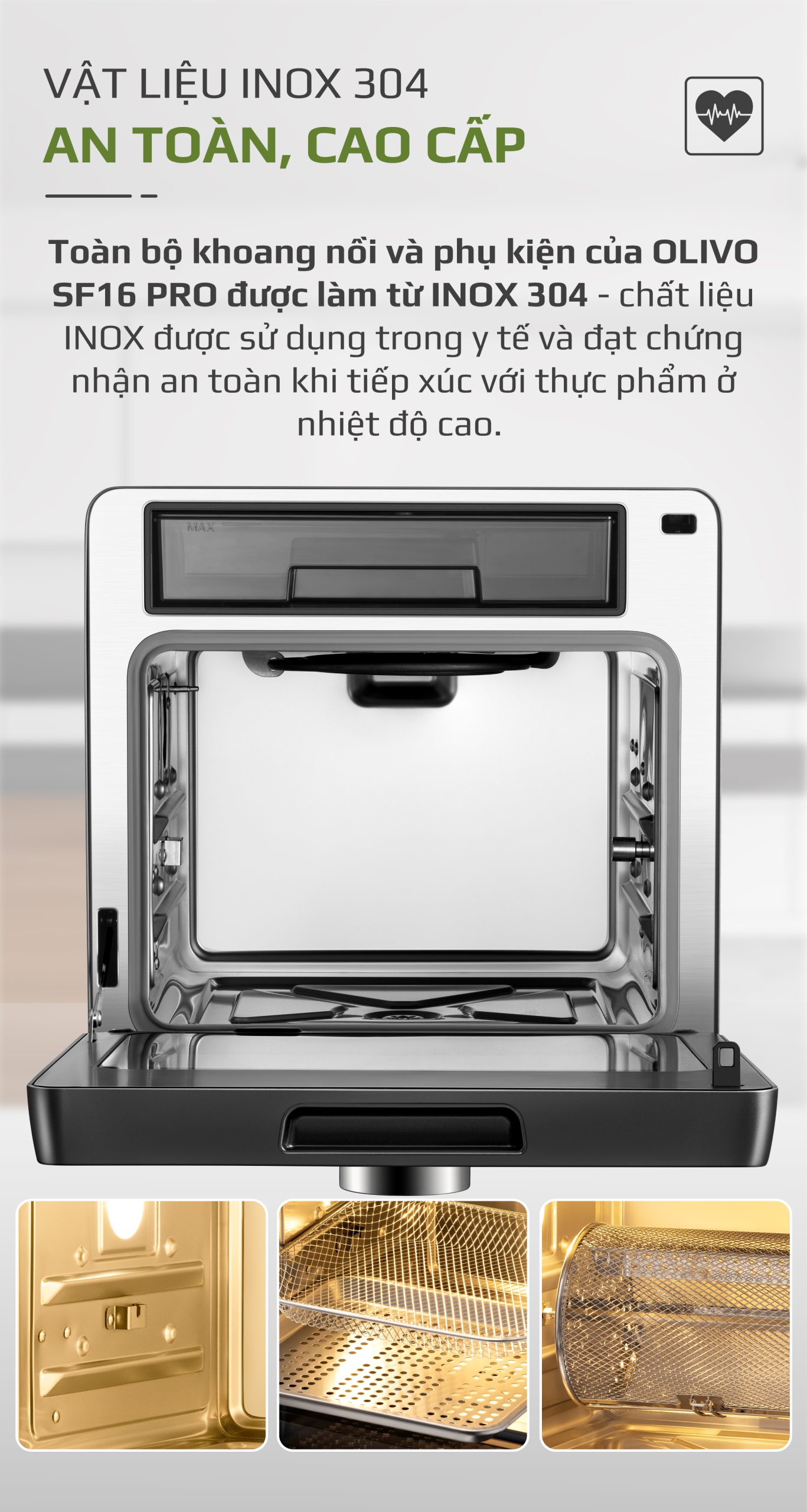 - Đặt sức khoẻ của khách hàng làm tiêu chí hàng đầu, khoang nồi của Nồi chiên hấp OLIVO SF16 PRO được làm từ INOX 304 cao cấp, an toàn với sức khỏe người dùng. Chất liệu INOX cũng cho nồi khả năng dẫn nhiệt và giữ nhiệt tốt vượt trội.