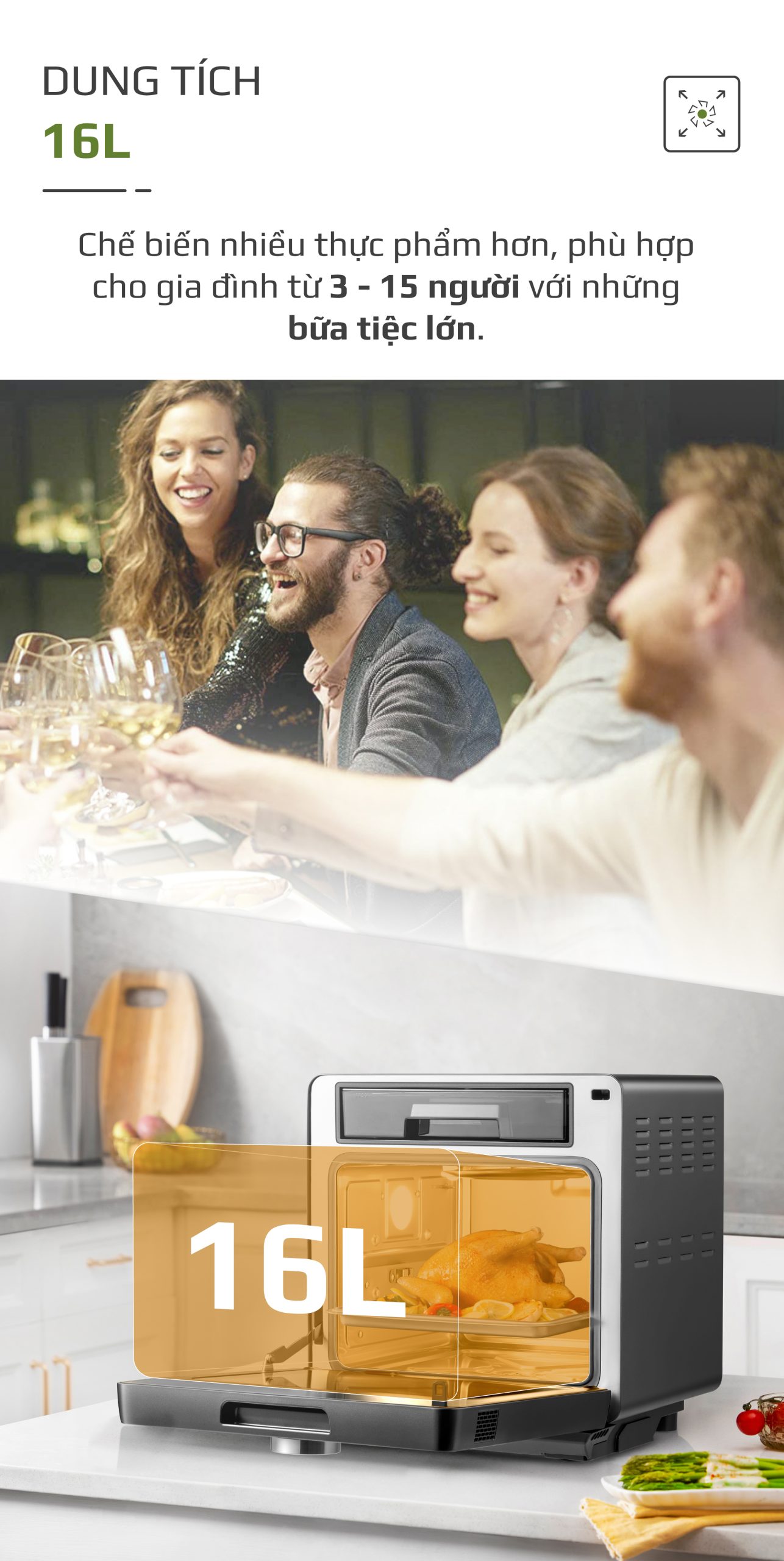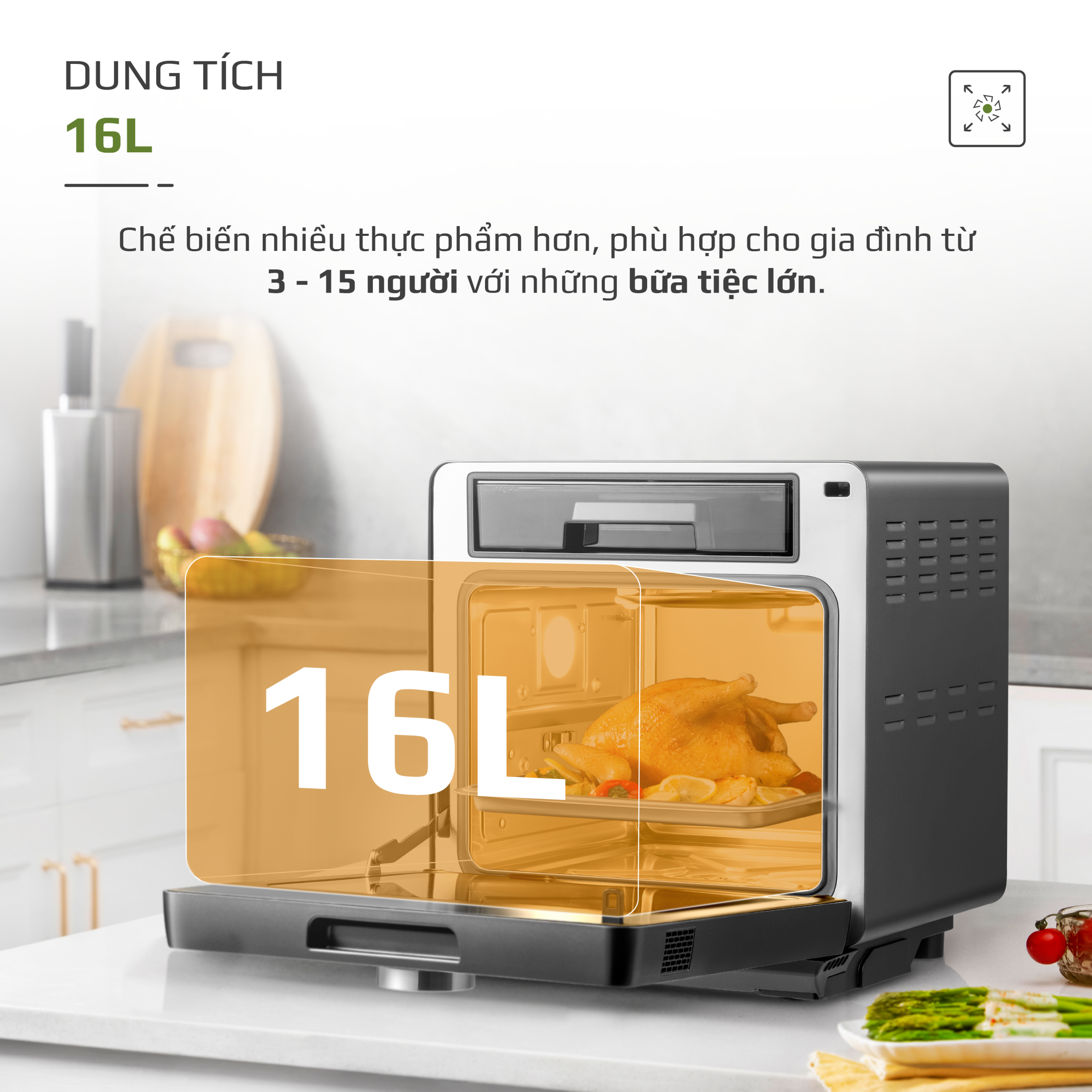 - Khoang nồi với dung tích lên đến 16 lít, bạn hoàn toàn có thể quay gà nguyên con cỡ 2-3kg. Với dung tích này, người dùng cũng có thể chế biến cùng lúc lượng lớn thực phẩm mà không cần chia nhỏ, giúp tiết kiệm thời gian, phù hợp với cả những gia đình đông người.
