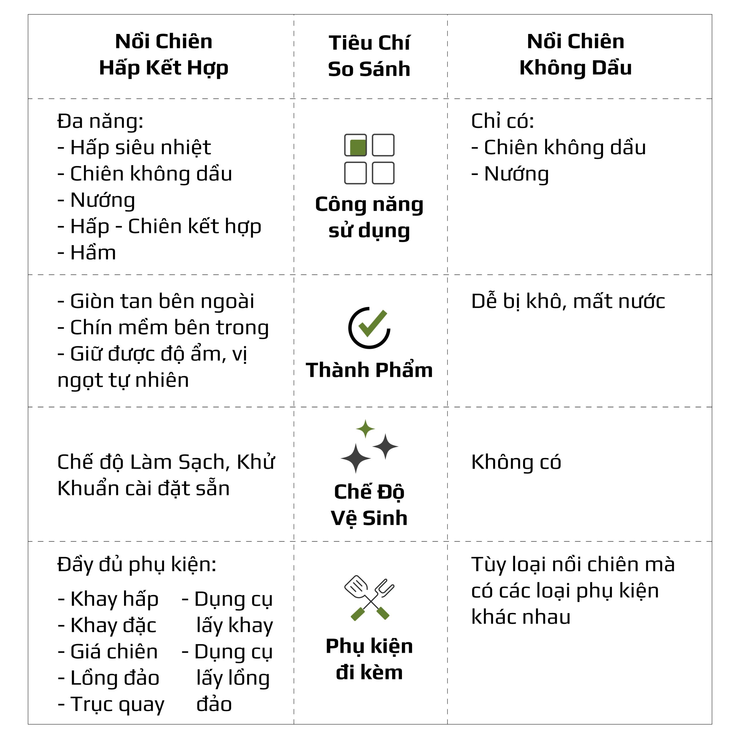 - Nồi chiên hấp là một thiết bị gia dụng thông minh, là sản phẩm đầu tiên trên thị trường tích hợp 2 giải pháp chế biến lành mạnh được ưa chuộng nhất hiện nay: Chiên Không Dầu và Hấp.