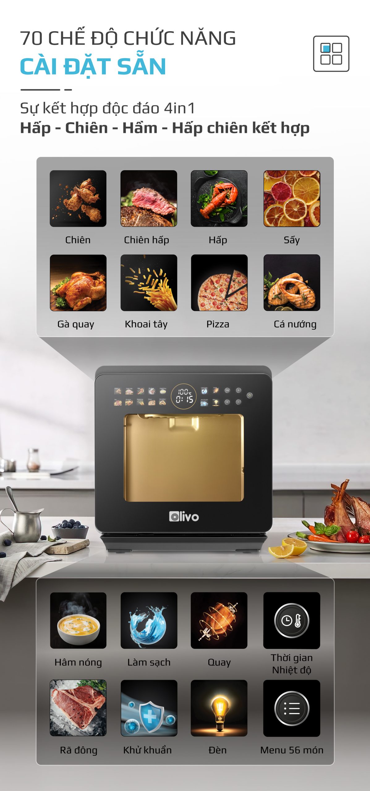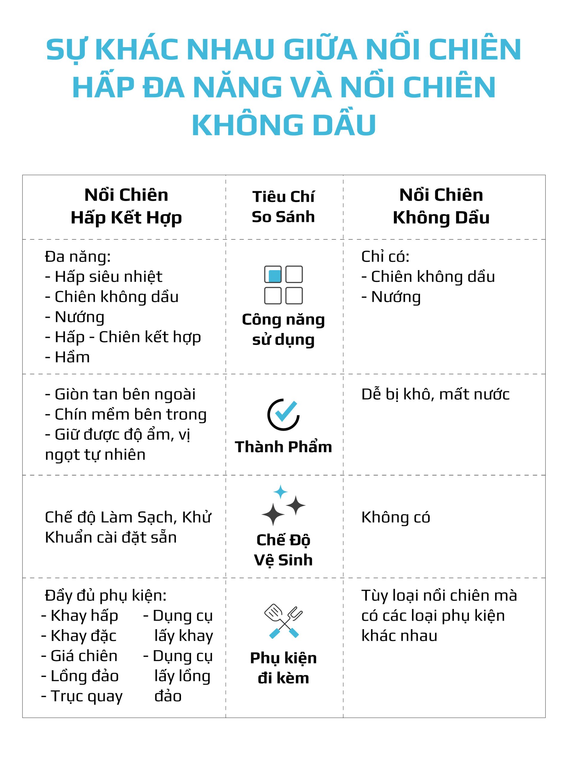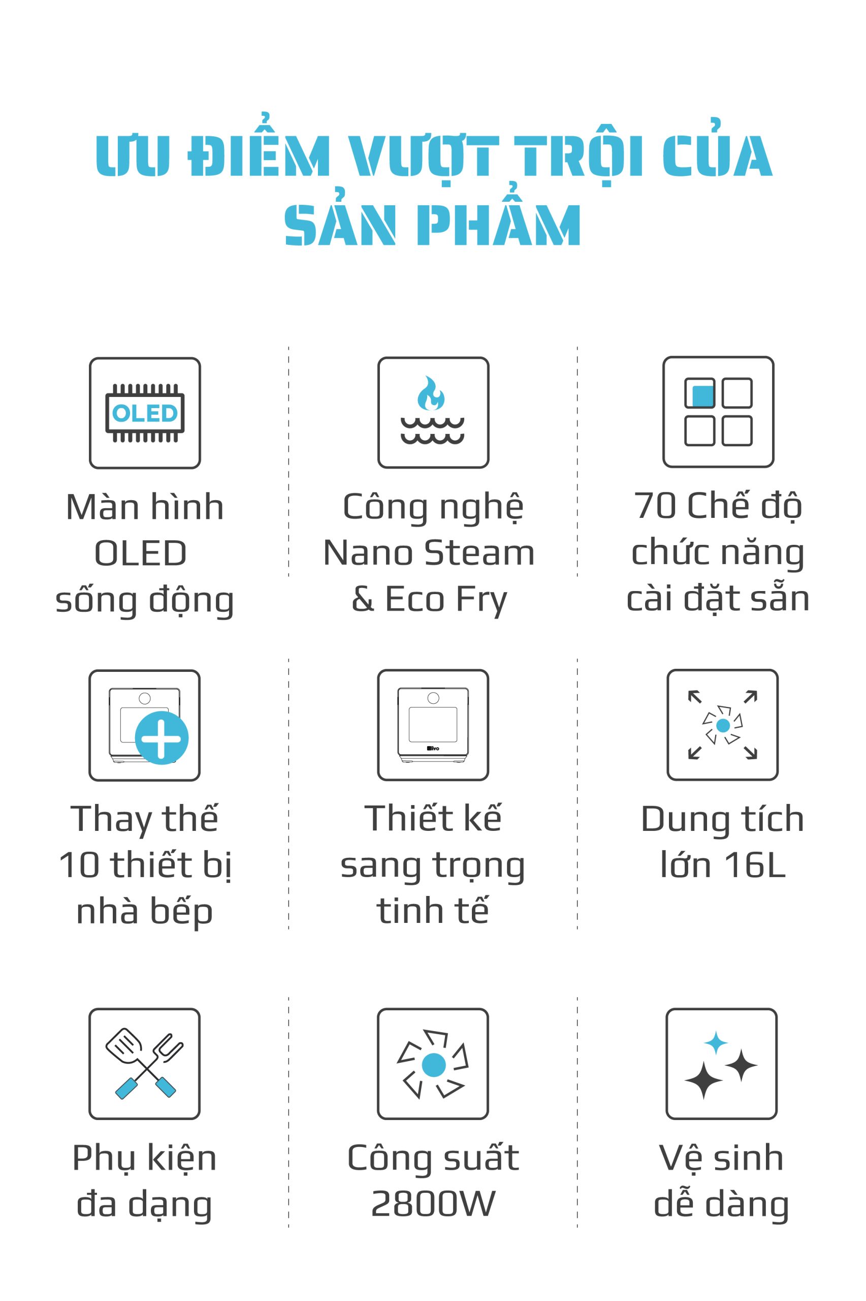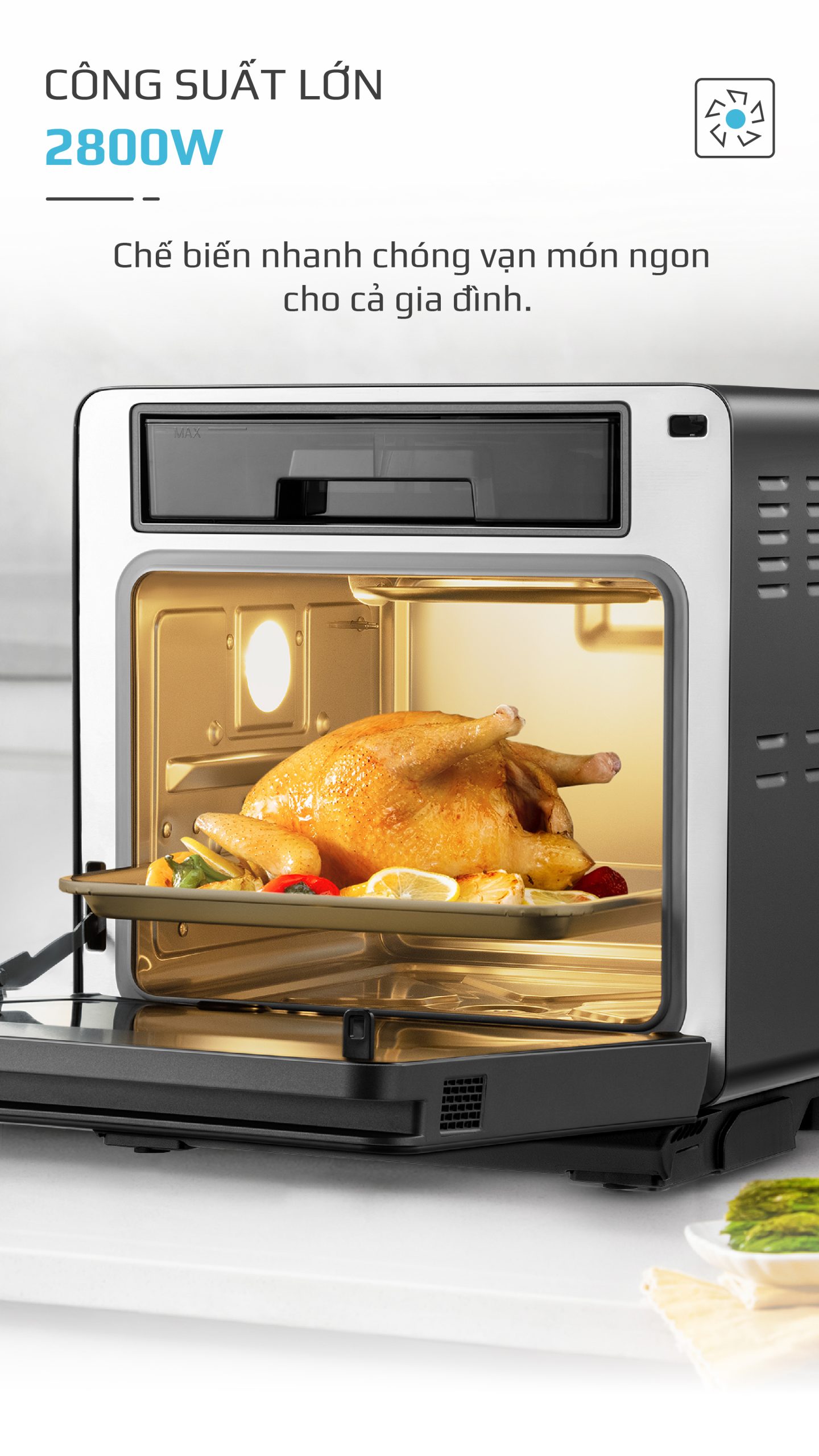 Chiên không dầu chiên đồ ăn vàng giòn mà không cần dùng đến dầu mỡ, giảm đến 95% lượng dầu mỡ dư thừa trong bữa ăn hàng ngày. Trong khi đó, hấp đồ ăn bằng hơi nước siêu nhiệt giúp giảm thời gian hấp, đồng thời bảo toàn tối đa dinh dưỡng có trong thực phẩm.