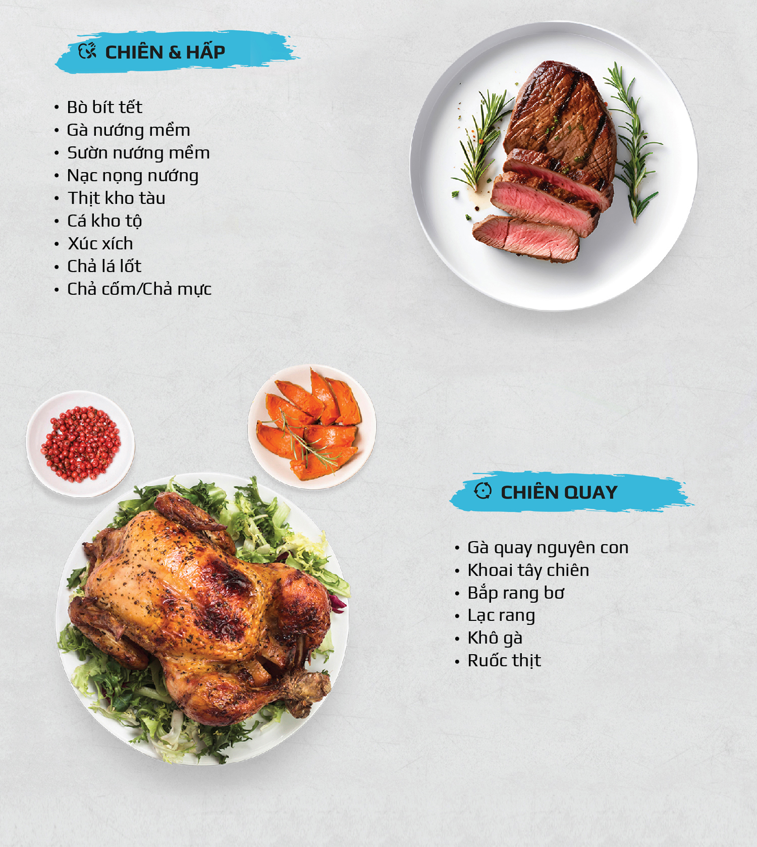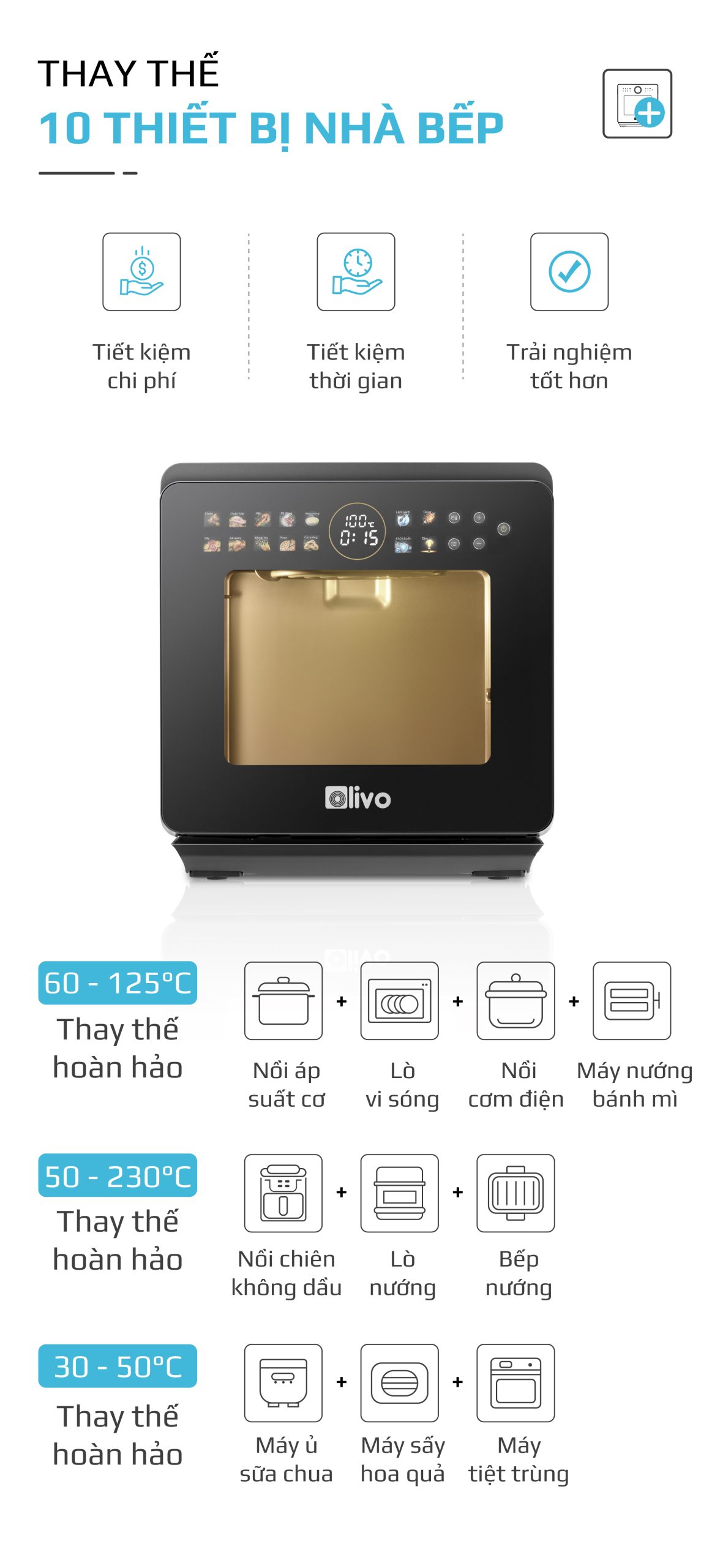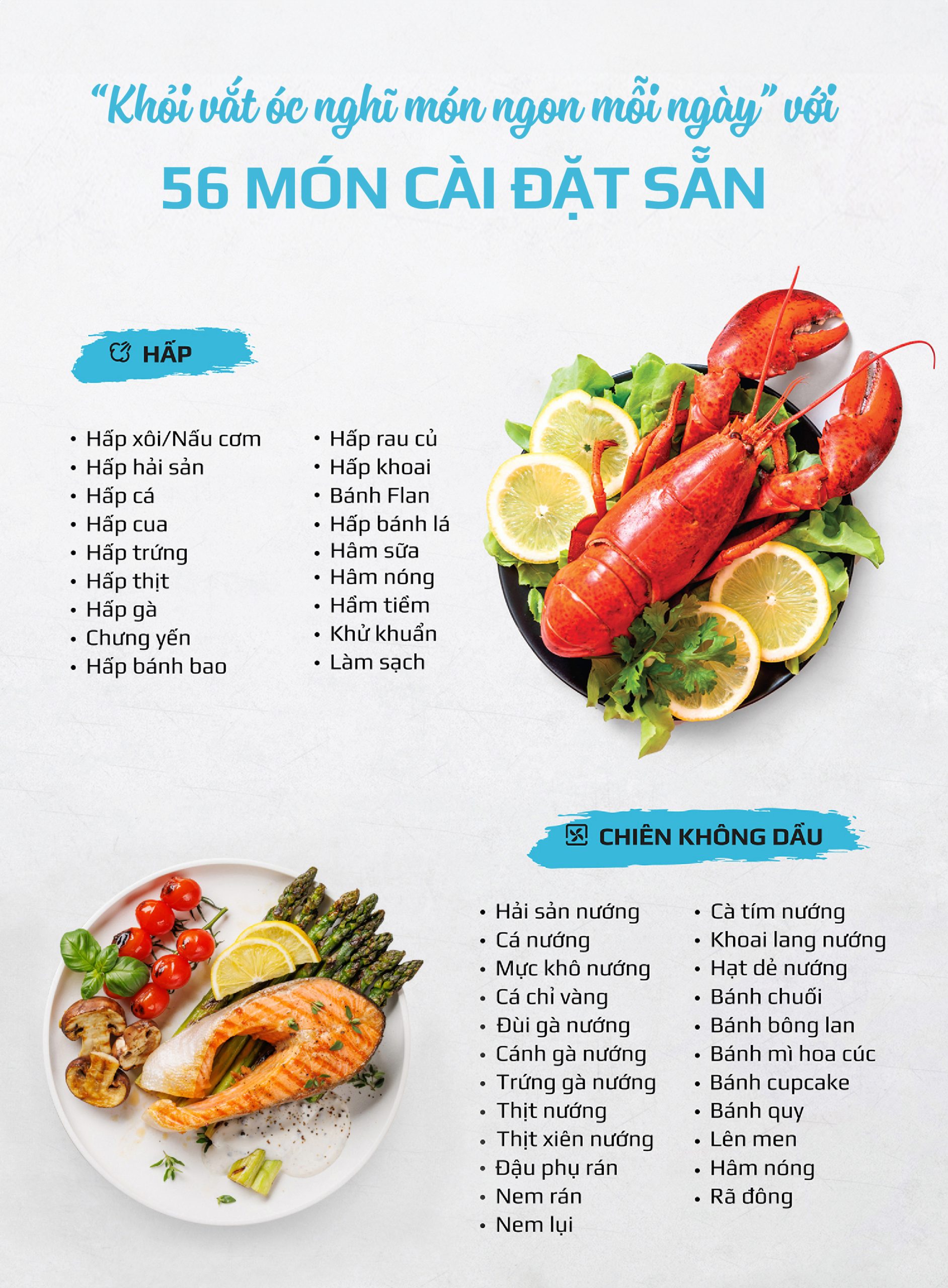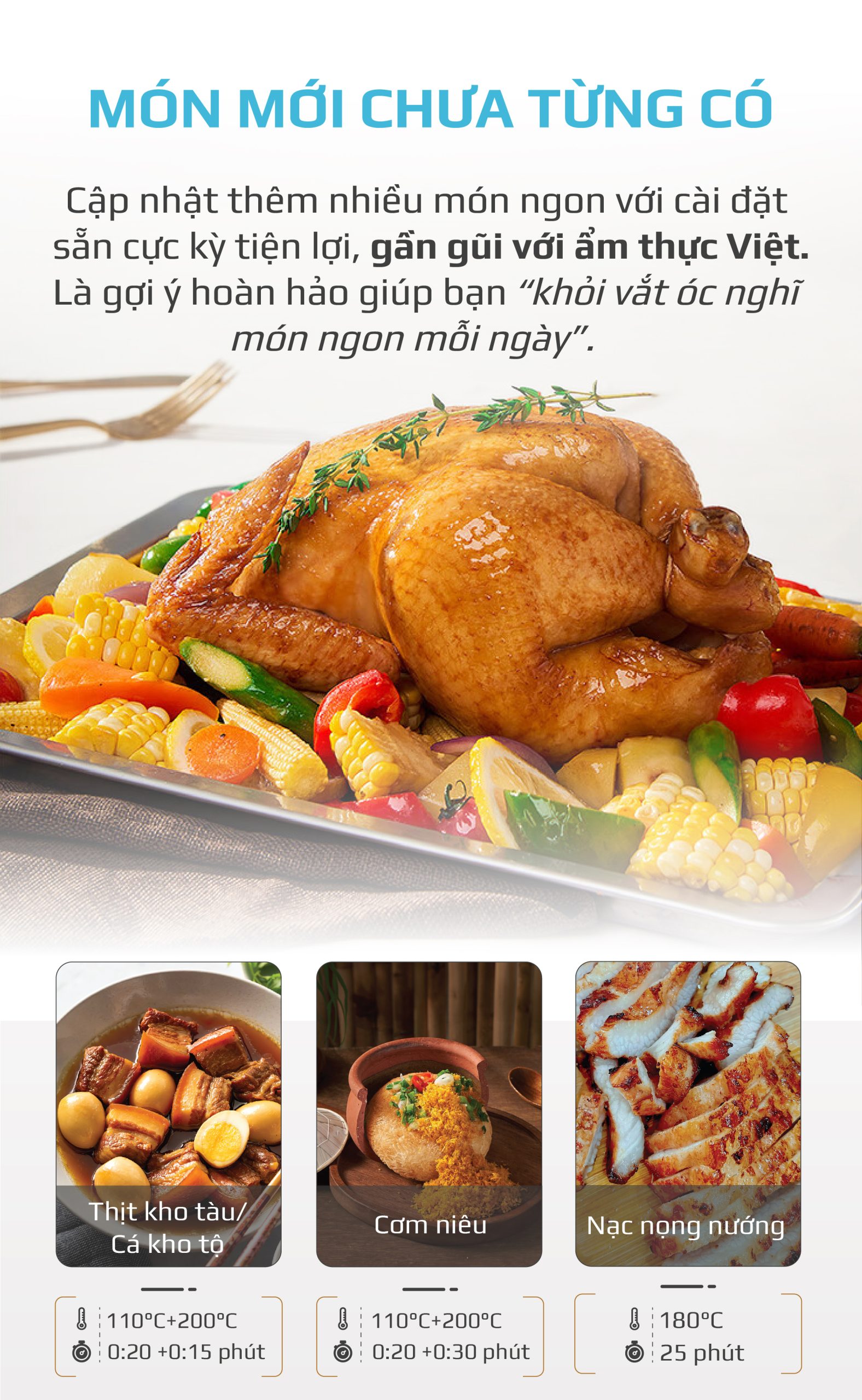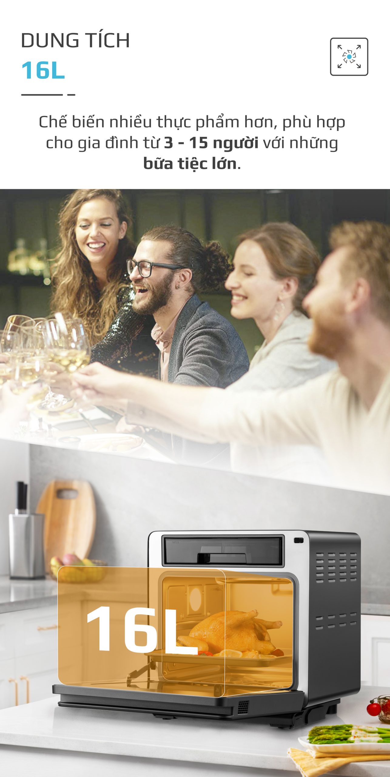 Chiên không dầu chiên đồ ăn vàng giòn mà không cần dùng đến dầu mỡ, giảm đến 95% lượng dầu mỡ dư thừa trong bữa ăn hàng ngày. Trong khi đó, hấp đồ ăn bằng hơi nước siêu nhiệt giúp giảm thời gian hấp, đồng thời bảo toàn tối đa dinh dưỡng có trong thực phẩm.