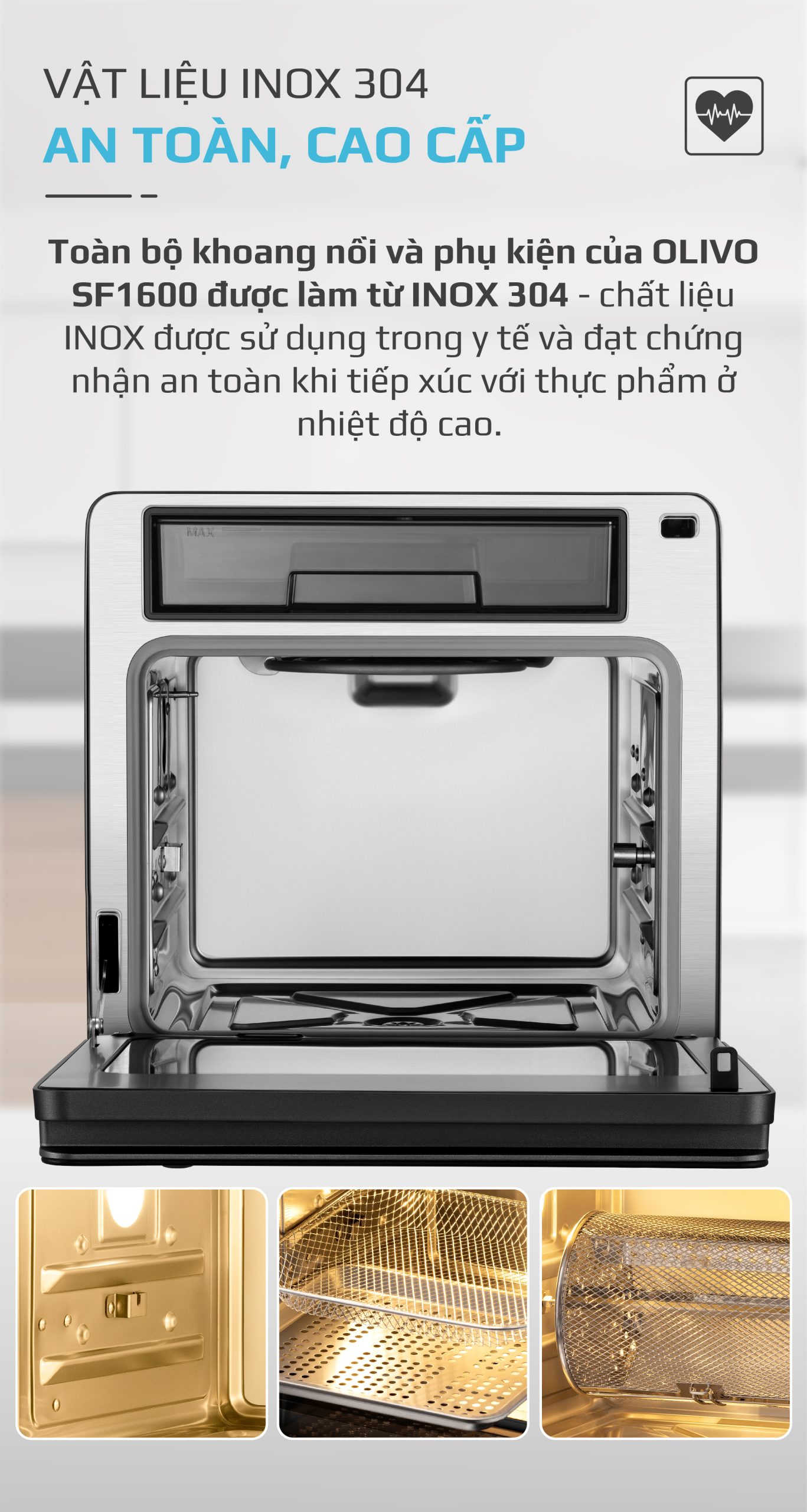 An toàn: Đặt sức khoẻ của khách hàng làm tiêu chí hàng đầu, toàn bộ khoang nồi và phụ kiện của Phiên bản đặc biệt nồi chiên hấp OLIVO SF1600 được làm từ INOX 304 cao cấp – chất liệu được sử dụng trong y tế và đạt chứng nhận an toàn khi tiếp xúc với thực phẩm ở nhiệt độ cao.