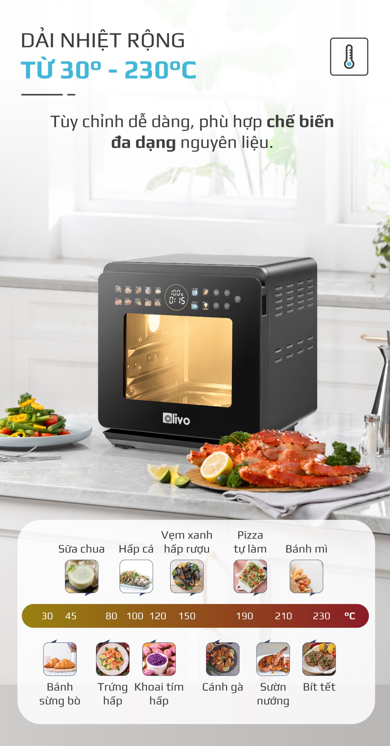 Phiên bản đặc biệt nồi chiên hấp đa năng OLIVO SF1600 có dải nhiệt từ 30-230 độ C, đây được coi là dải nhiệt rộng ấn tượng ở một chiếc nồi chiên. Với dải nhiệt rộng vượt trội, bạn có thể dùng nồi để chế biến nhiều món hơn như ủ sữa chua, sấy hoa quả đến quay gà, tôm, cá…