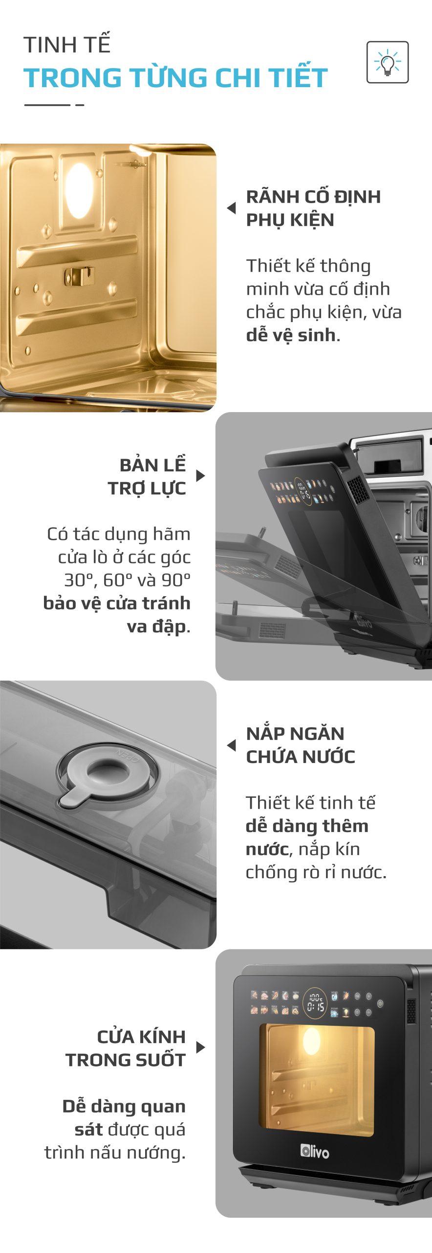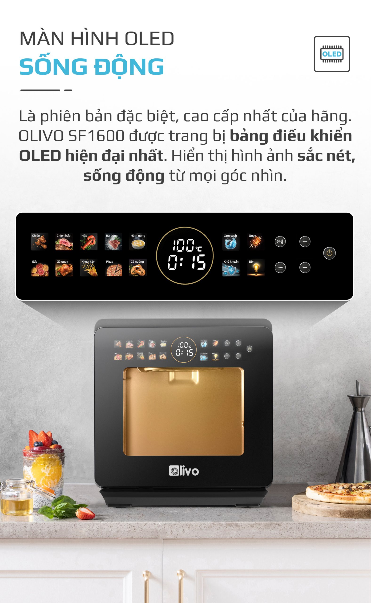 Ứng dụng công nghệ OLED trên bảng điều khiển của phiên bản đặc biệt nồi chiên hấp đa năng OLIVO SF1600 đã mang đến nhiều lợi ích cho người dùng, tạo giao diện thân thiện, nâng cao trải nghiệm sử dụng, tối ưu hóa hiệu năng của sản phẩm.