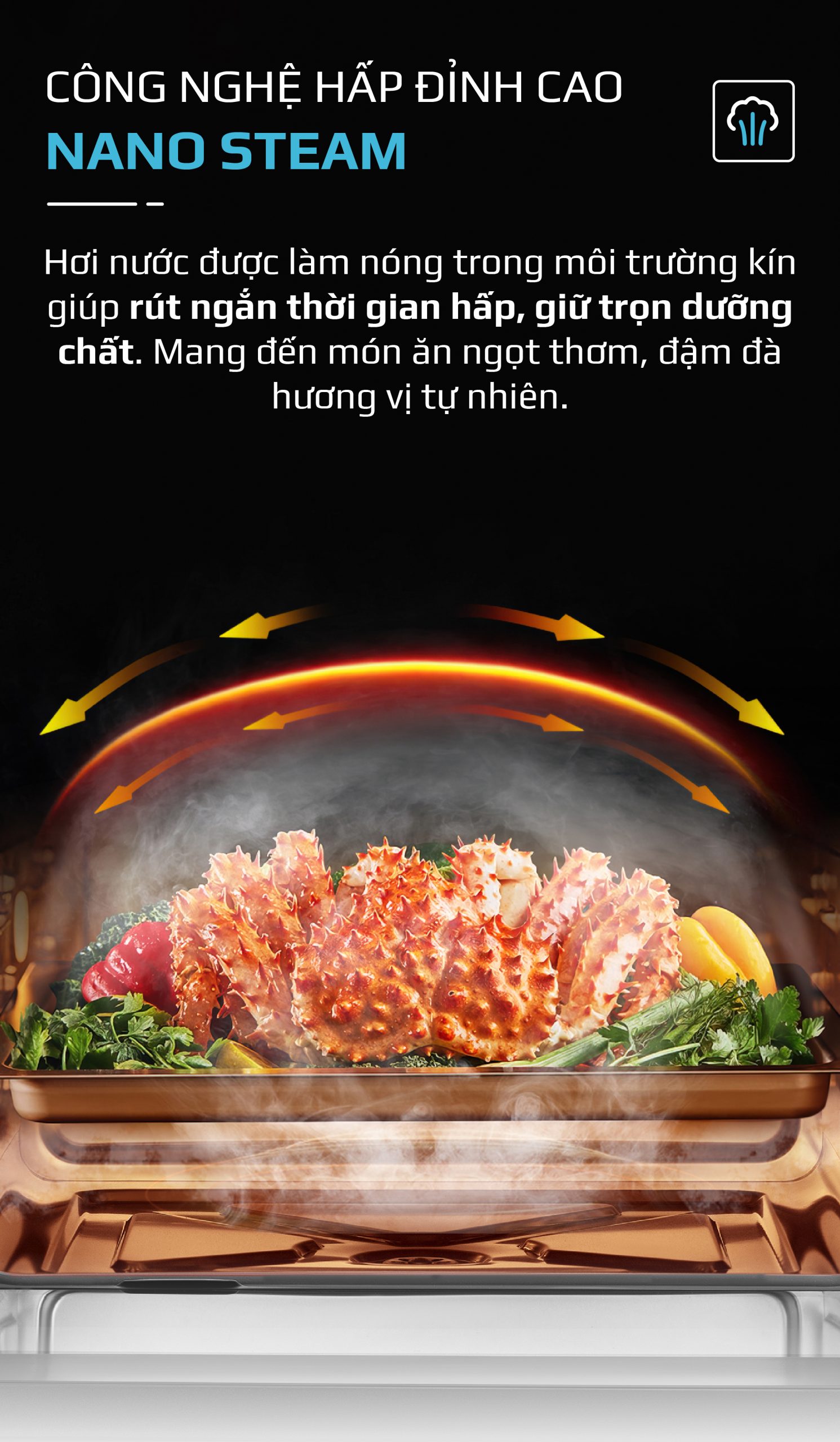 Giữ trọn hương vị và dinh dưỡng: Hơi nước nano thẩm thấu nhanh và đều, giúp thực phẩm chín đều bên trong mà không bị khô, giữ lại được tối đa vitamin, khoáng chất và các dưỡng chất khác.