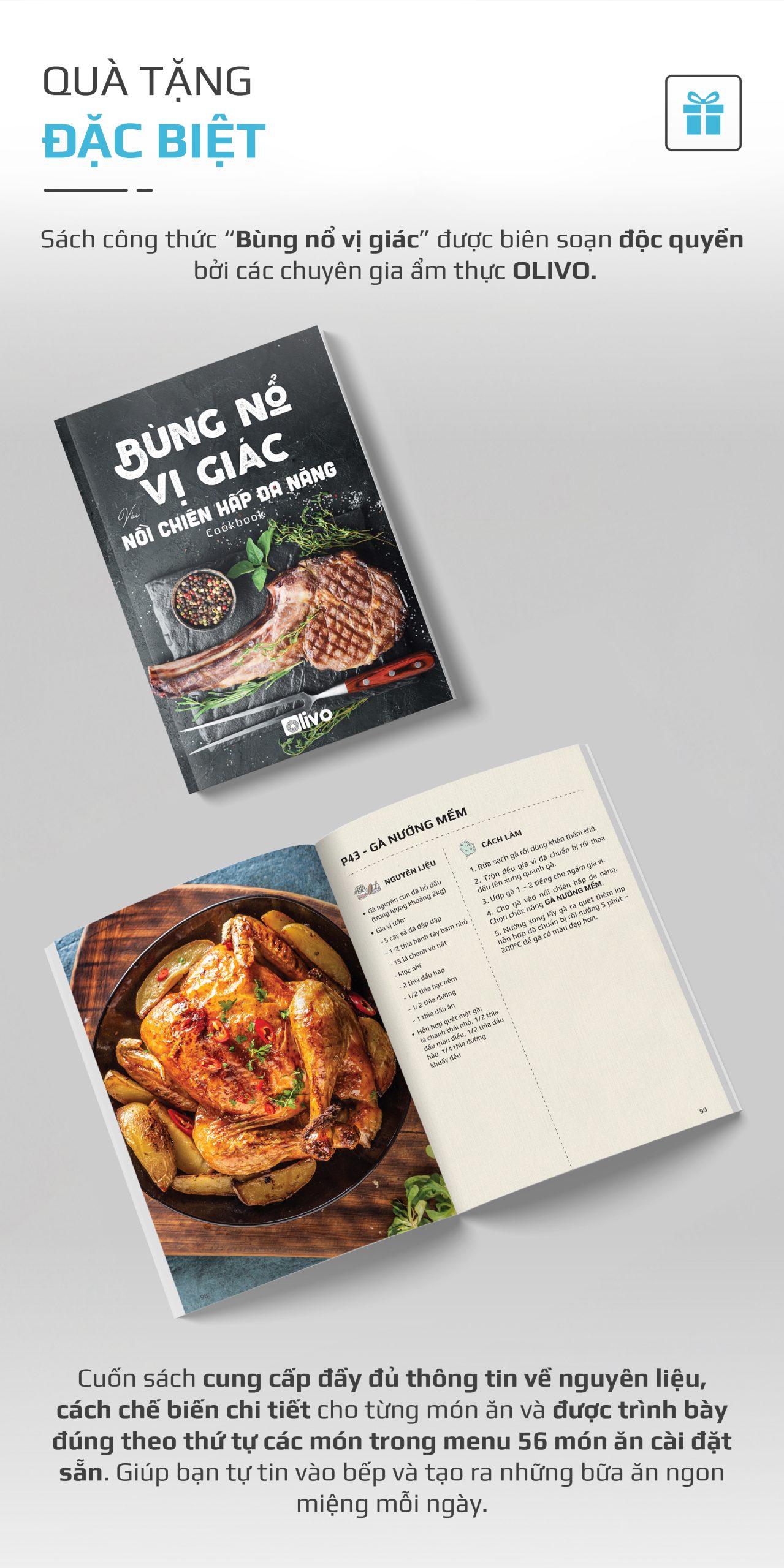 - Khám phá thế giới ẩm thực đa dạng với cuốn sách công thức “Bùng nổ vị giác”, được biên soạn tỉ mỉ bởi các chuyên gia ẩm thực OLIVO. Với 56 công thức được sắp xếp khoa học theo đúng trình tự 56 món ăn trong menu bảng điều khiển.