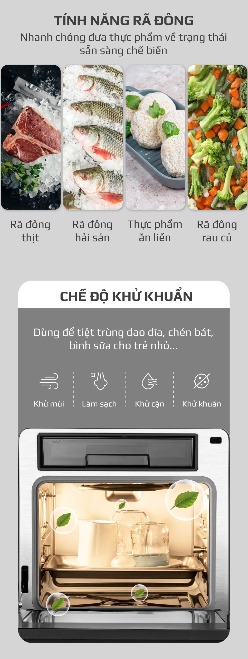 An toàn vệ sinh: Hơi nước nano có khả năng tiêu diệt vi khuẩn, giúp thực phẩm luôn sạch sẽ và an toàn.