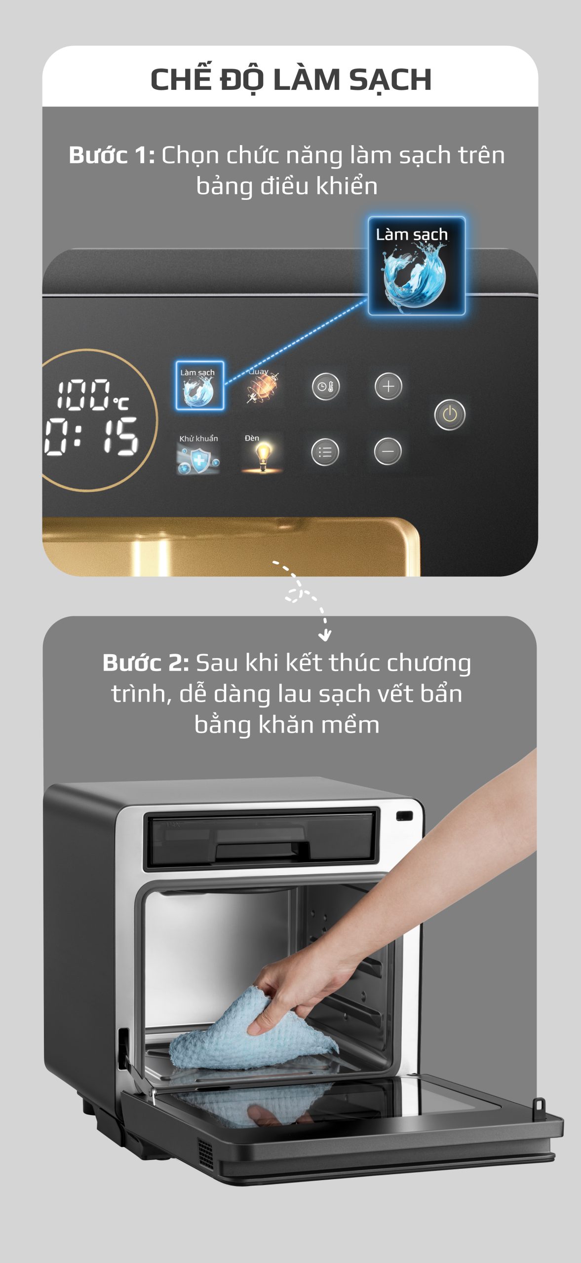 Ngoài ra, sau khi chọn chức năng Làm Sạch có thể chọn thêm chức năng Khử Khuẩn để làm sạch sâu, loại bỏ vi khuẩn đảm bảo khoang nồi luôn sạch bong, sáng bóng.