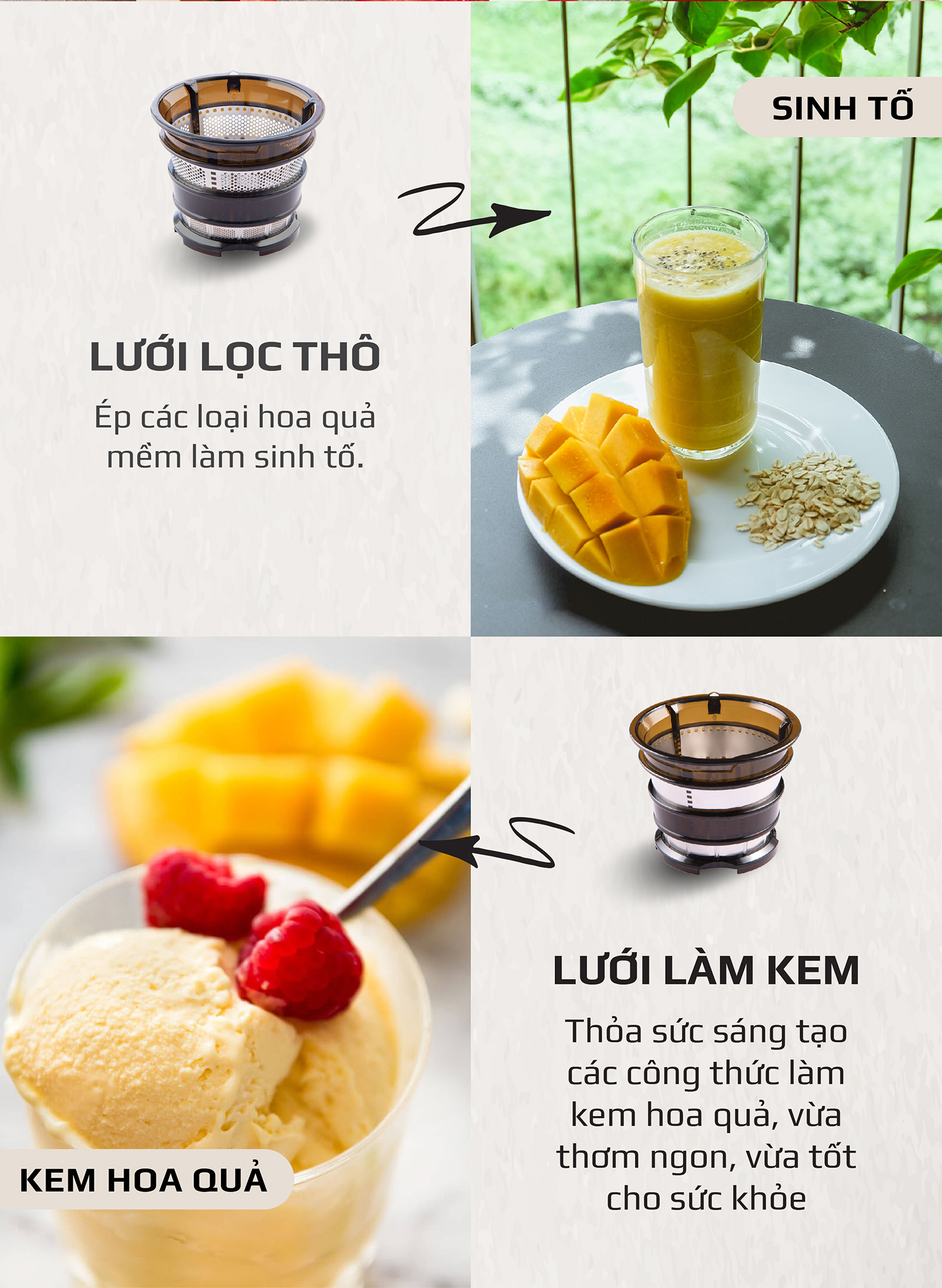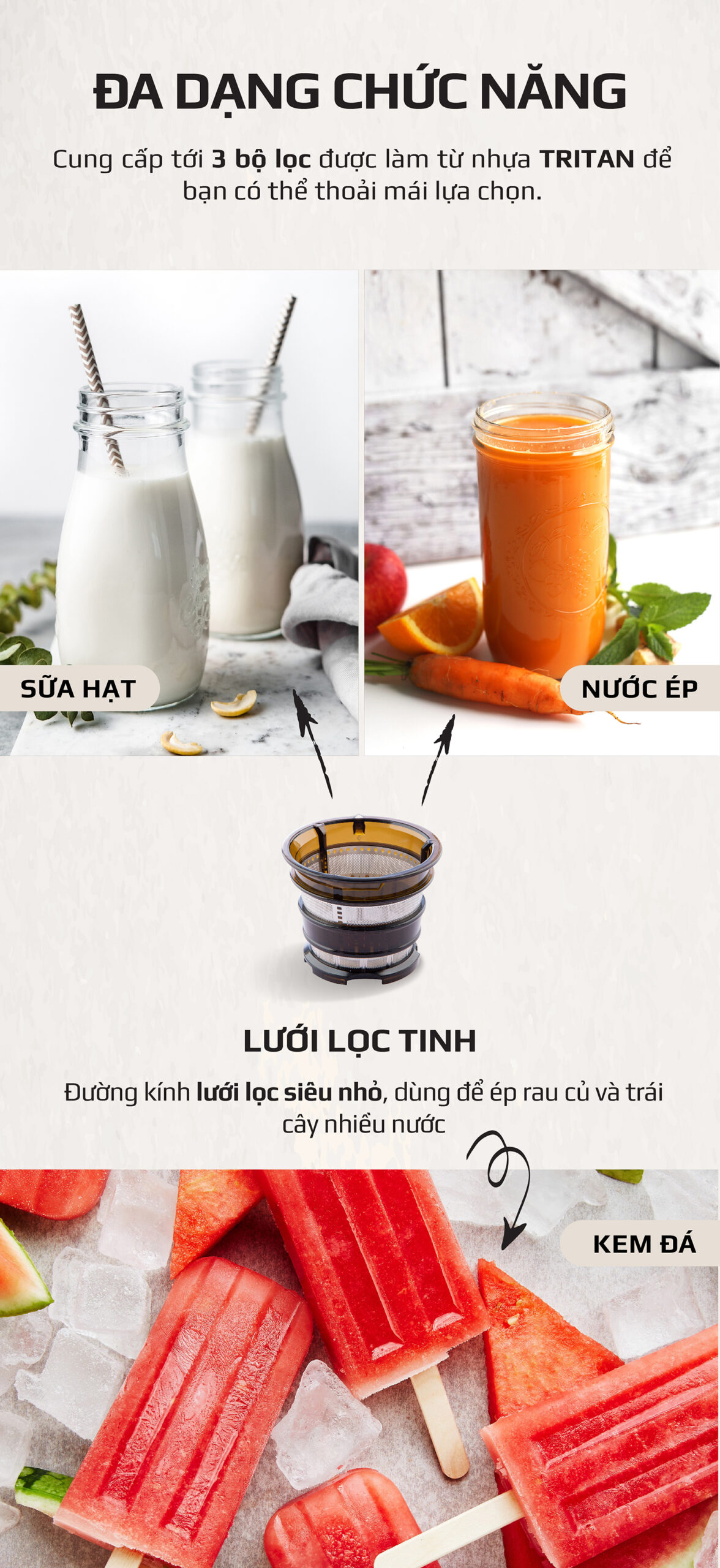 - Bộ lọc mịn và lọc thô cho phép bạn tạo độ đồng nhất của nước trái cây với mức độ chất xơ phù hợp với bạn.